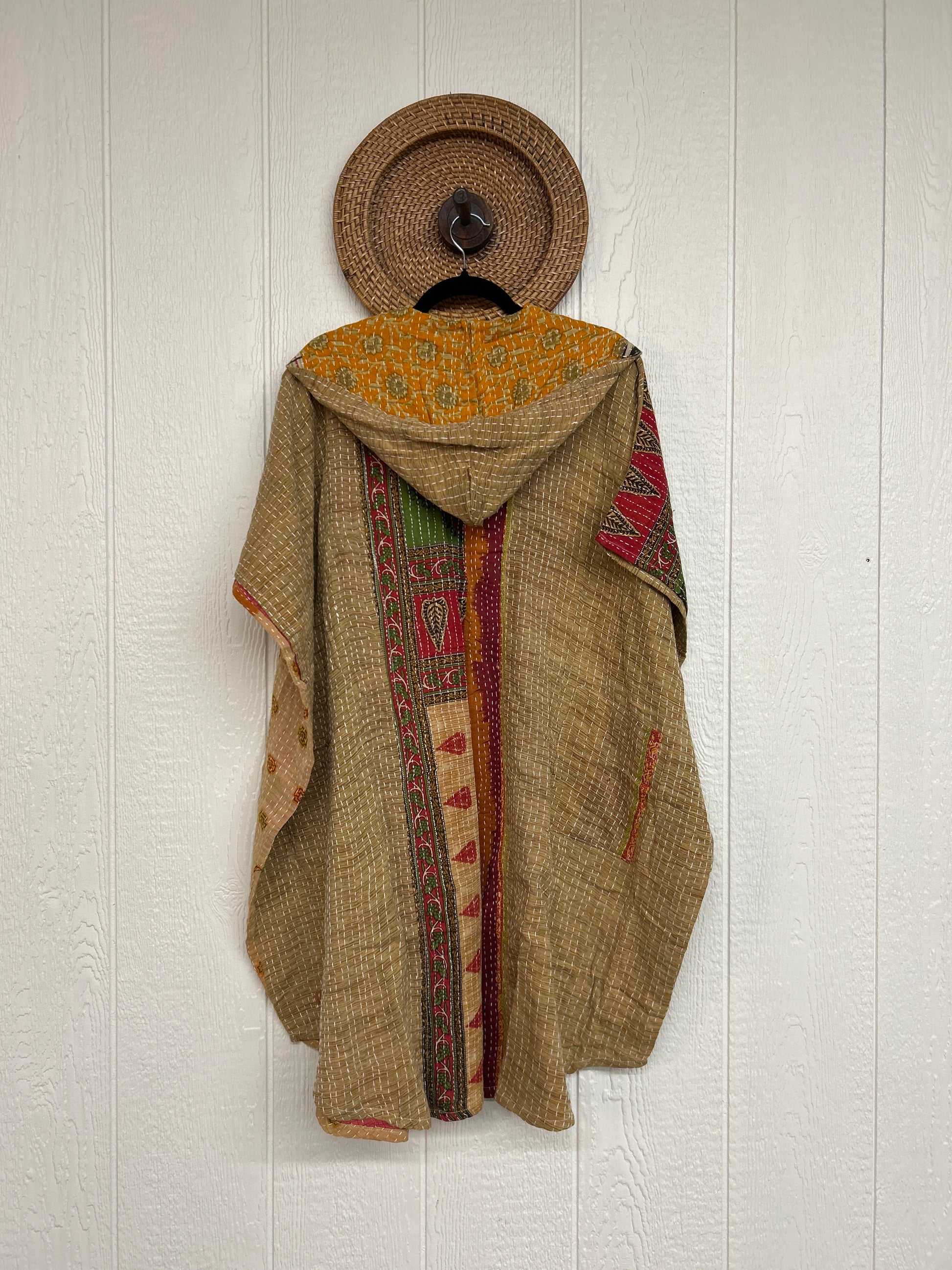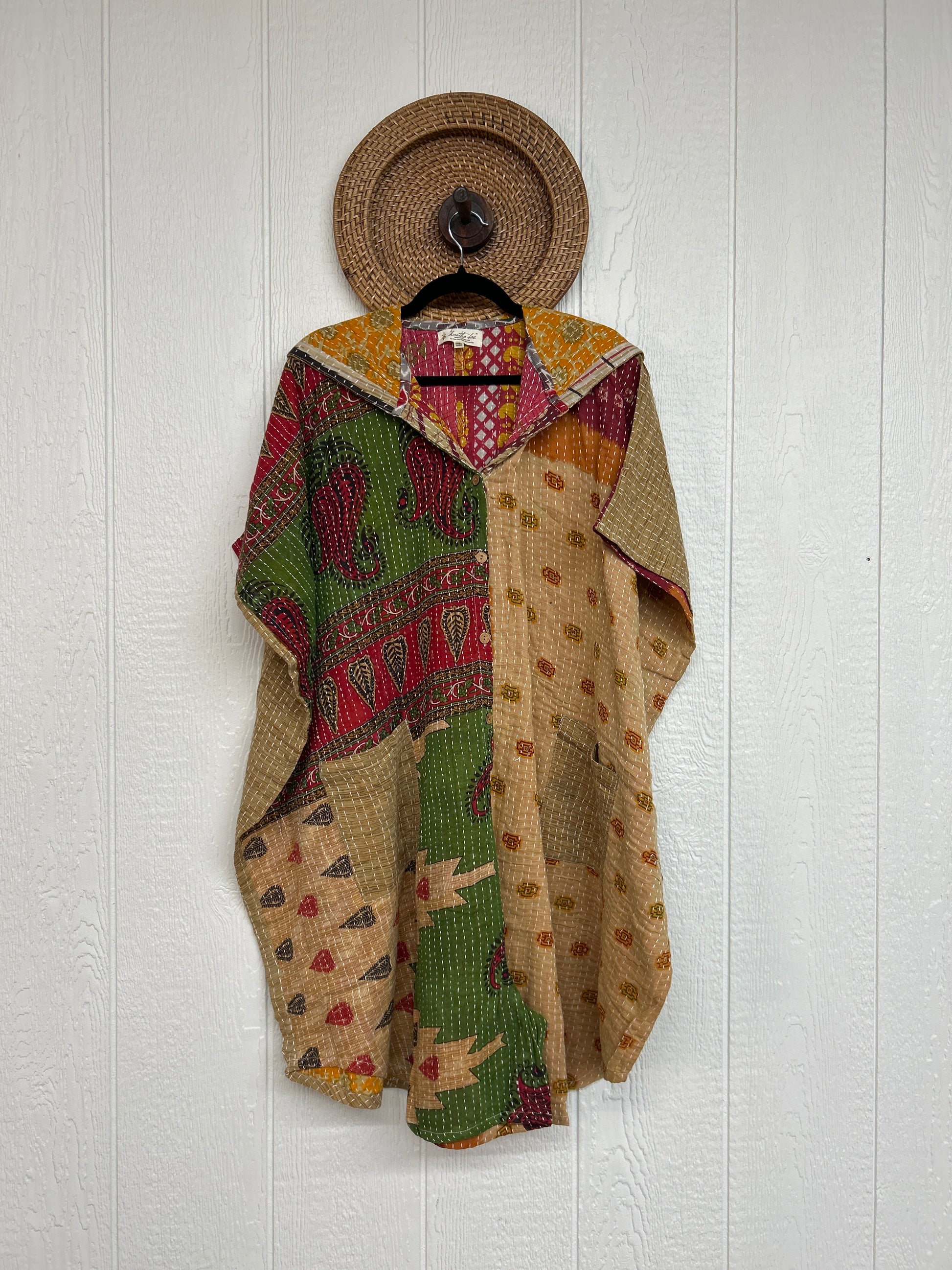 Made from our hand Kantha stitched cotton sari, this one piece wonder features a hood, front button-down closure, pockets, and super flowy shorts. Size Recommended 00-20/22. Crafted and sewn by families in a small village in Northern India, providing work and a fair living.