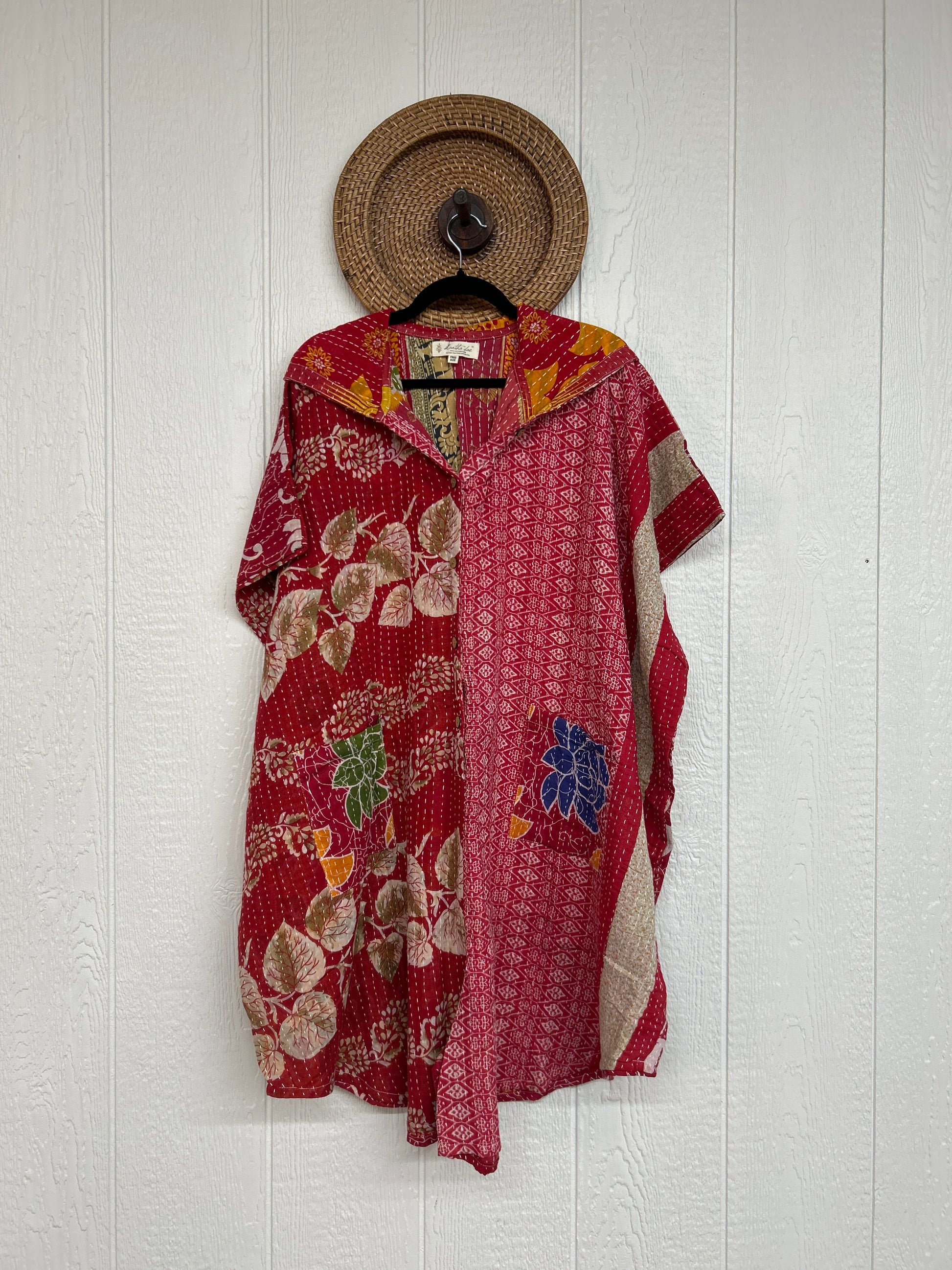 Made from our hand Kantha stitched cotton sari, this one piece wonder features a hood, front button-down closure, pockets, and super flowy shorts. Size Recommended 00-20/22. Crafted and sewn by families in a small village in Northern India, providing work and a fair living.