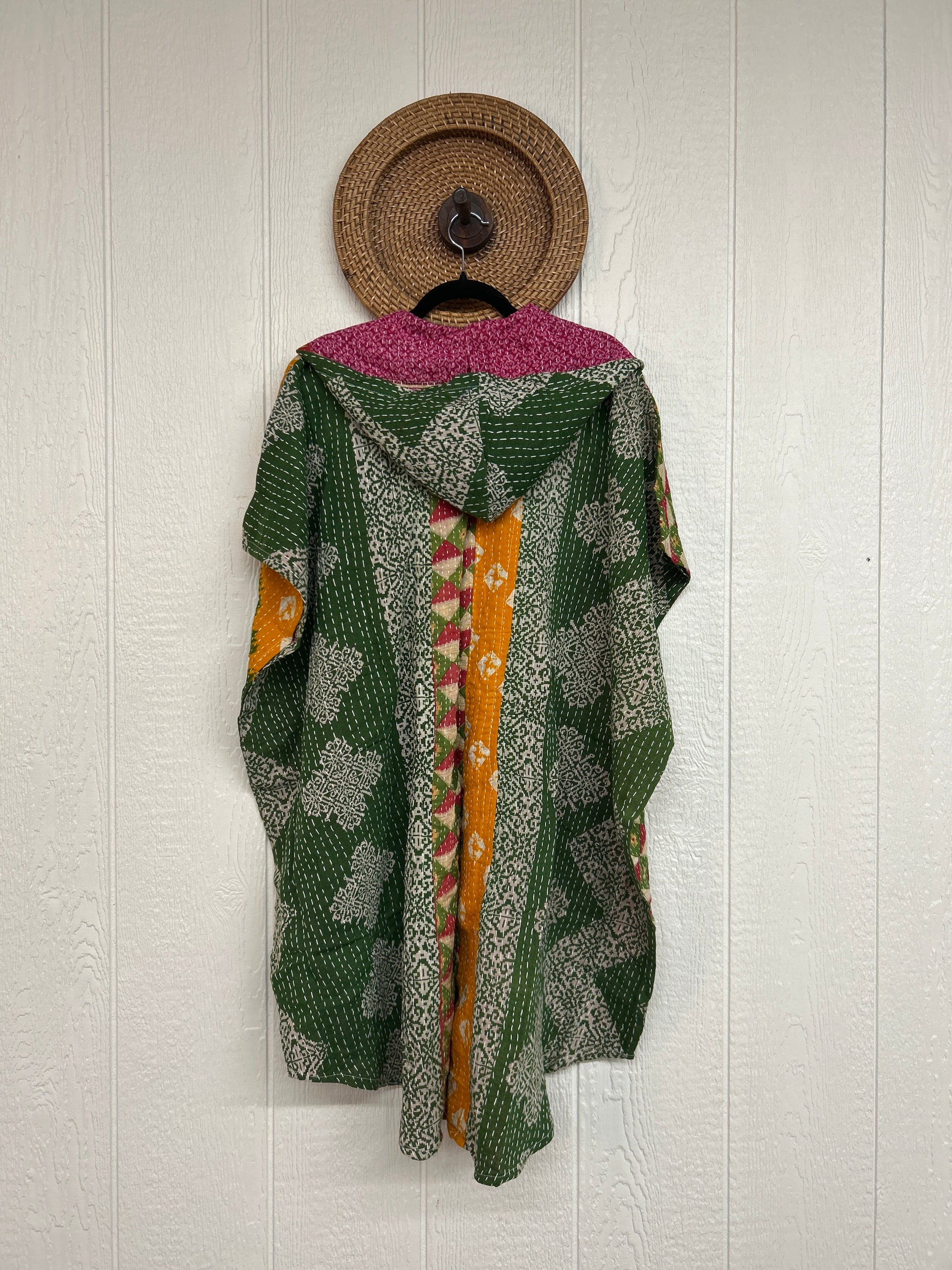 Made from our hand Kantha stitched cotton sari, this one piece wonder features a hood, front button-down closure, pockets, and super flowy shorts. Size Recommended 00-20/22. Crafted and sewn by families in a small village in Northern India, providing work and a fair living.