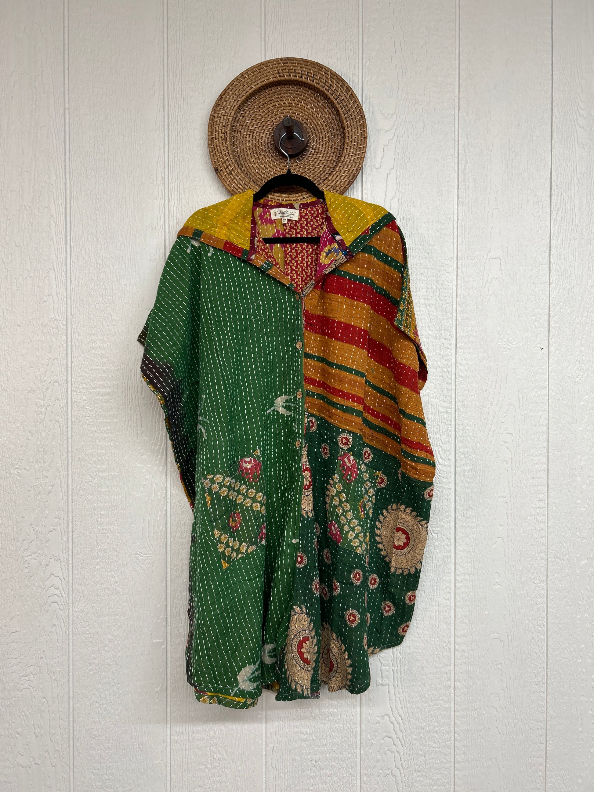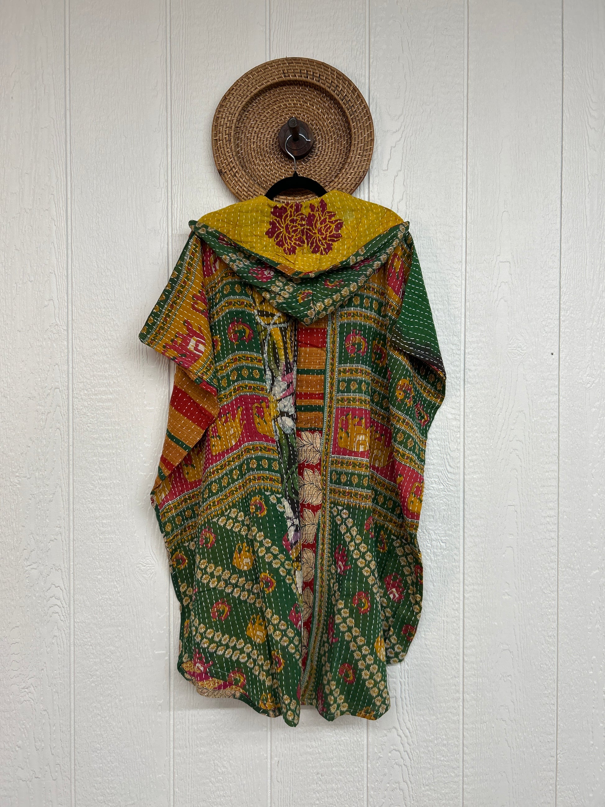 Made from our hand Kantha stitched cotton sari, this one piece wonder features a hood, front button-down closure, pockets, and super flowy shorts. Size Recommended 00-20/22. Crafted and sewn by families in a small village in Northern India, providing work and a fair living.