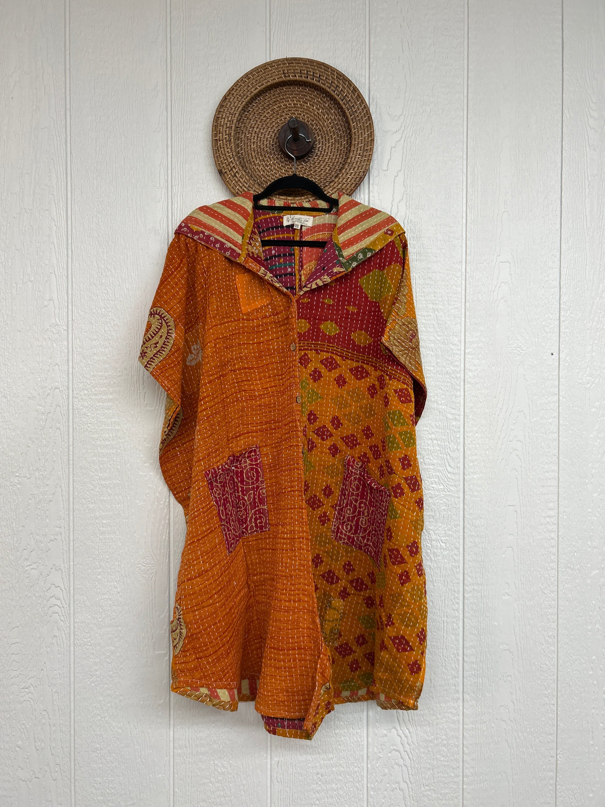 Made from our hand Kantha stitched cotton sari, this one piece wonder features a hood, front button-down closure, pockets, and super flowy shorts. Size Recommended 00-20/22. Crafted and sewn by families in a small village in Northern India, providing work and a fair living.