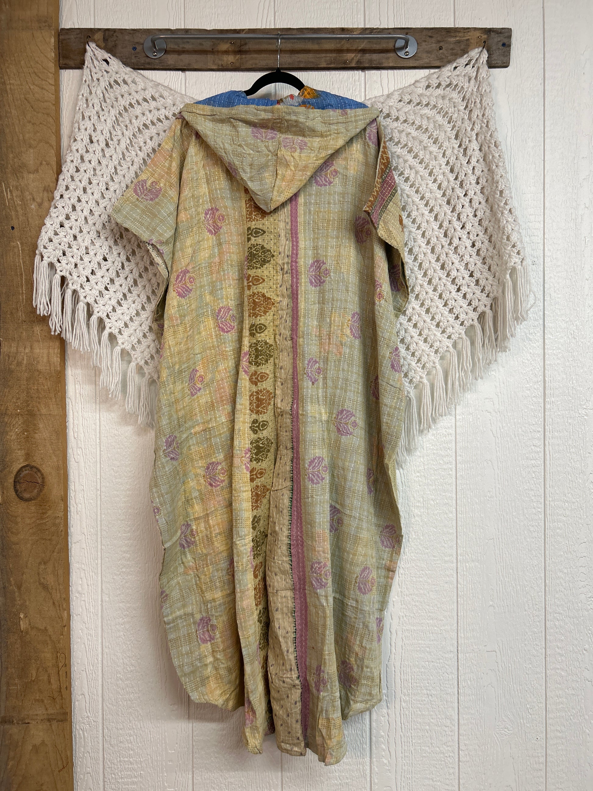 Made from our hand Kantha stitched cotton sari, this one piece wonder features a hood, front button-down closure, pockets, and super flowy pant legs..