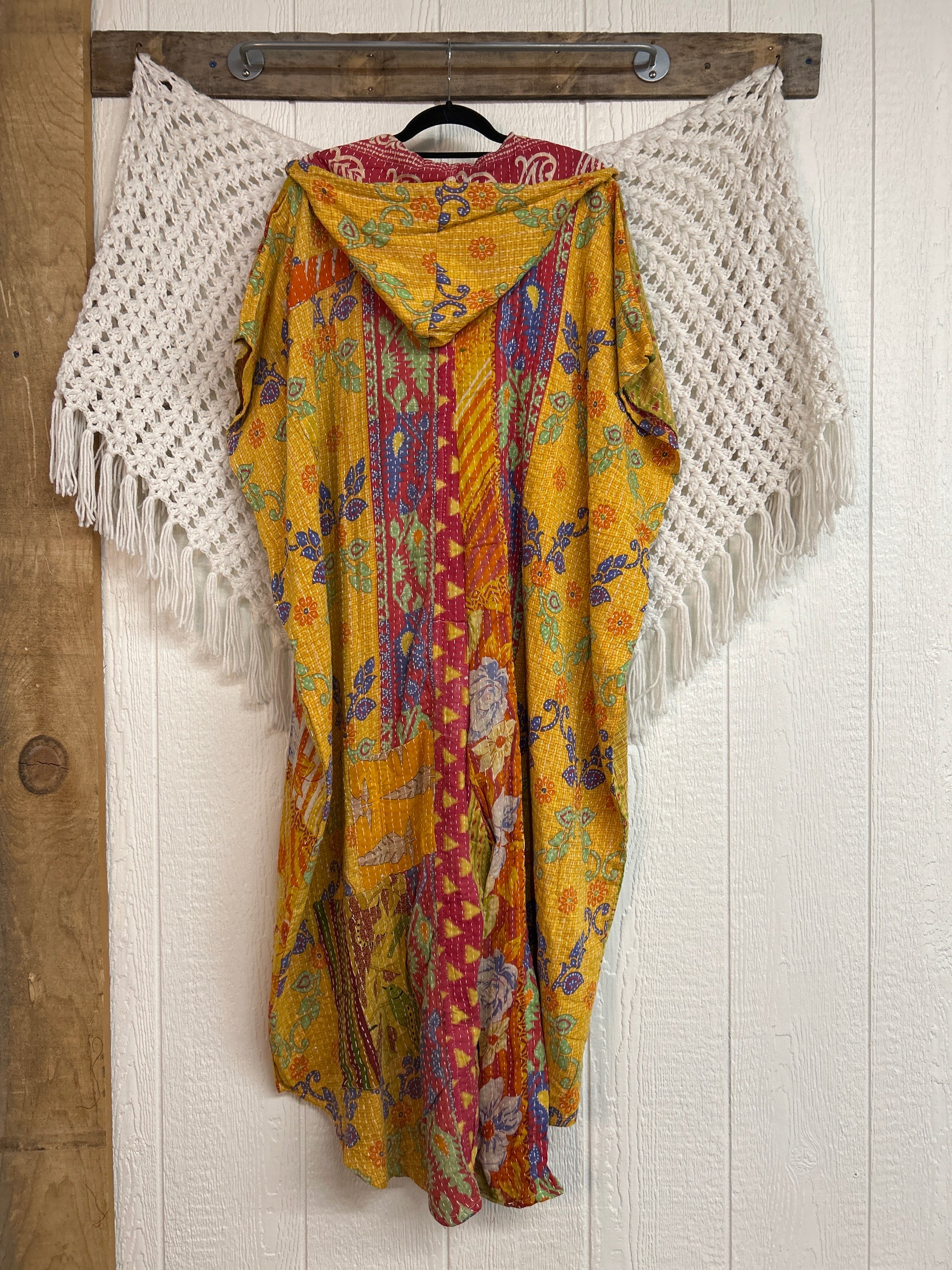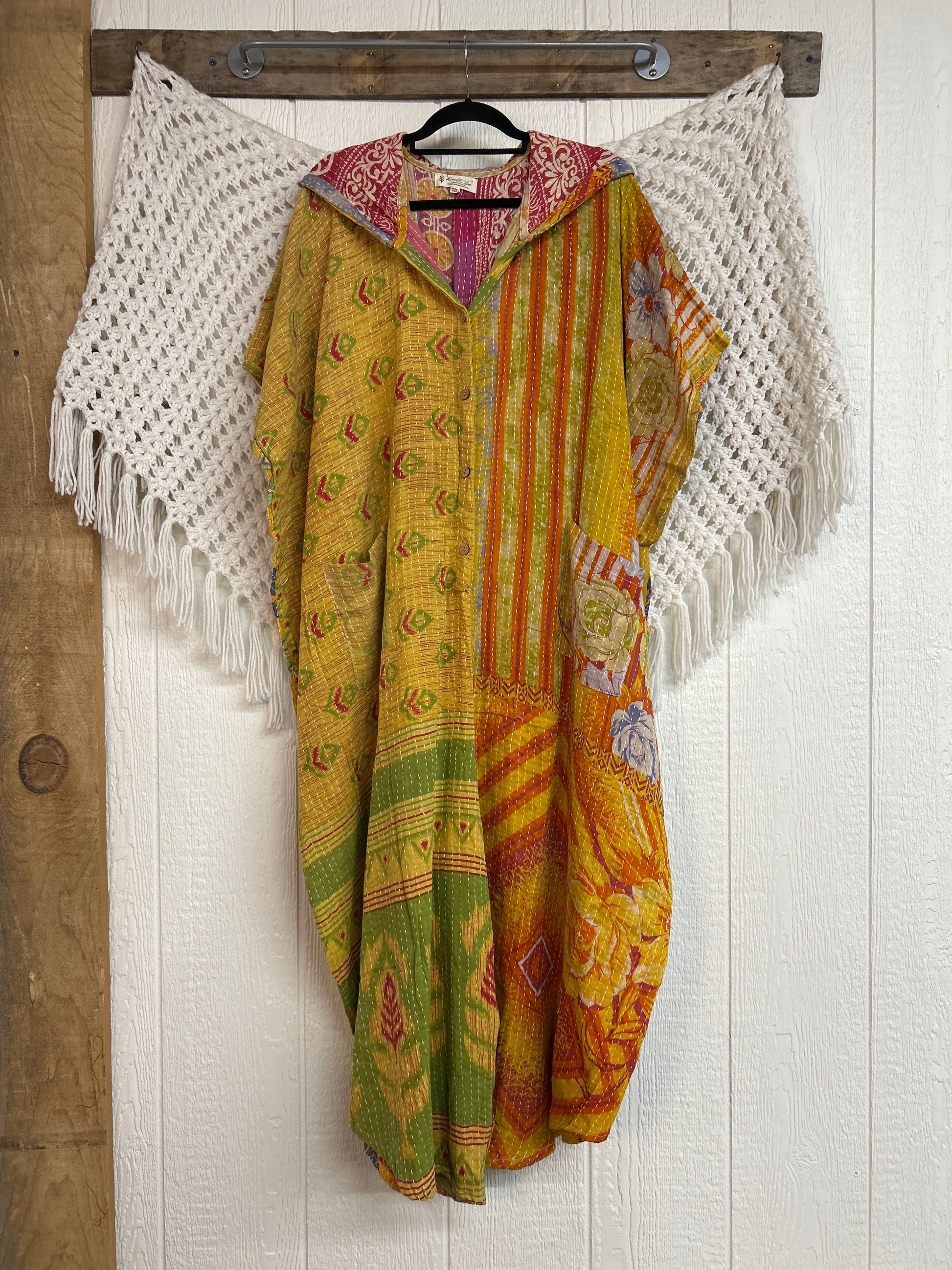 Made from our hand Kantha stitched cotton sari, this one piece wonder features a hood, front button-down closure, pockets, and super flowy pant legs..