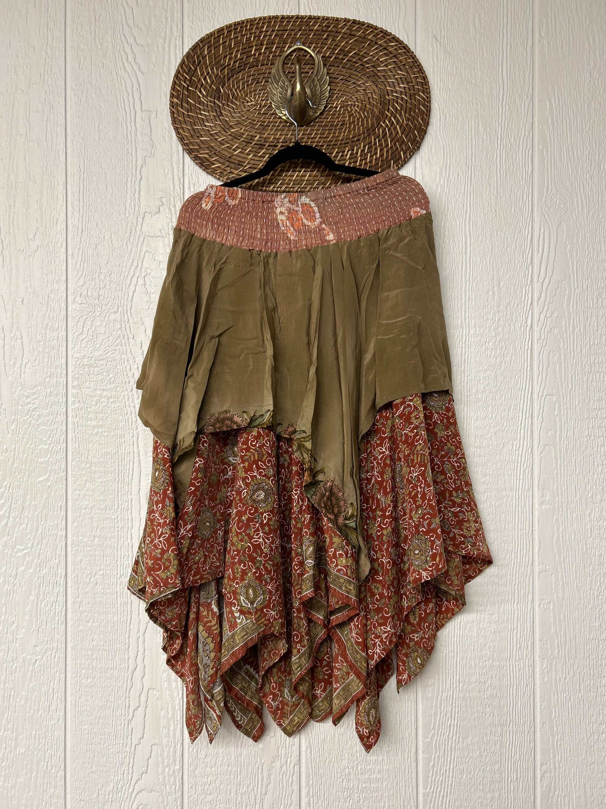crafted from our ultra lux vintage crepe and ragulla sari. Features a rock star asymmetrical hem and stretchy pareo kantha waistband. This versatile piece can be pulled up to be worn as a tunic!