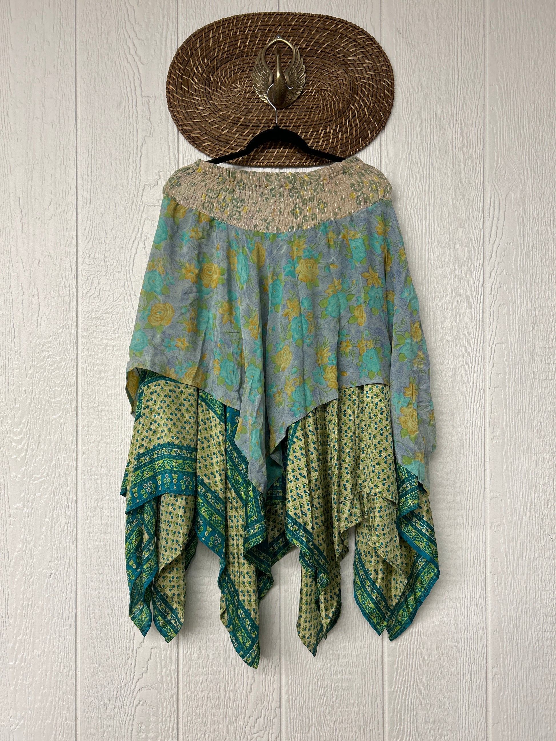 crafted from our ultra lux vintage crepe and ragulla sari. Features a rock star asymmetrical hem and stretchy pareo kantha waistband. This versatile piece can be pulled up to be worn as a tunic!