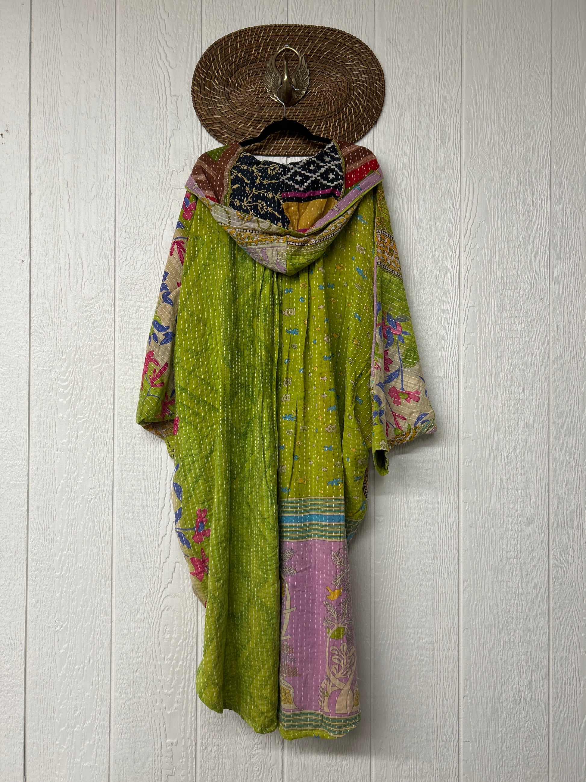 Made from our hand kantha stitched vintage cotton sari, this piece of wearable art features a Button-down opening with functional buttons, slouchy outer pockets, billowy sleeves, a rounded hemline and a vibey hood. The perfect maxi to compliment your favorite kantha pants or bell bottoms.