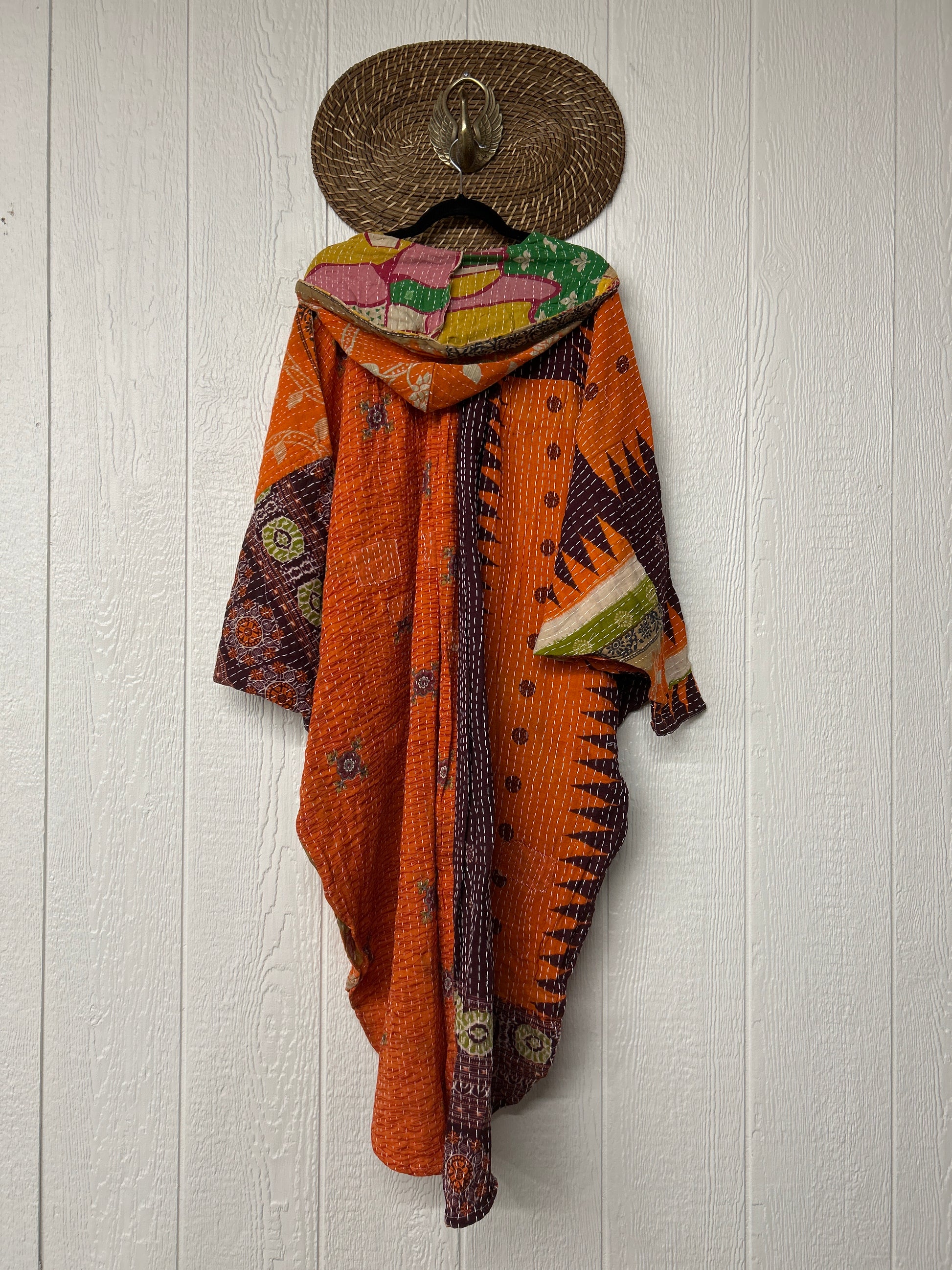 Made from our hand kantha stitched vintage cotton sari, this piece of wearable art features a Button-down opening with functional buttons, slouchy outer pockets, billowy sleeves, a rounded hemline and a vibey hood. The perfect maxi to compliment your favorite kantha pants or bell bottoms.