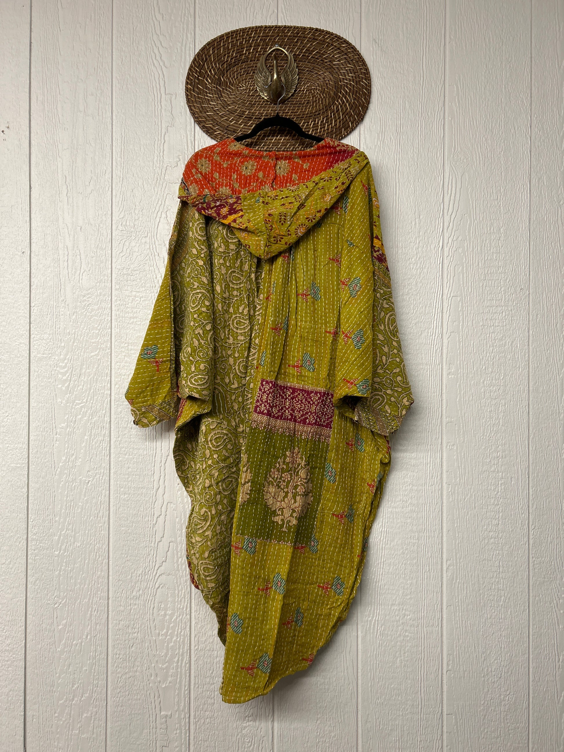 Made from our hand kantha stitched vintage cotton sari, this piece of wearable art features a Button-down opening with functional buttons, slouchy outer pockets, billowy sleeves, a rounded hemline and a vibey hood. The perfect maxi to compliment your favorite kantha pants or bell bottoms.