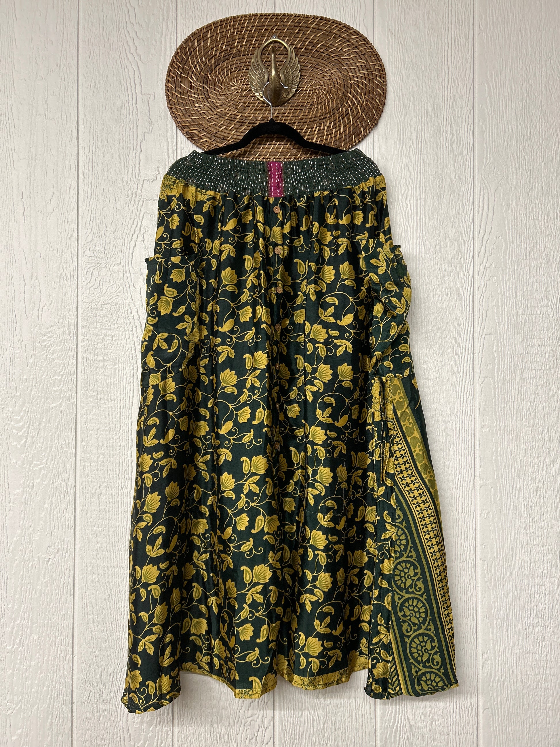 Crafted from rasgulla sari, this absolute dream features slouchy side pockets with a butterfly drawstring to cinch the sides, a button front skirt and a stretchy free size waist.