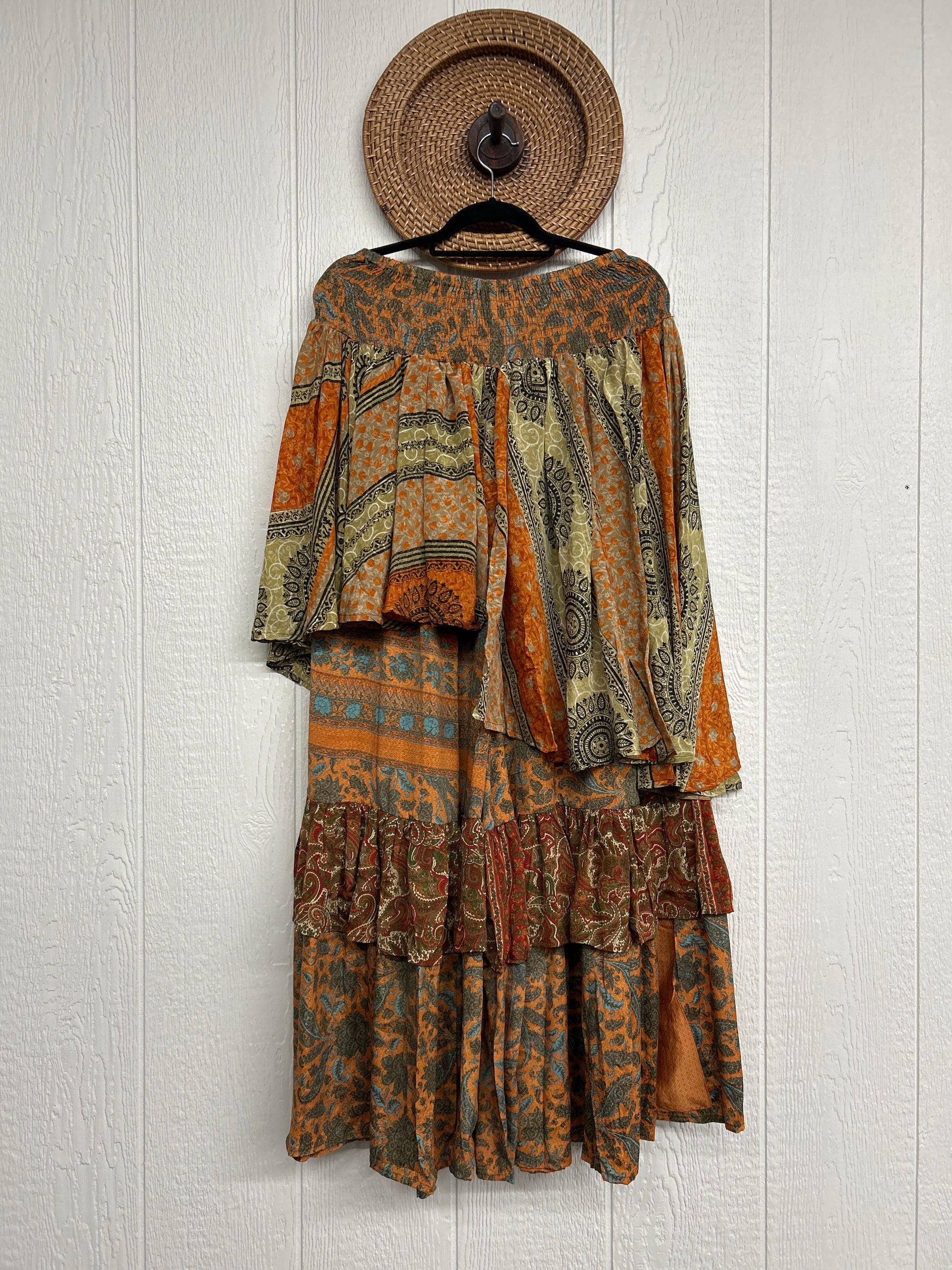 Crafted from vintage rasgulla sari these ethereal pants features stretchy waist, super wide legs, double tier hem and a skirt layer. these pants will make you want to dance! One size, recommended up to size 22/24 Crafted and sewn by families in a small village in Northern India providing work and a fair living. This product should be hand washed and line dried for longest life. For softness, fluff in the dryer on low heat after it has dried from hand washing. Disclosure: Our vintage styles have lived a full life before becoming the designs in our shop. Fabrics may have small threads or holes in the layers. Color inconsistency or small stains may be present. The saris are sewn together and extend the life of each design. Imperfections should be celebrated.