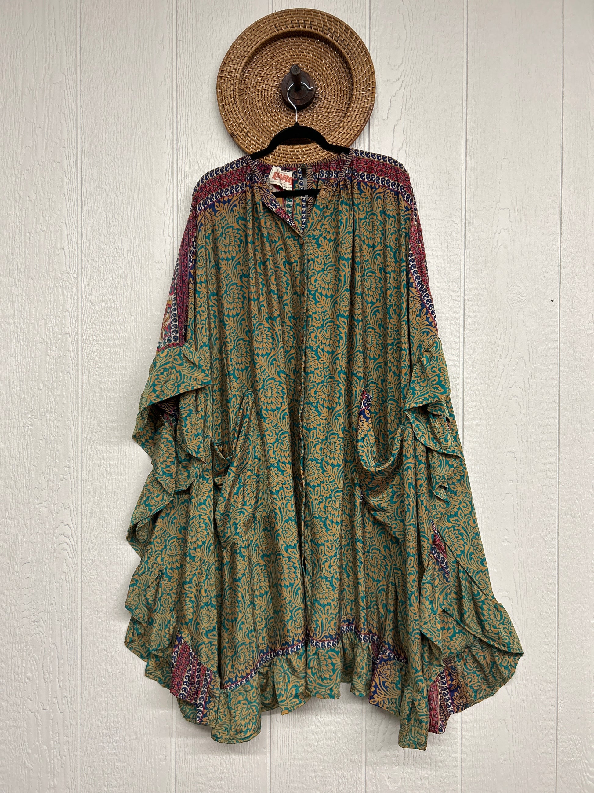 This dreamy muu is crafted from our ultra lux vintage rasgulla sari and features a button down placket and slouchy exterior pockets. Ruffles around the hem make this the ultimate rockstar layer that you can wear closed as a muu or open as a kimono!!