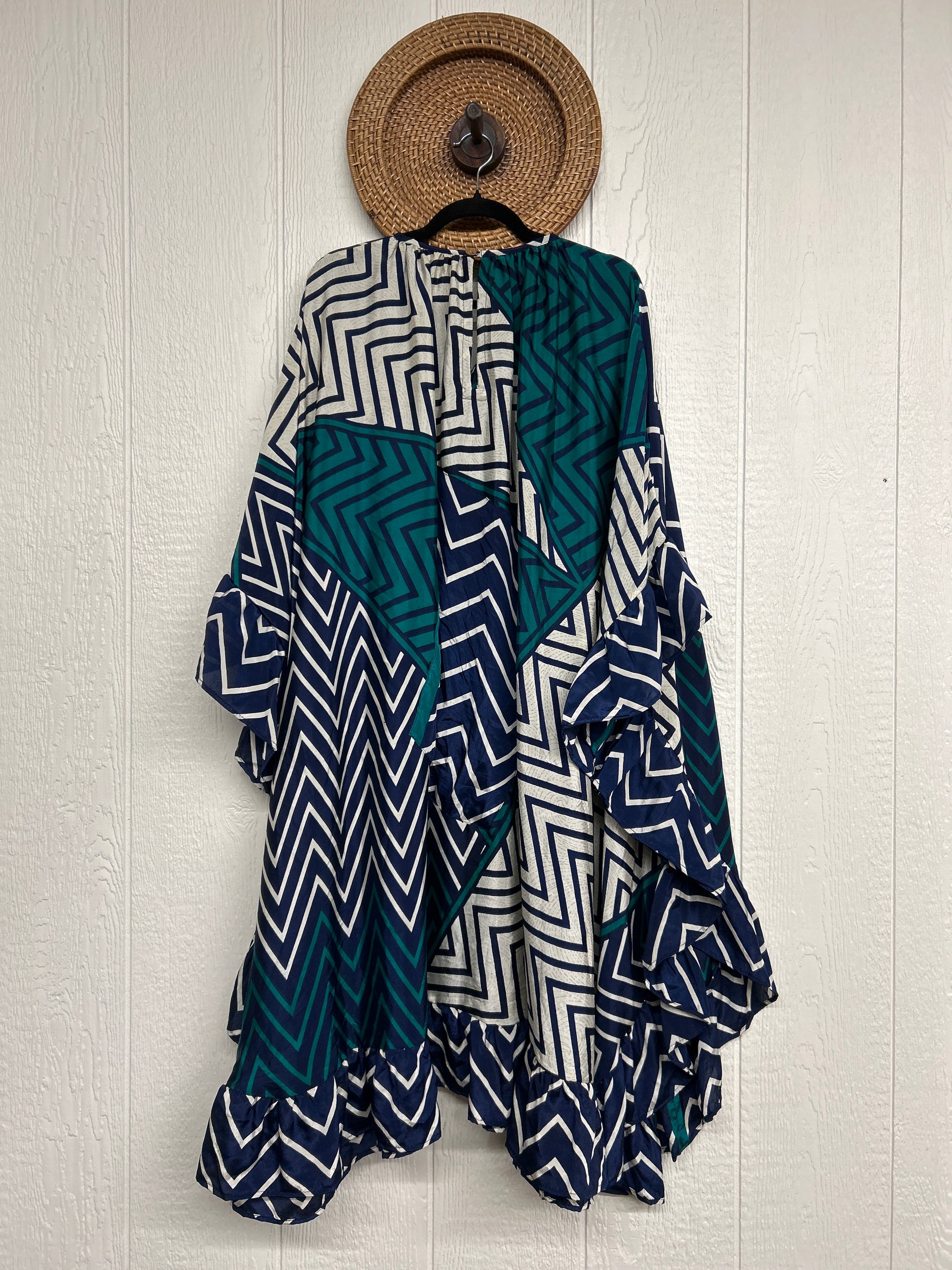 Fabrics may have small threads or holes in the layers. Color inconsistency or small stains may be present. The saris are sewn together and extend the life of each design. Imperfections should be celebrated.