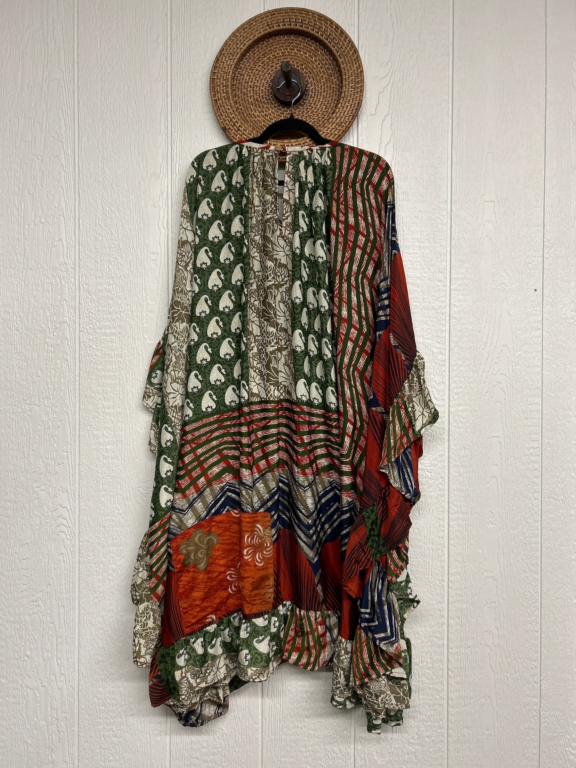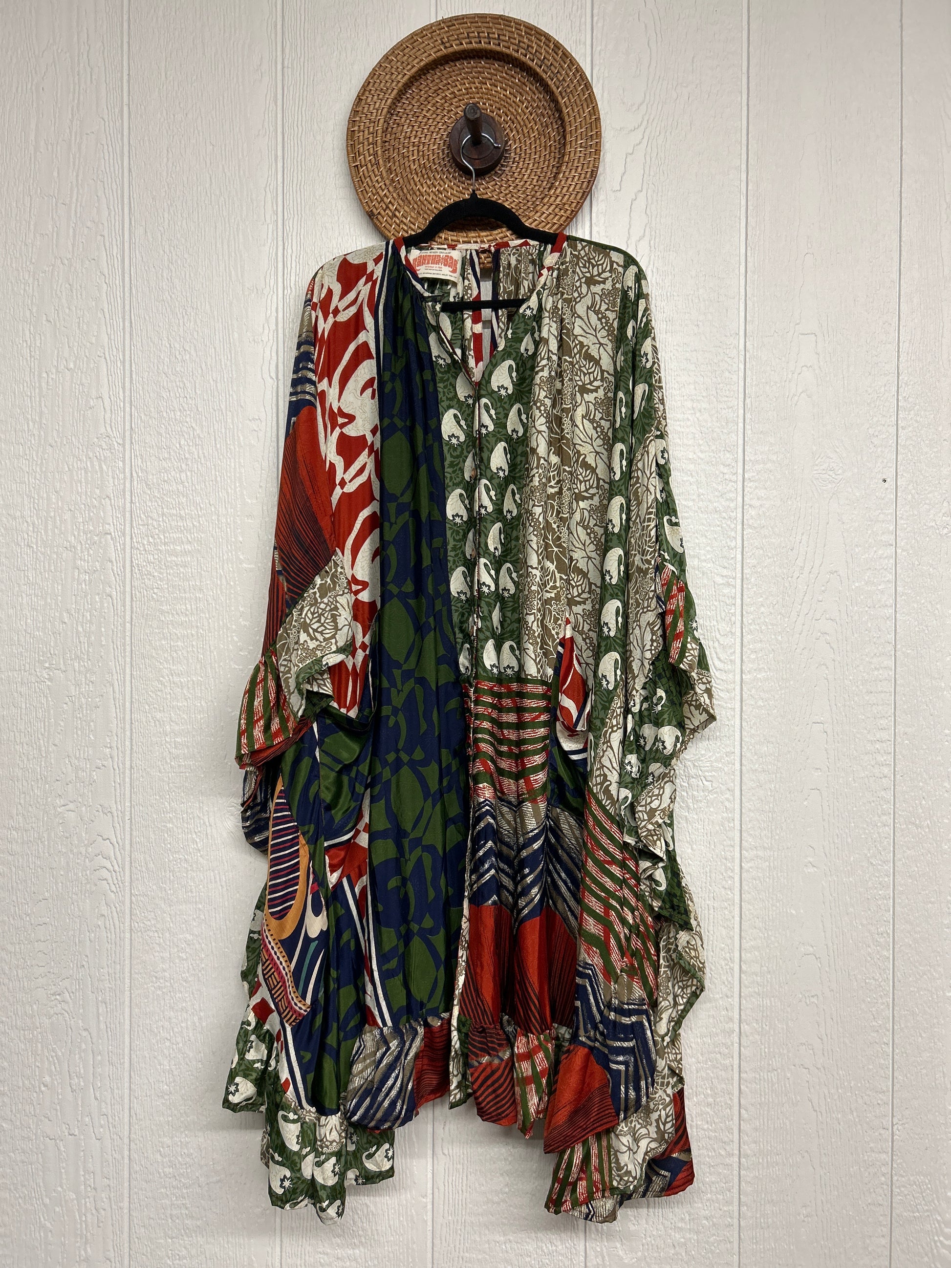 Fabrics may have small threads or holes in the layers. Color inconsistency or small stains may be present. The saris are sewn together and extend the life of each design. Imperfections should be celebrated.