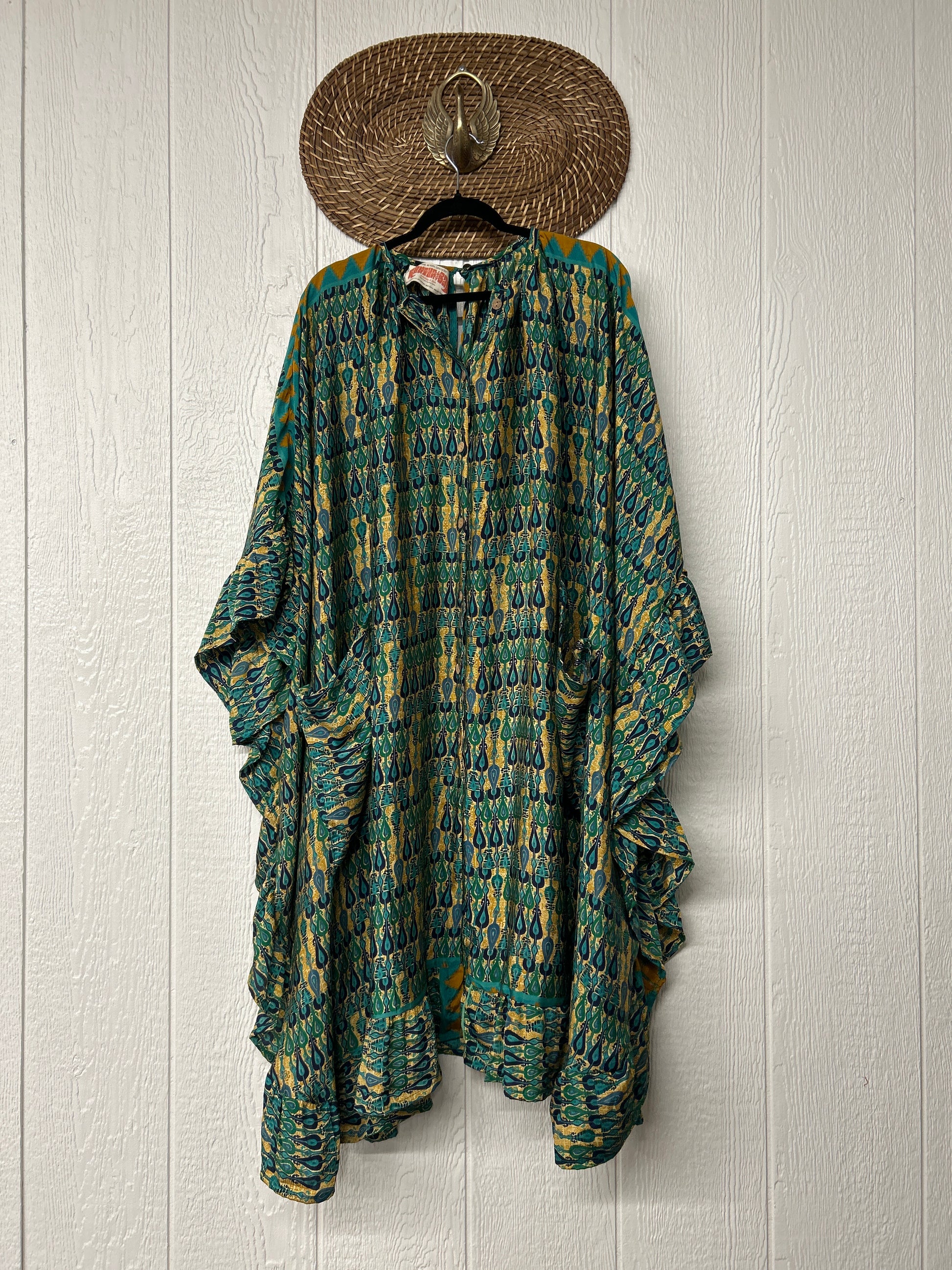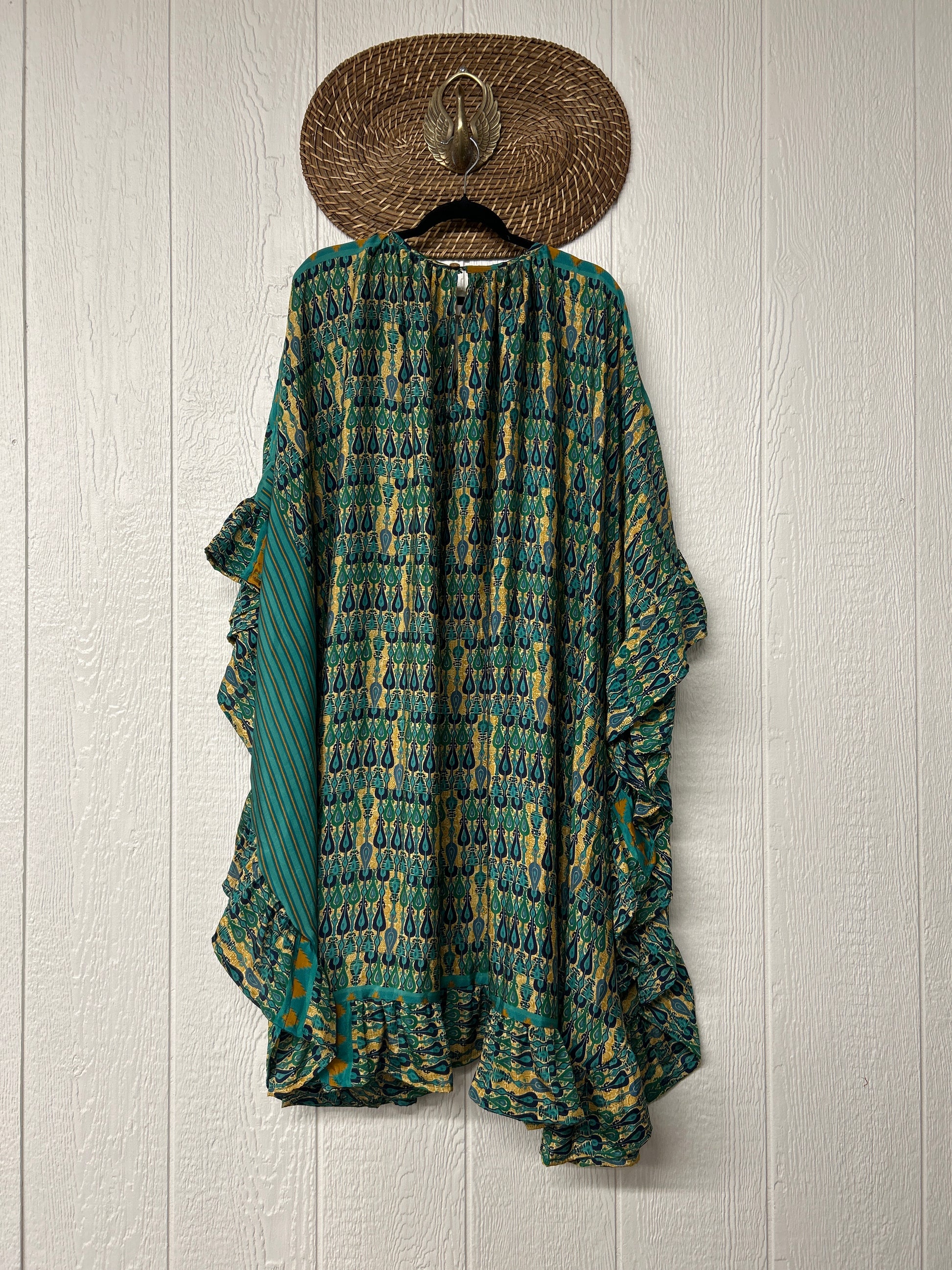 This dreamy muu is crafted from our ultra lux vintage rasgulla sari and features a button down placket and slouchy exterior pockets. Ruffles around the hem make this the ultimate rockstar layer that you can wear closed as a muu or open as a kimono!!