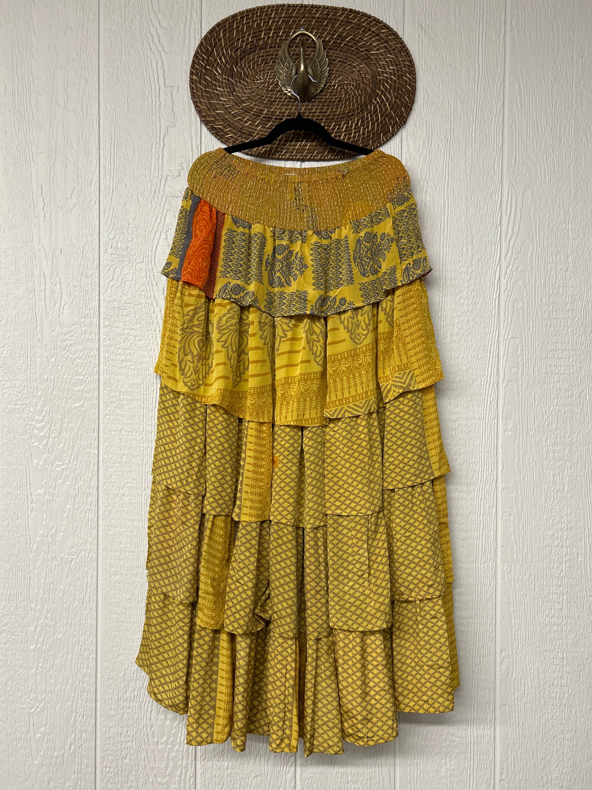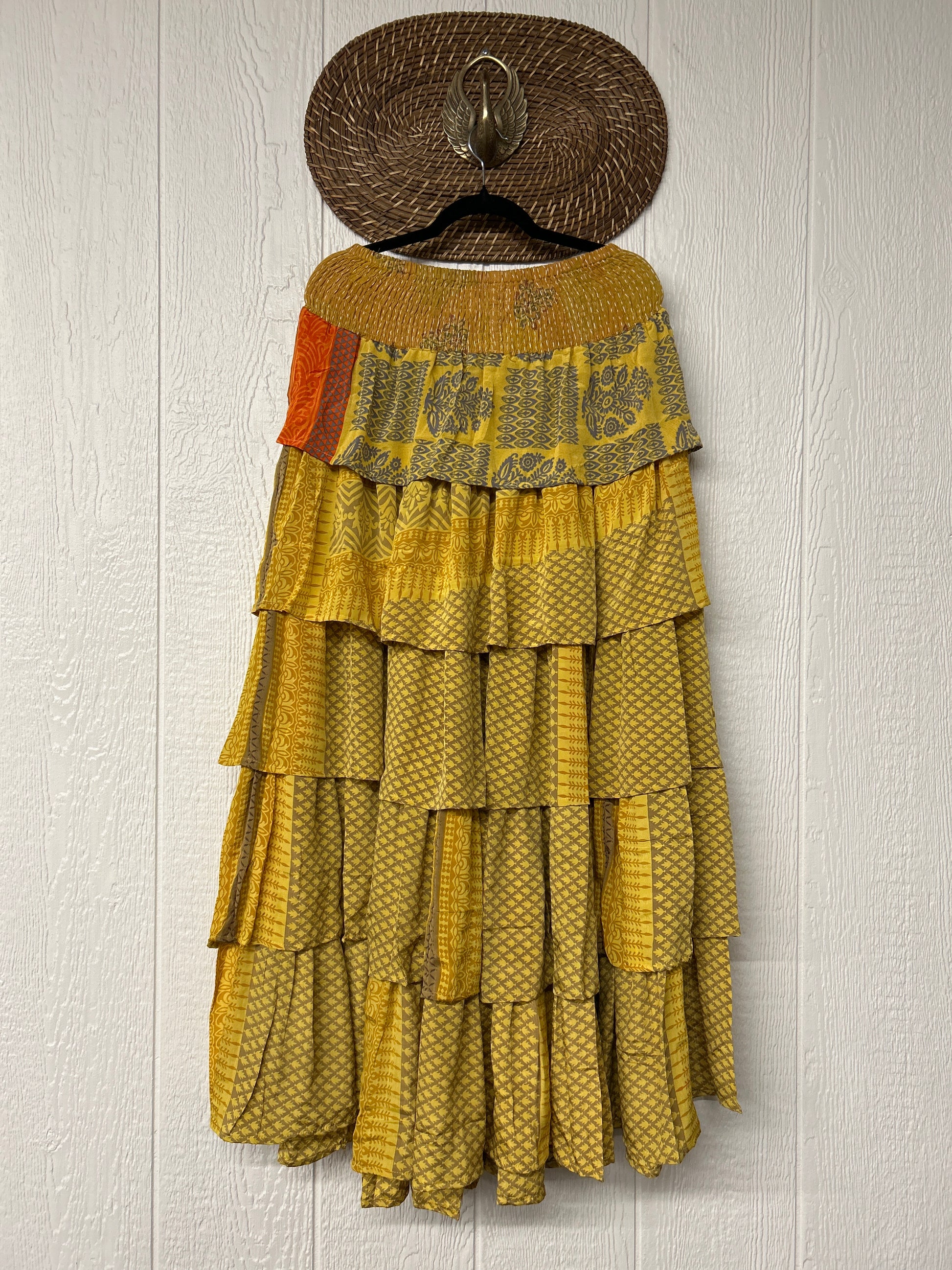 Crafted from vintage rasgulla sari, this ethereal piece features a stretchy ruffle waistband, a tiered floaty ruffle skirt.
