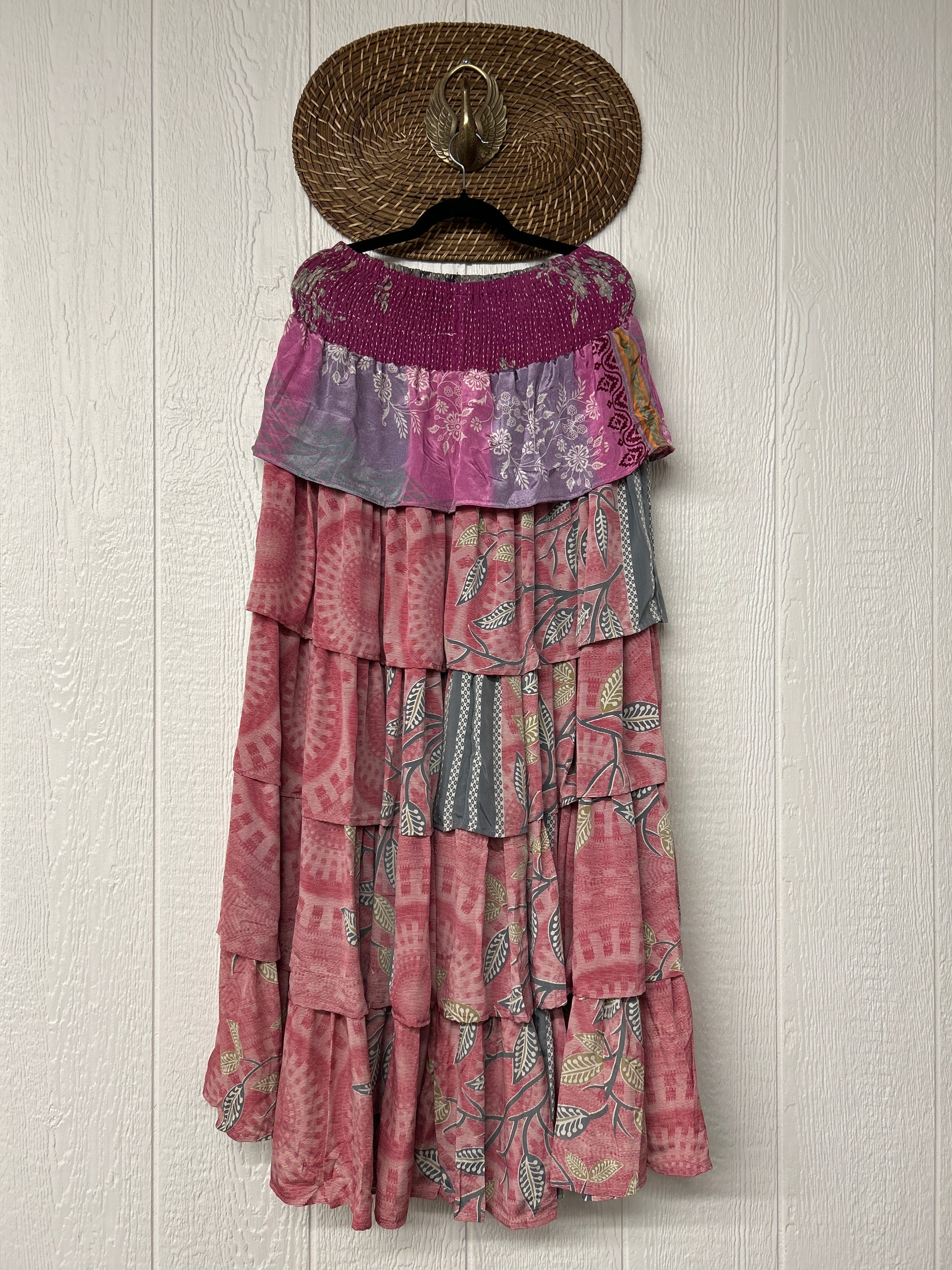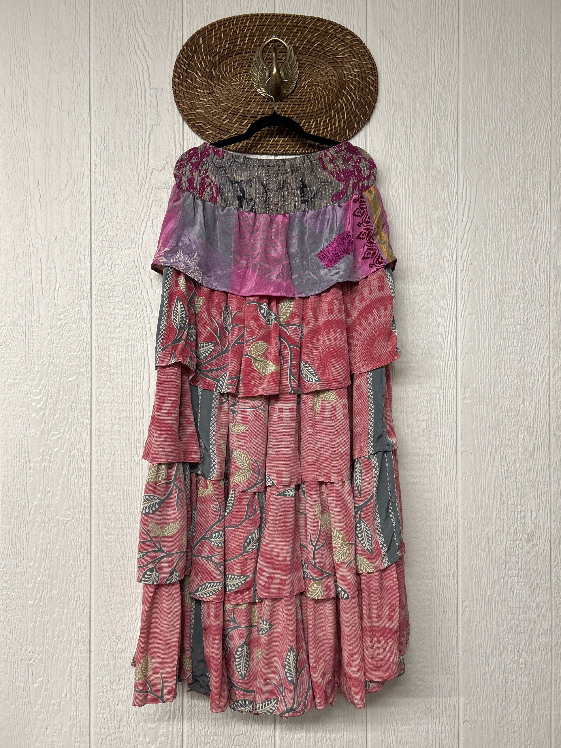 Crafted from vintage rasgulla sari, this ethereal piece features a stretchy ruffle waistband, a tiered floaty ruffle skirt.