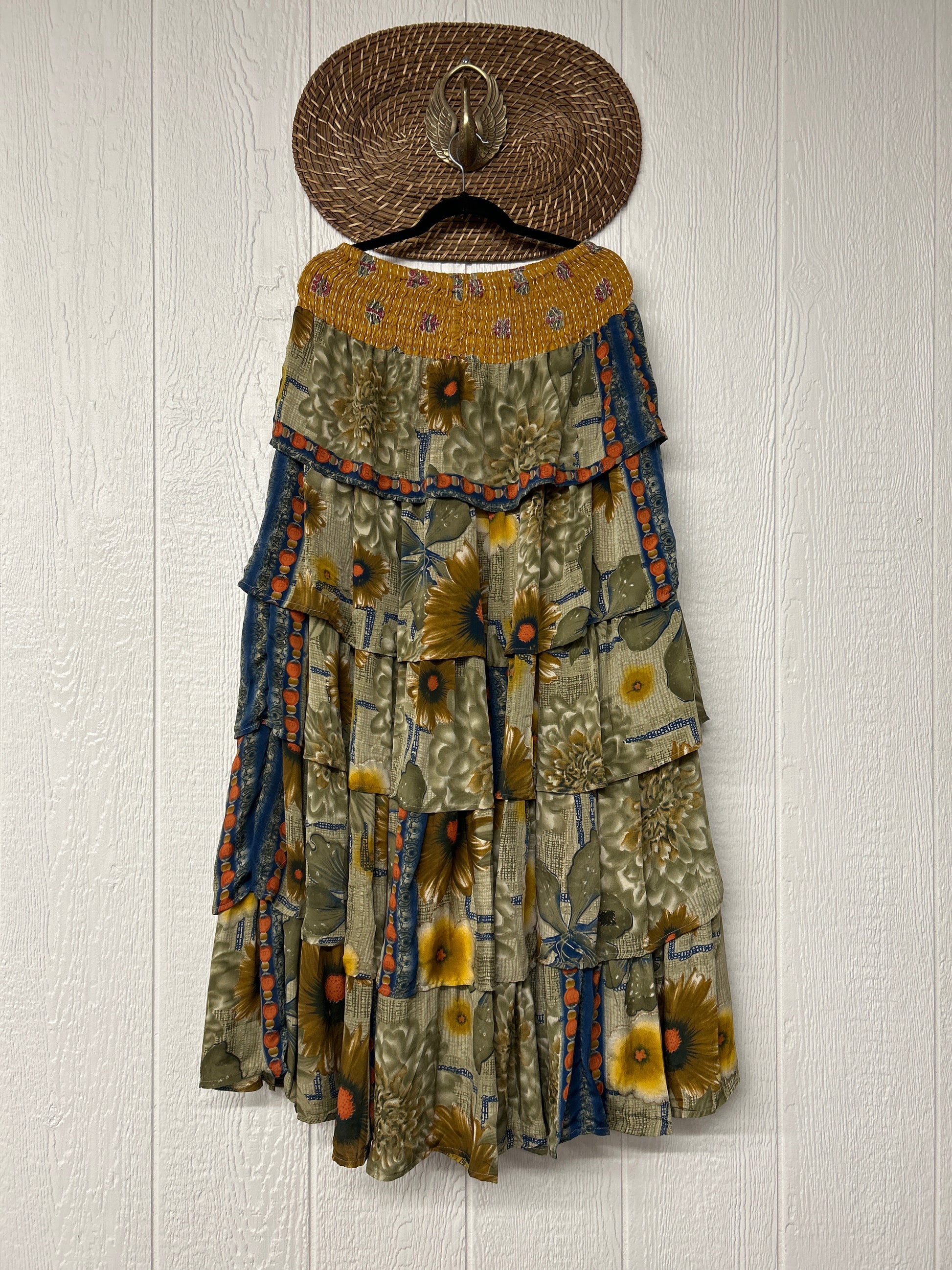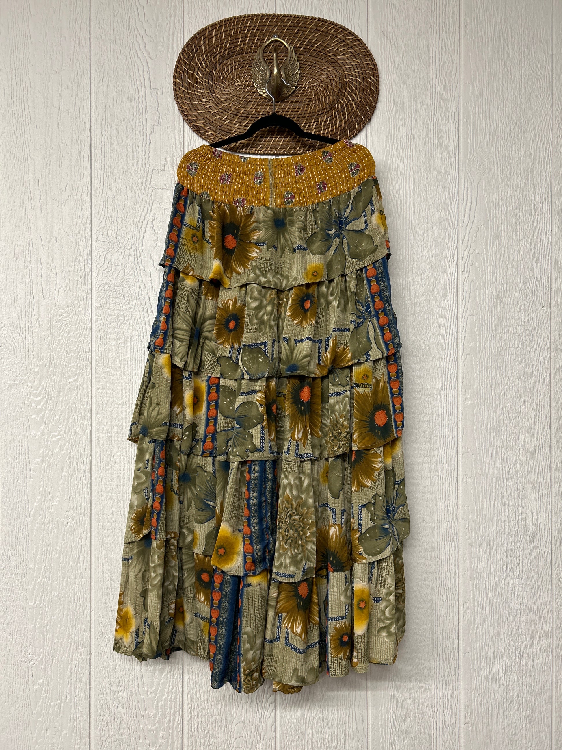 Crafted from vintage rasgulla sari, this ethereal piece features a stretchy ruffle waistband, a tiered floaty ruffle skirt.
