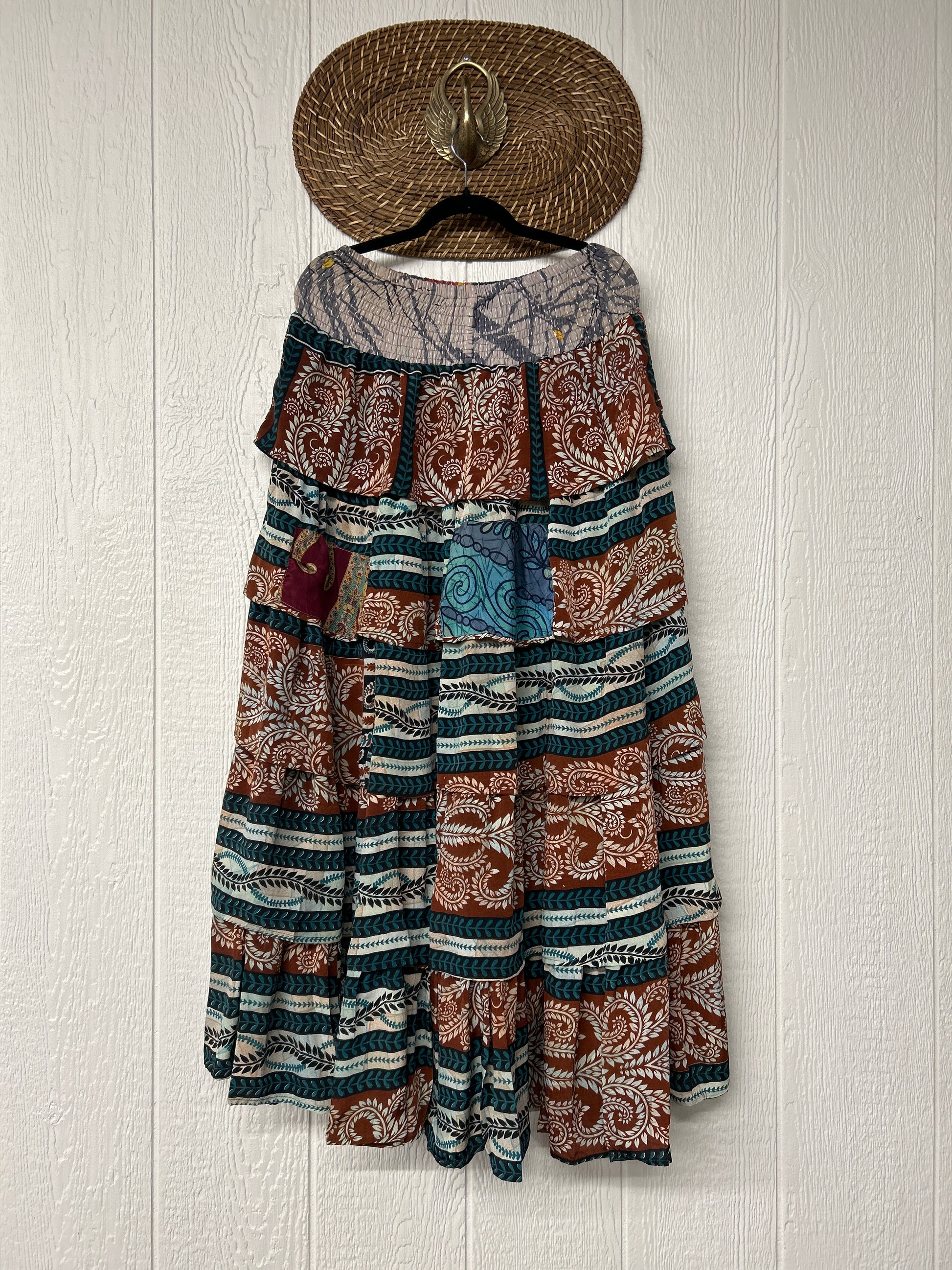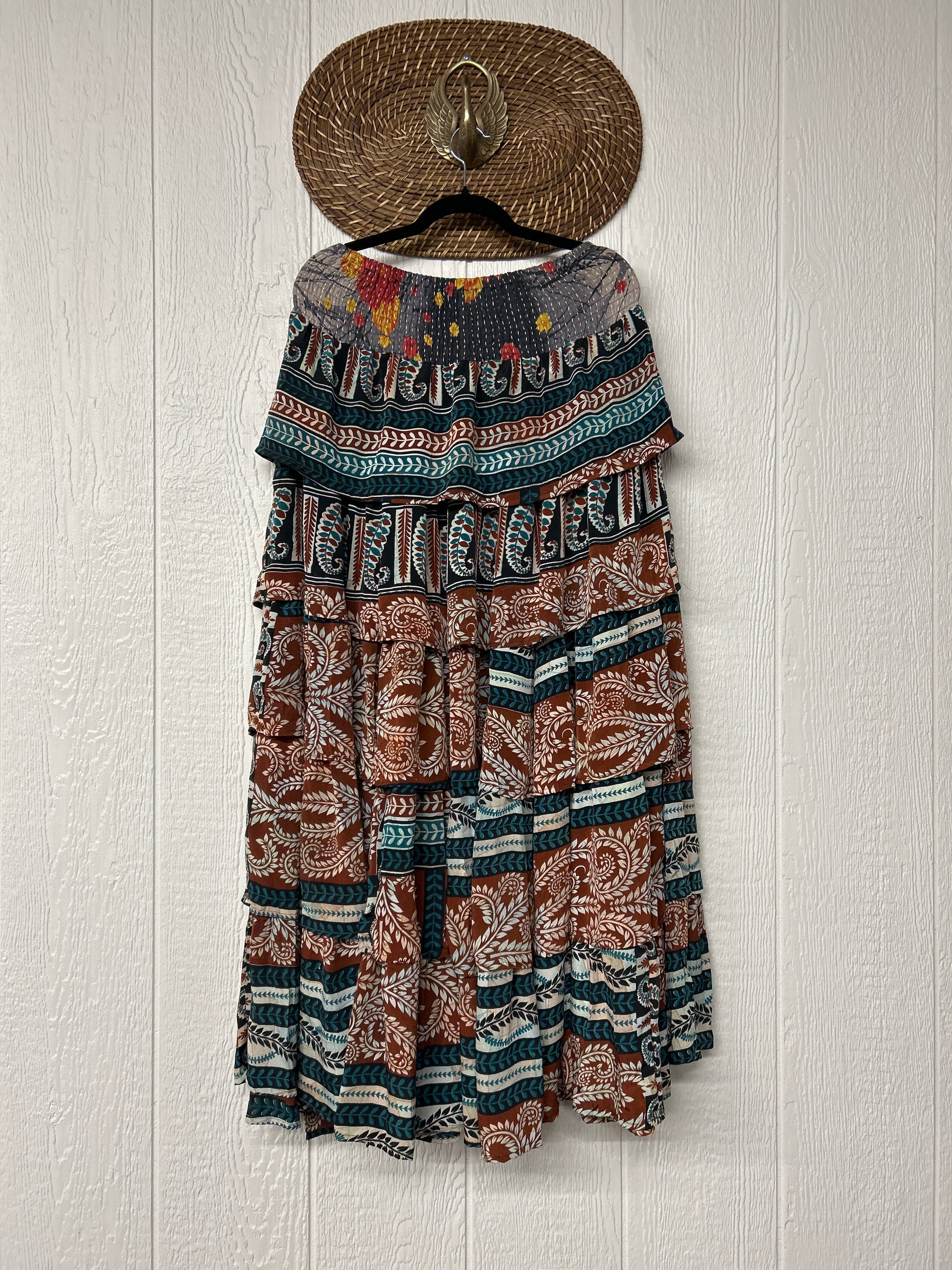 Crafted from vintage rasgulla sari, this ethereal piece features a stretchy ruffle waistband, a tiered floaty ruffle skirt.