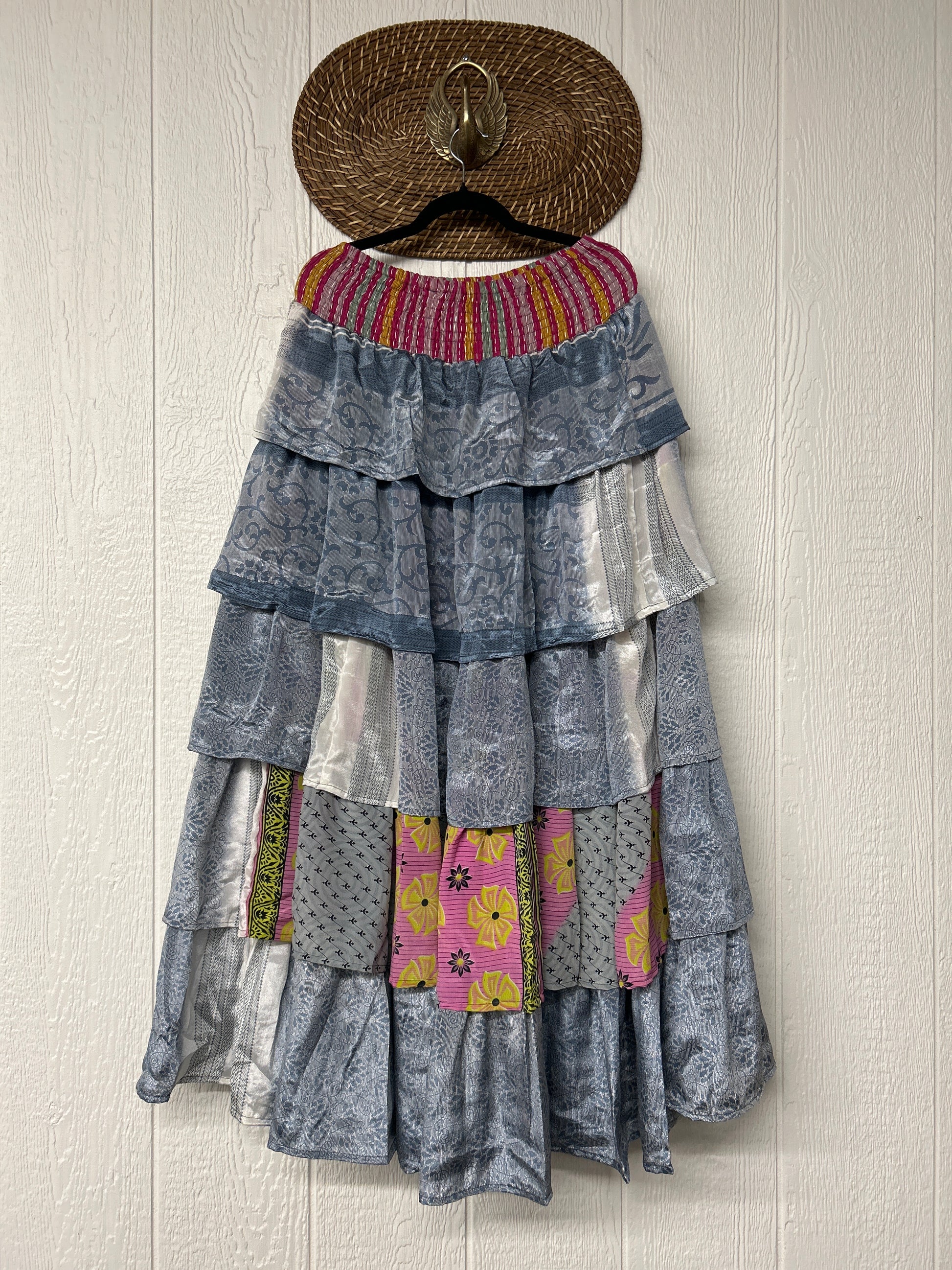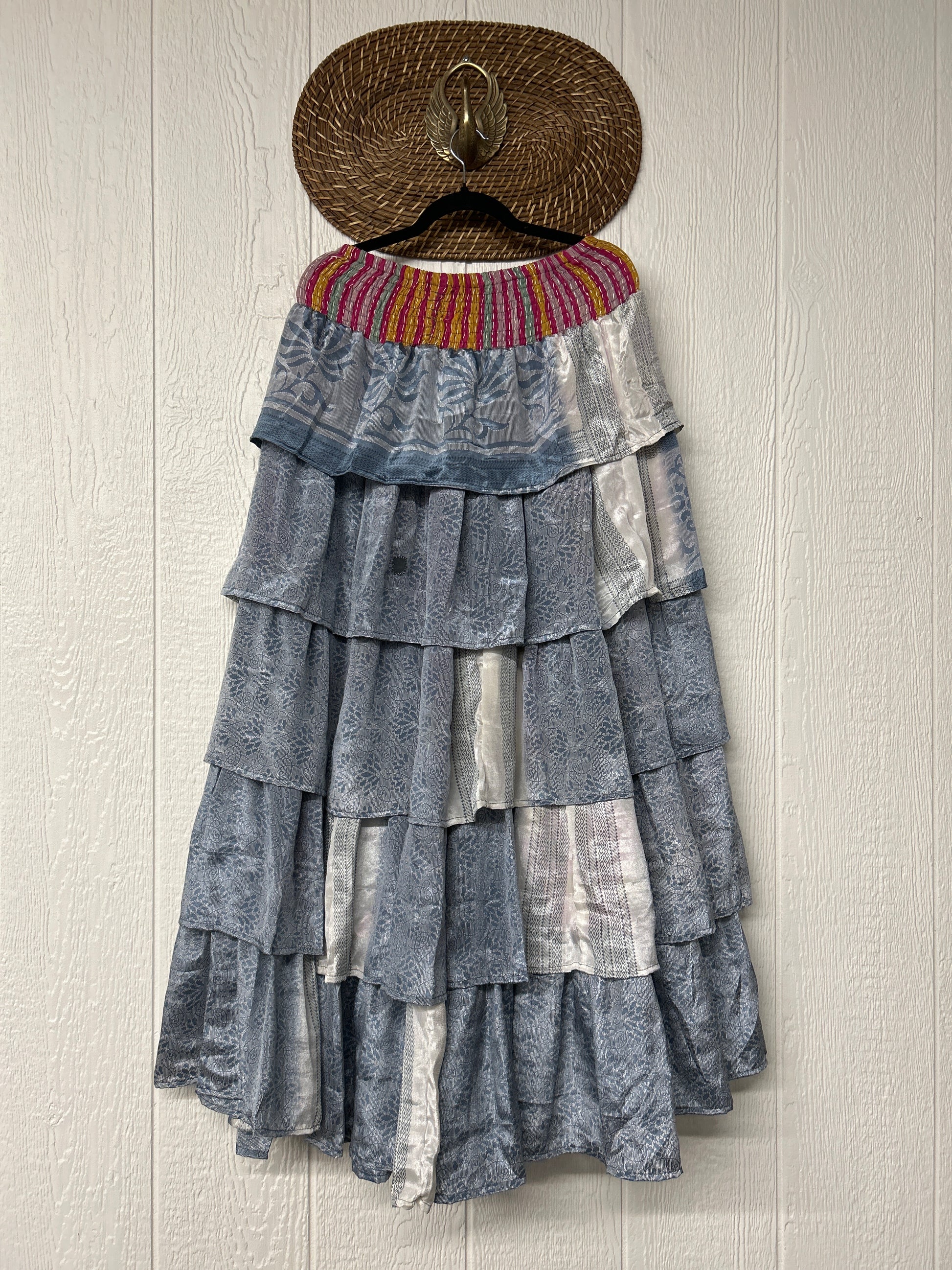 Crafted from vintage rasgulla sari, this ethereal piece features a stretchy ruffle waistband, a tiered floaty ruffle skirt.