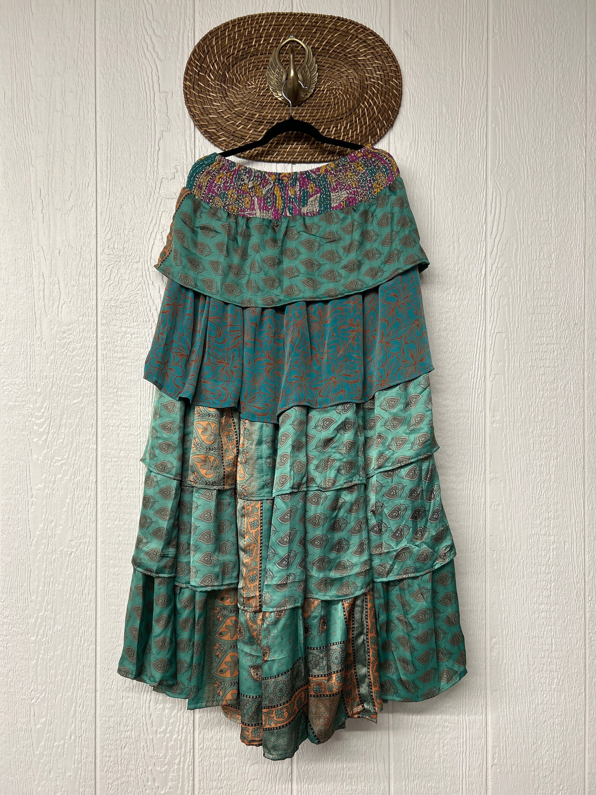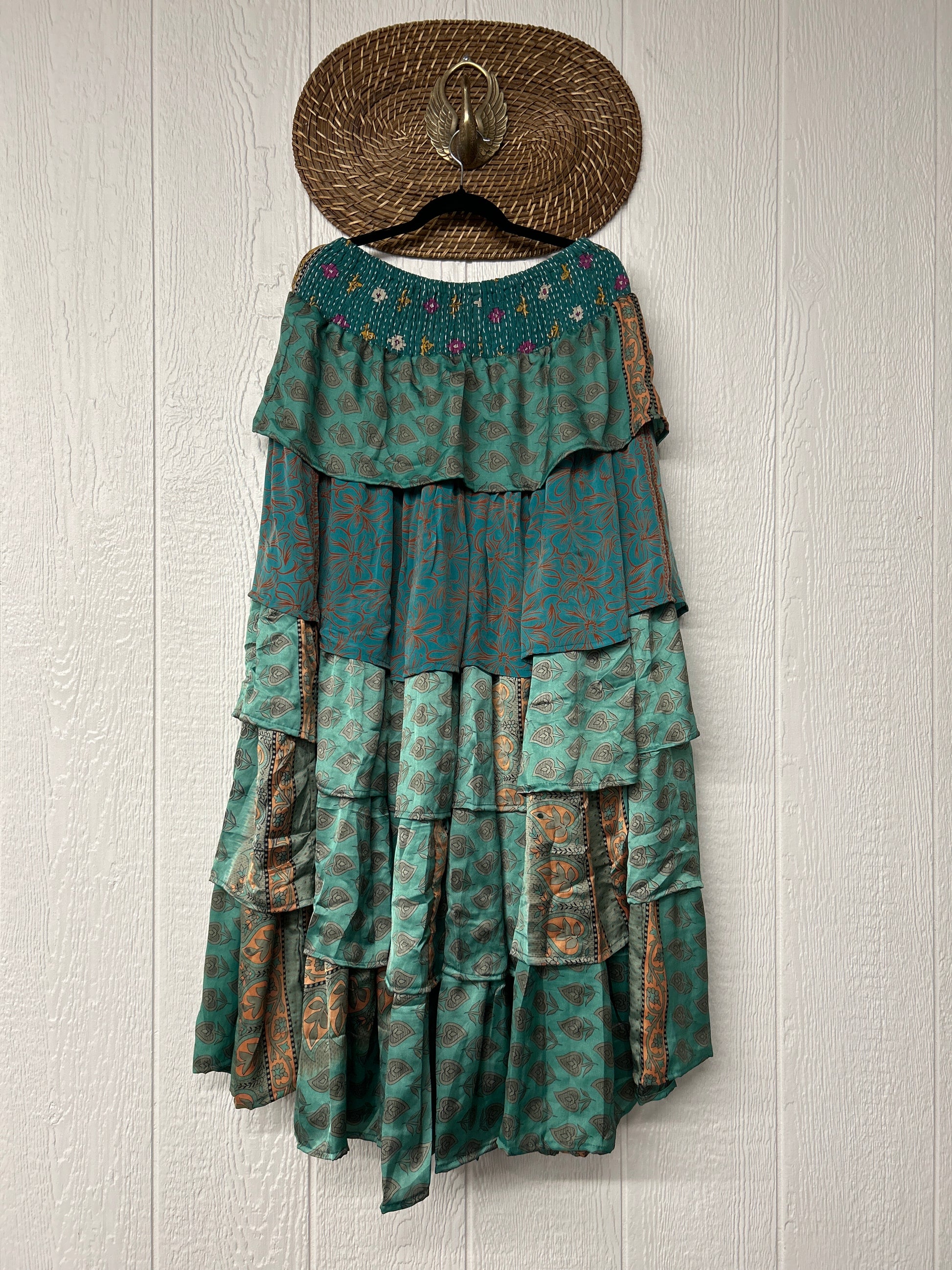 Crafted from vintage rasgulla sari, this ethereal piece features a stretchy ruffle waistband, a tiered floaty ruffle skirt.