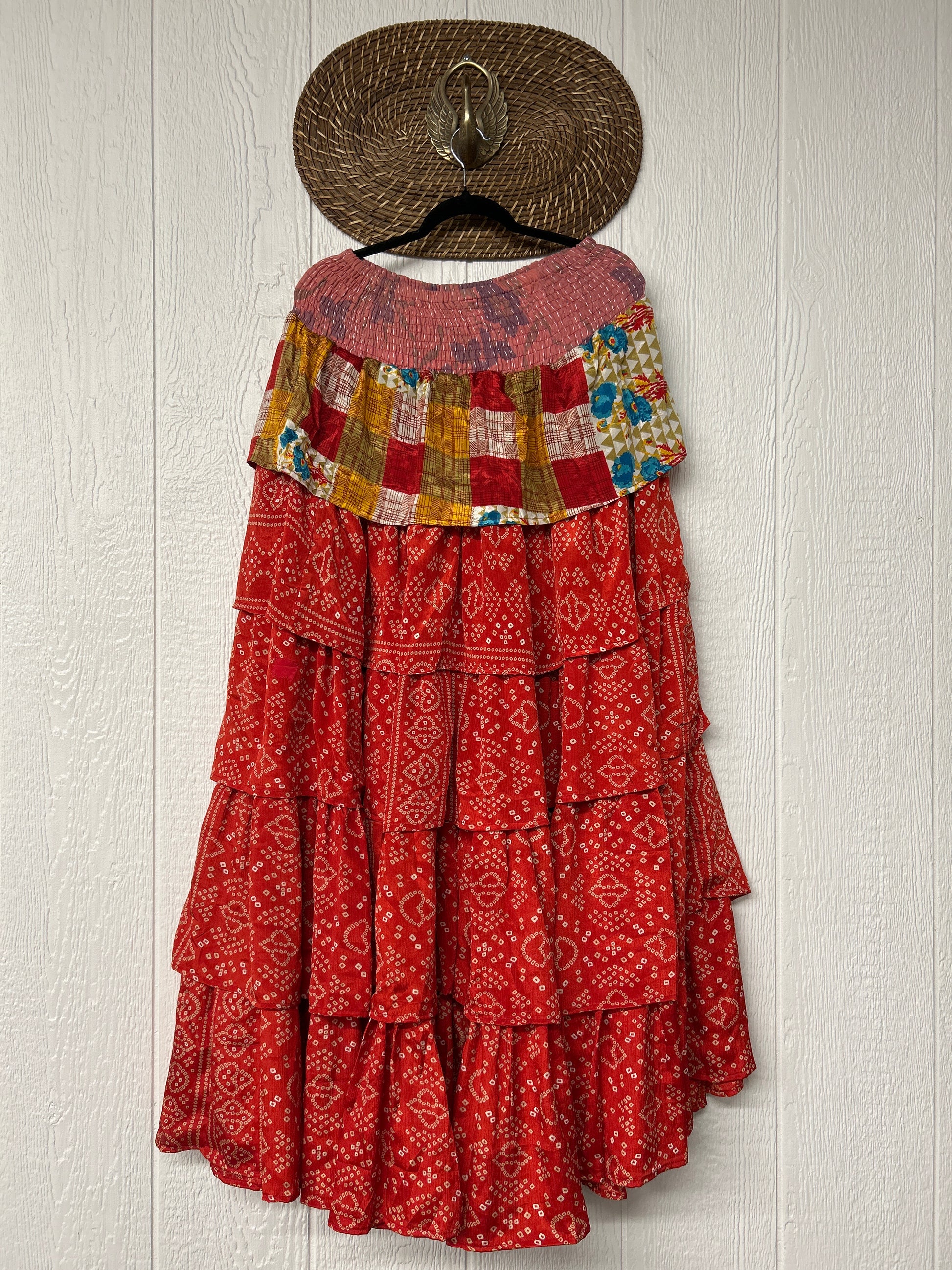 Crafted from vintage rasgulla sari, this ethereal piece features a stretchy ruffle waistband, a tiered floaty ruffle skirt.