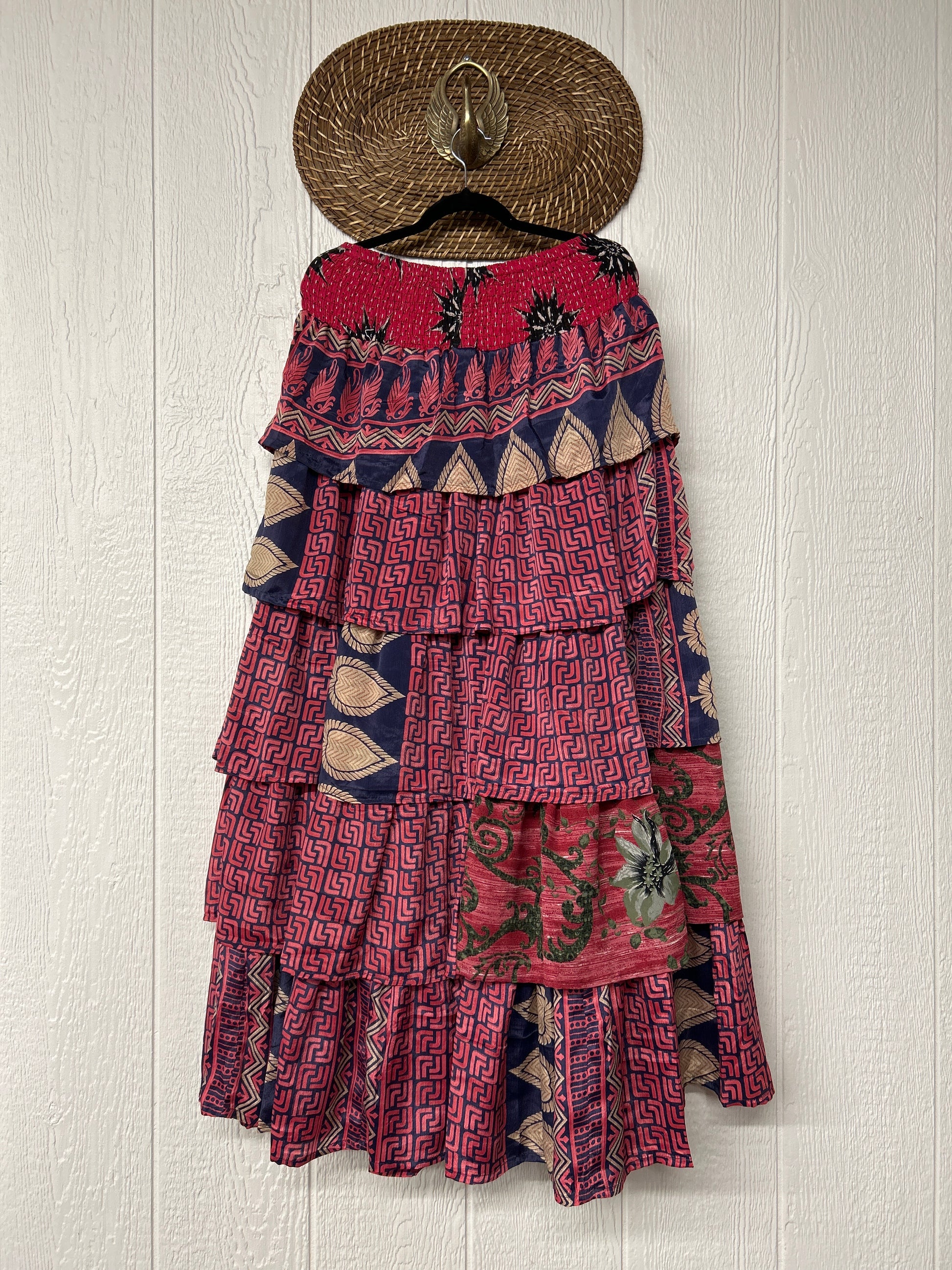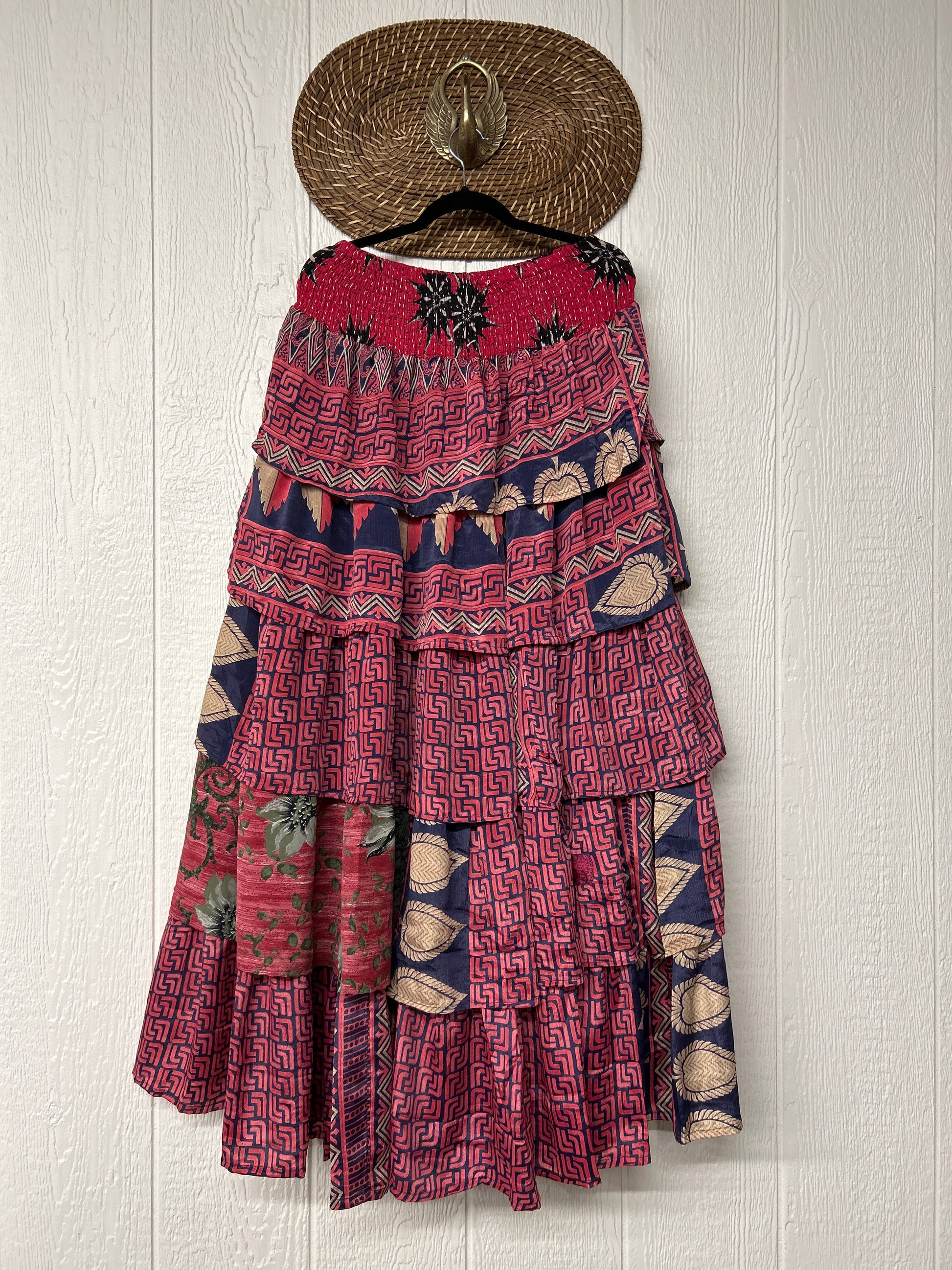 Crafted from vintage rasgulla sari, this ethereal piece features a stretchy ruffle waistband, a tiered floaty ruffle skirt.