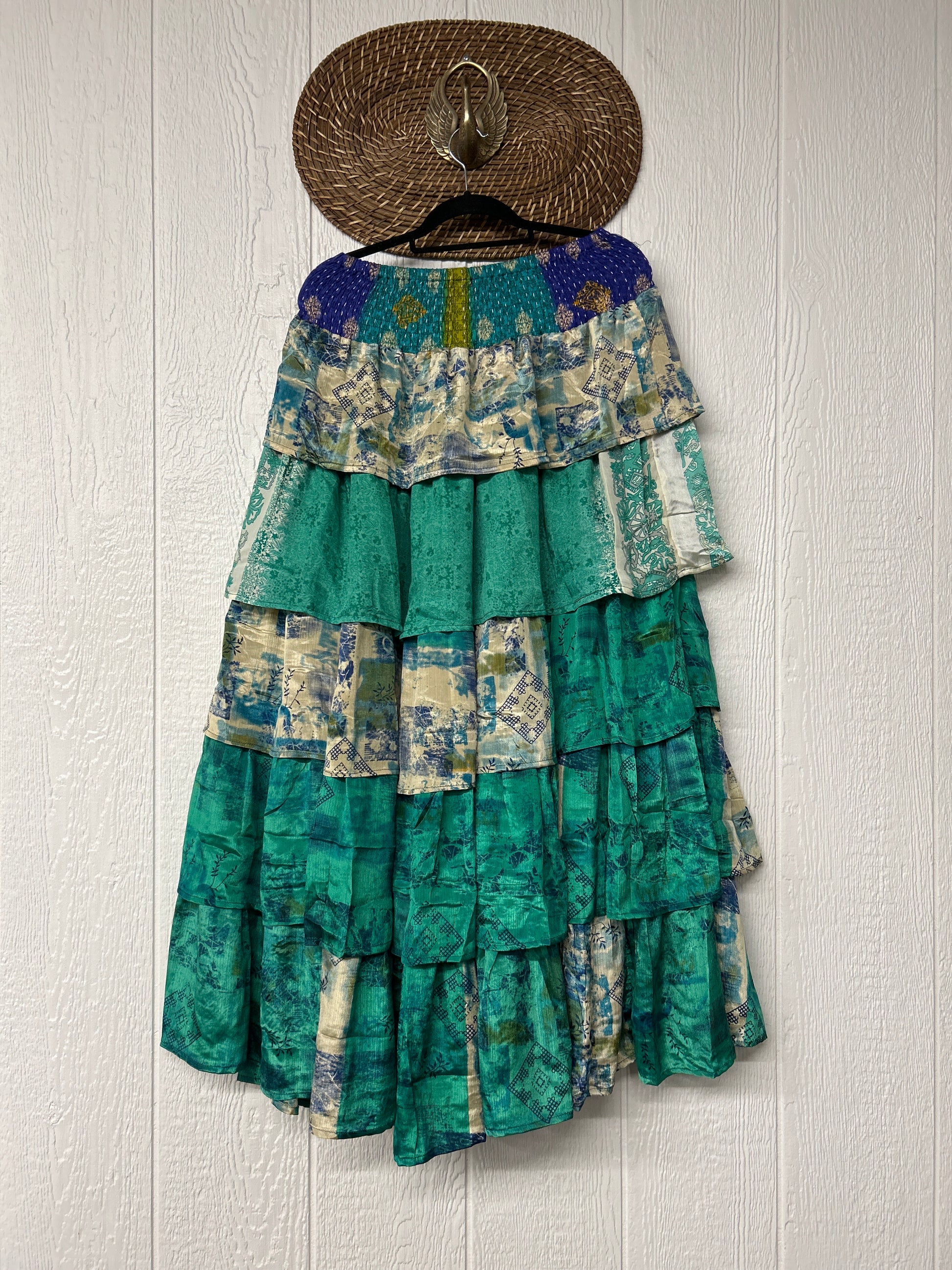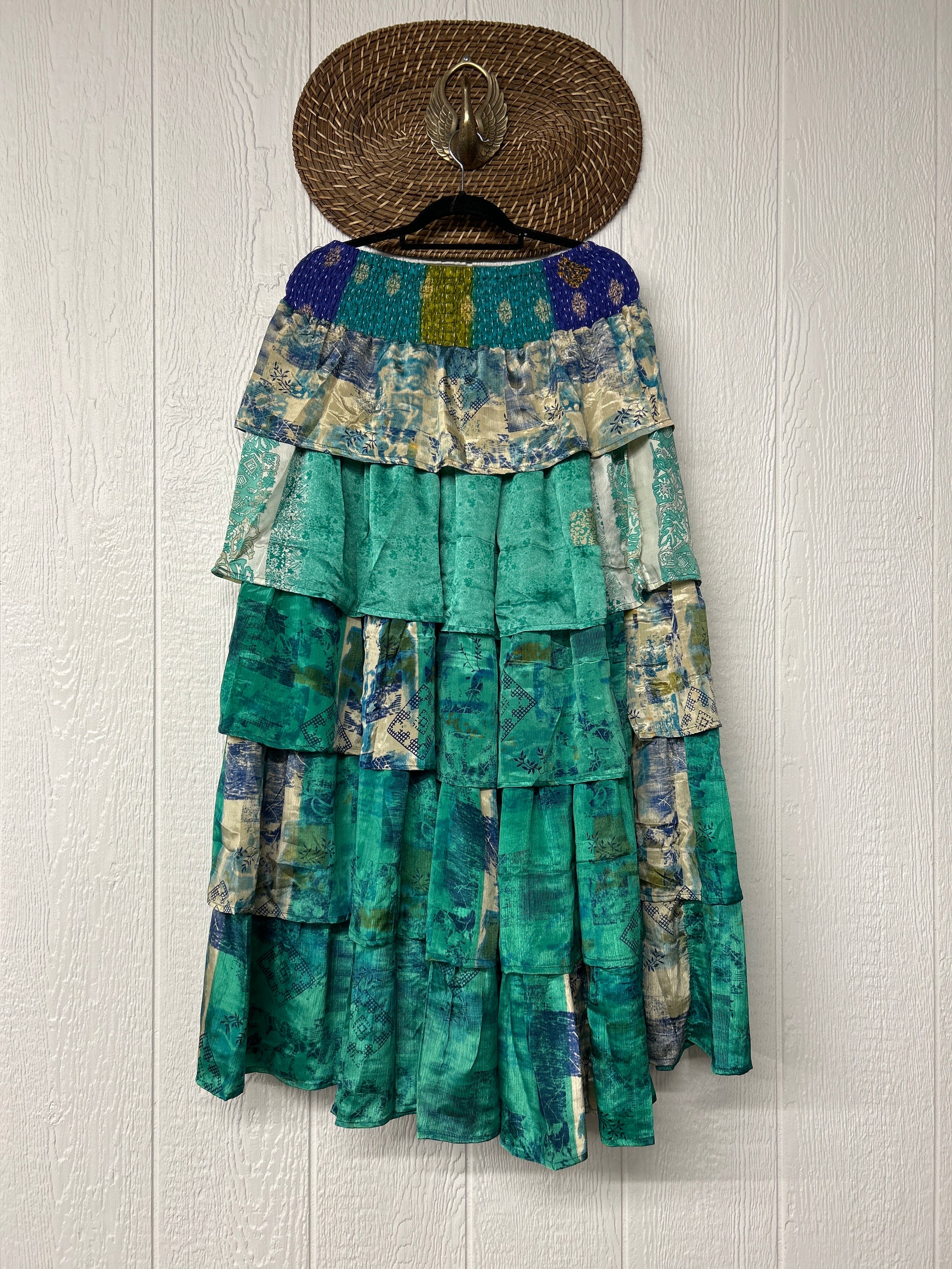 Crafted from vintage rasgulla sari, this ethereal piece features a stretchy ruffle waistband, a tiered floaty ruffle skirt.