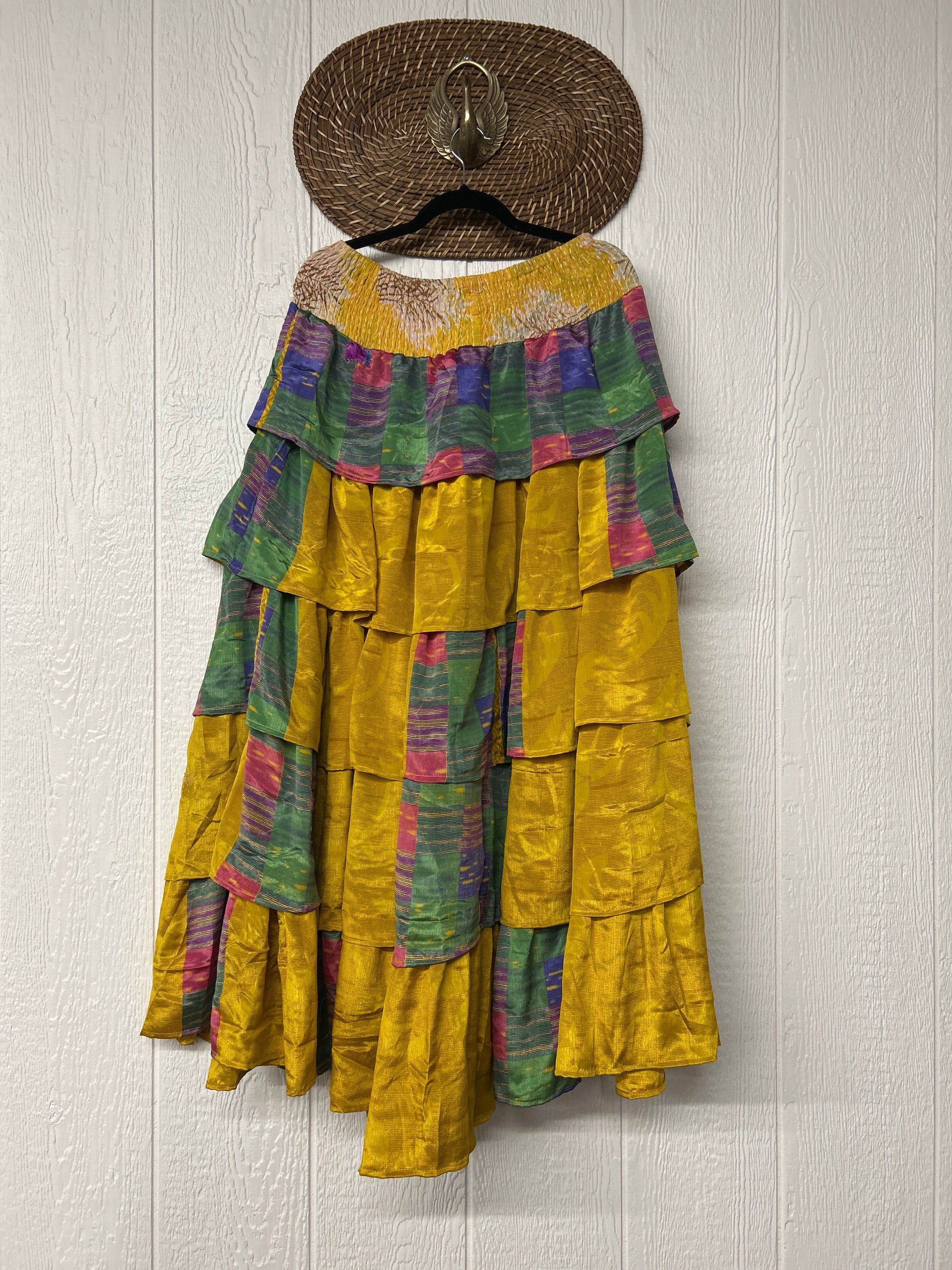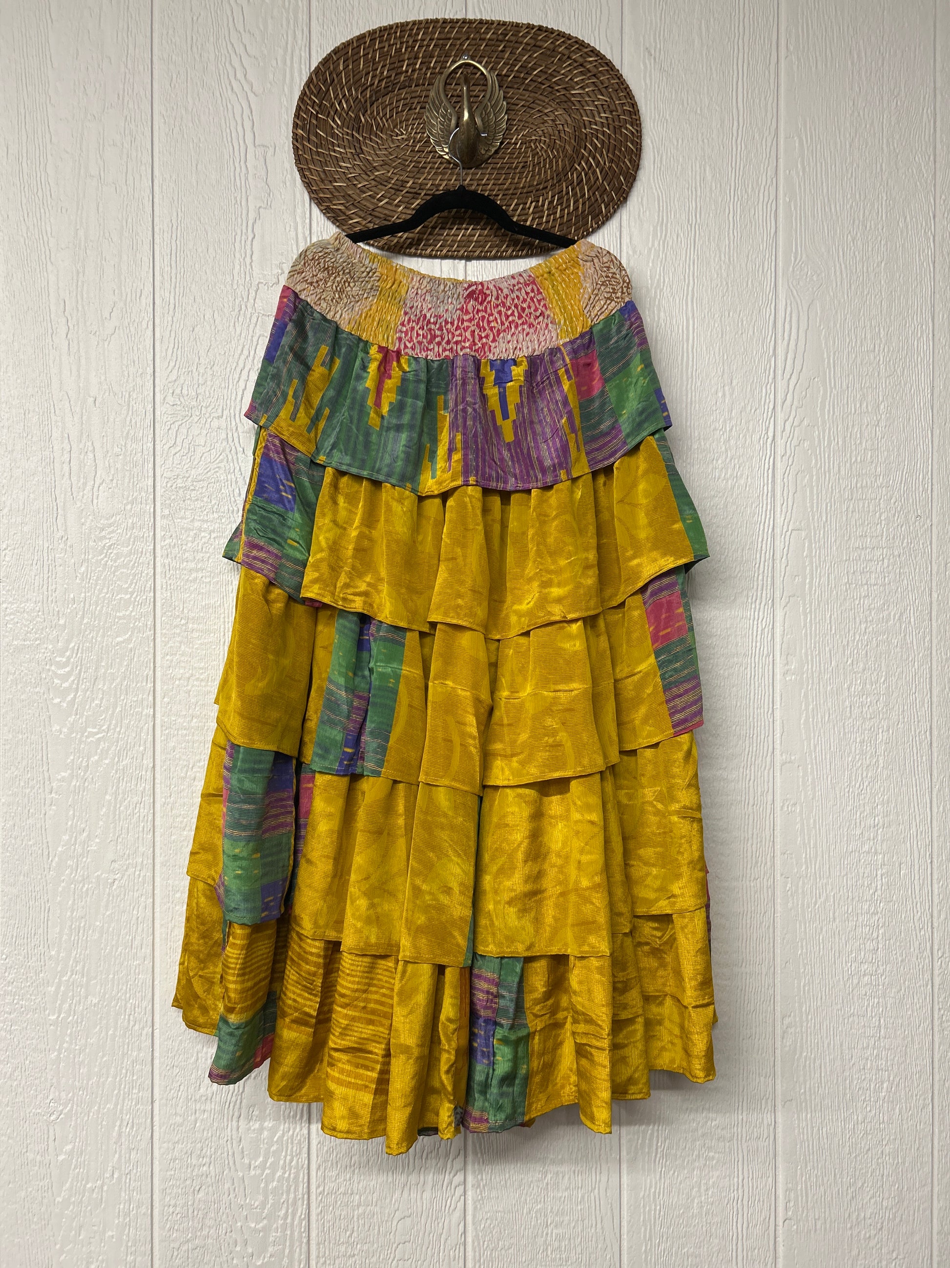 Crafted from vintage rasgulla sari, this ethereal piece features a stretchy ruffle waistband, a tiered floaty ruffle skirt.