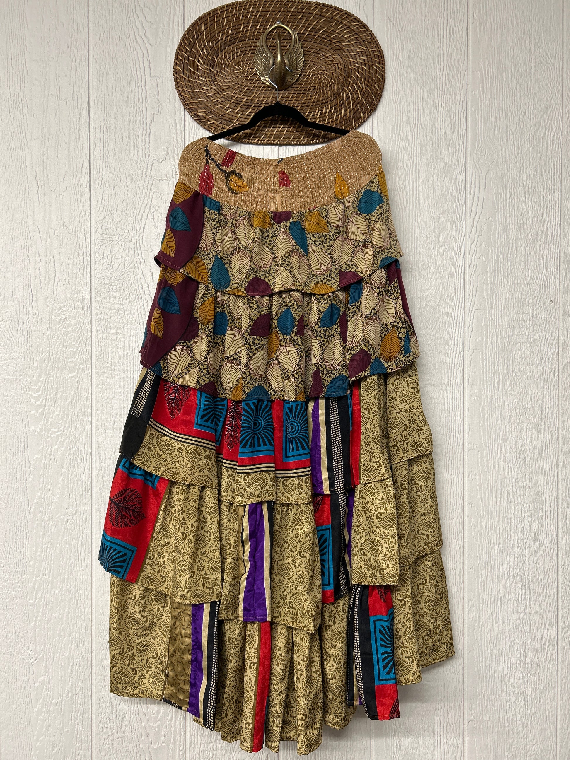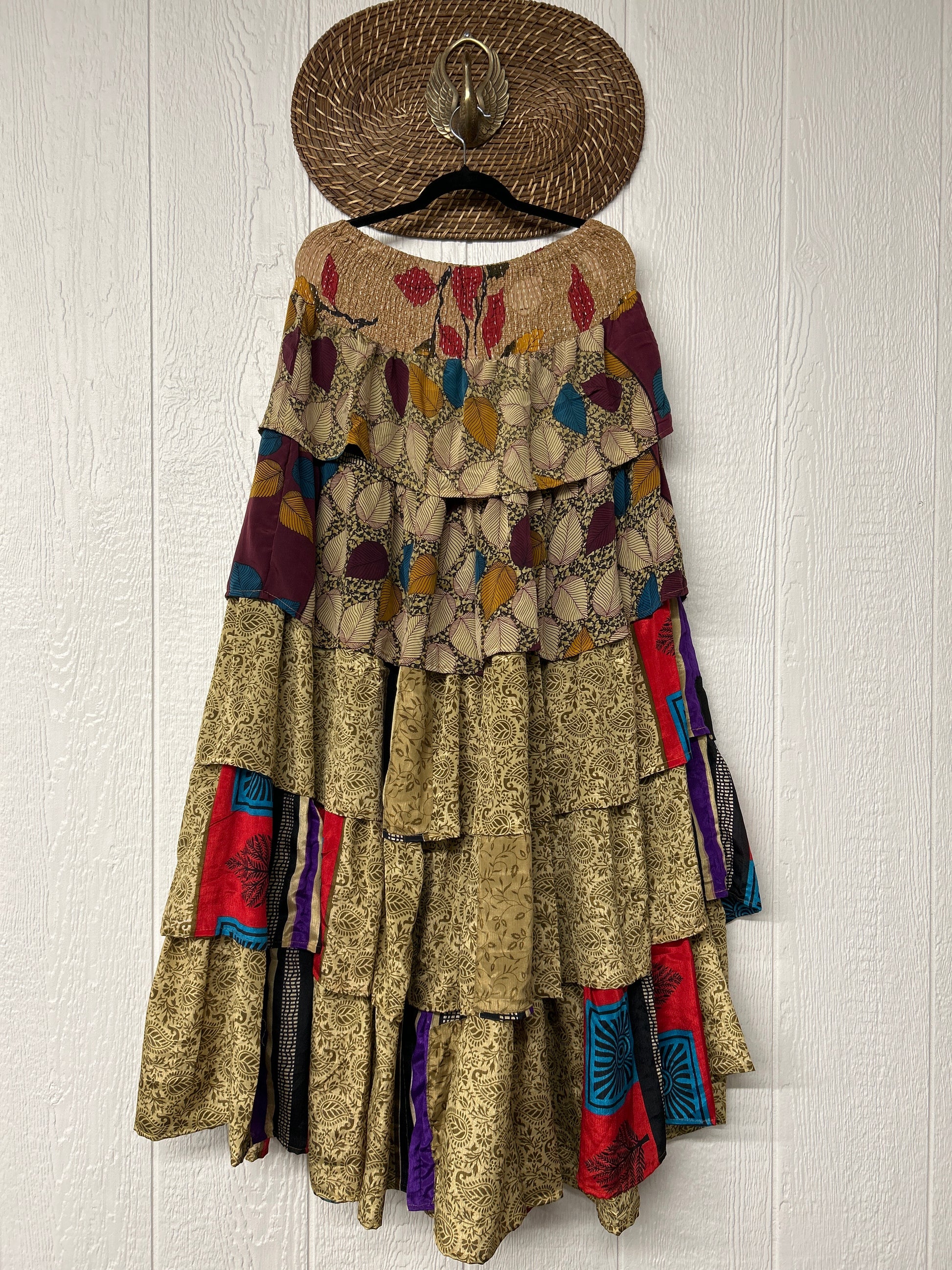 Crafted from vintage rasgulla sari, this ethereal piece features a stretchy ruffle waistband, a tiered floaty ruffle skirt.
