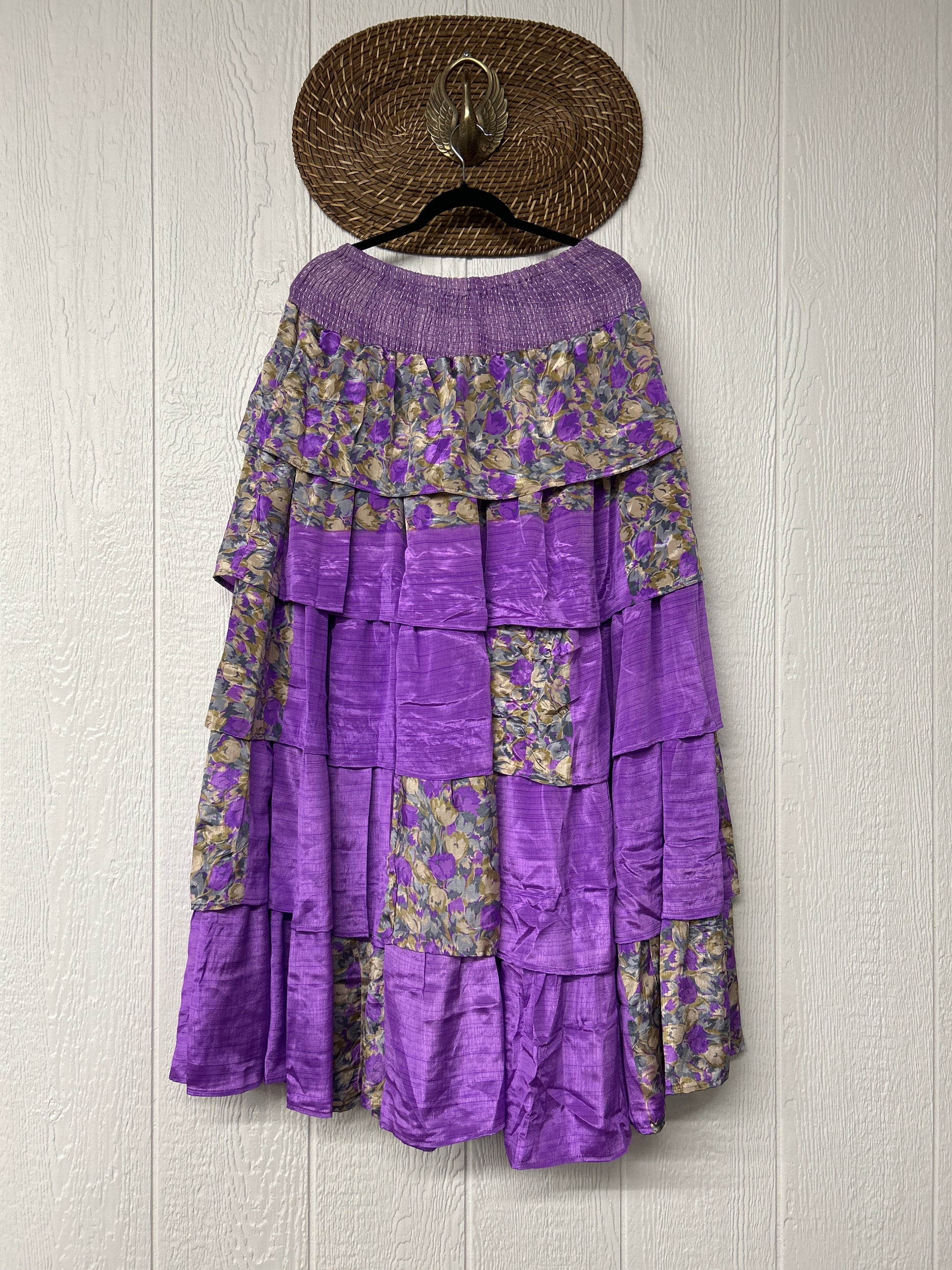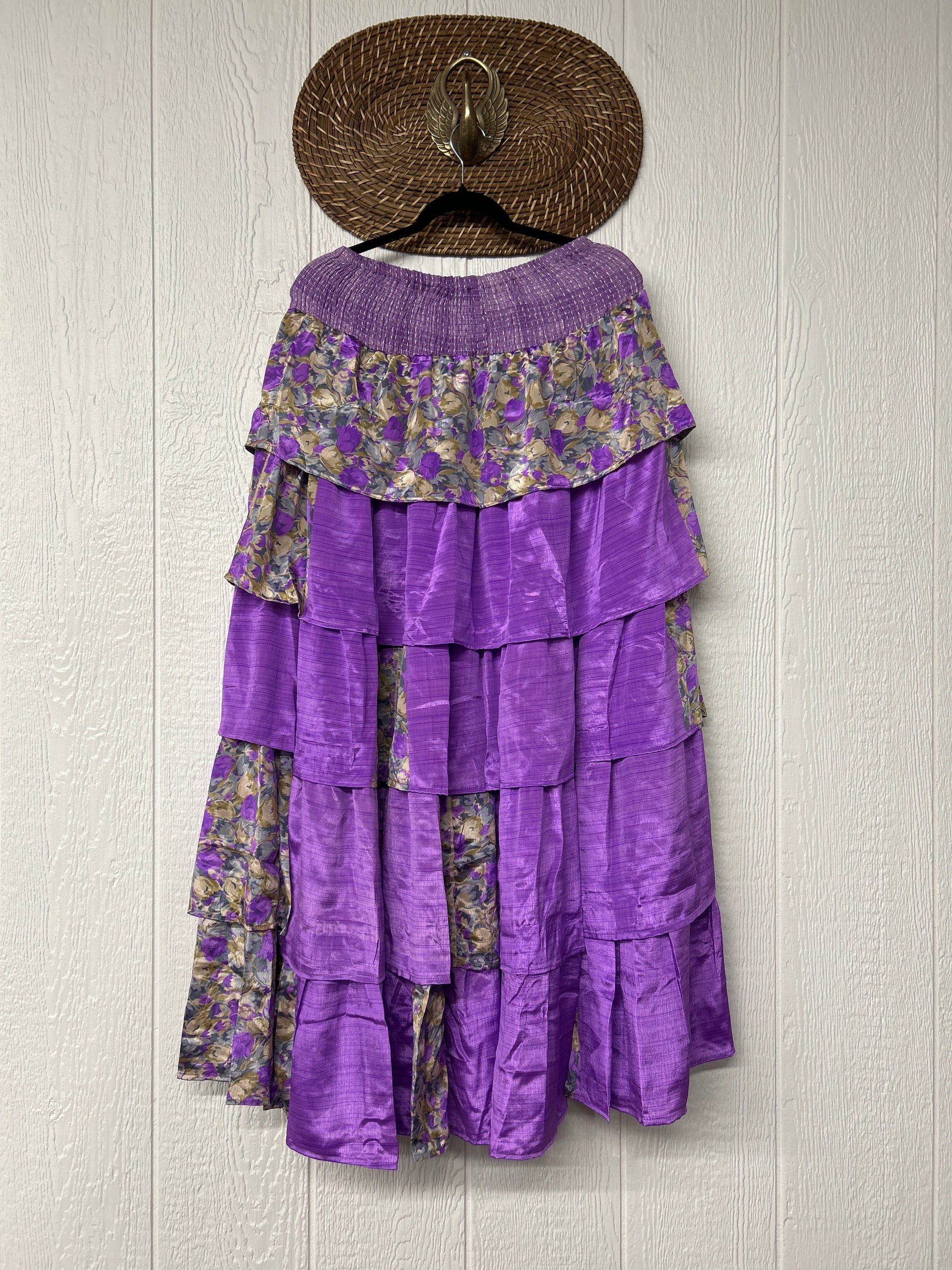 Crafted from vintage rasgulla sari, this ethereal piece features a stretchy ruffle waistband, a tiered floaty ruffle skirt.