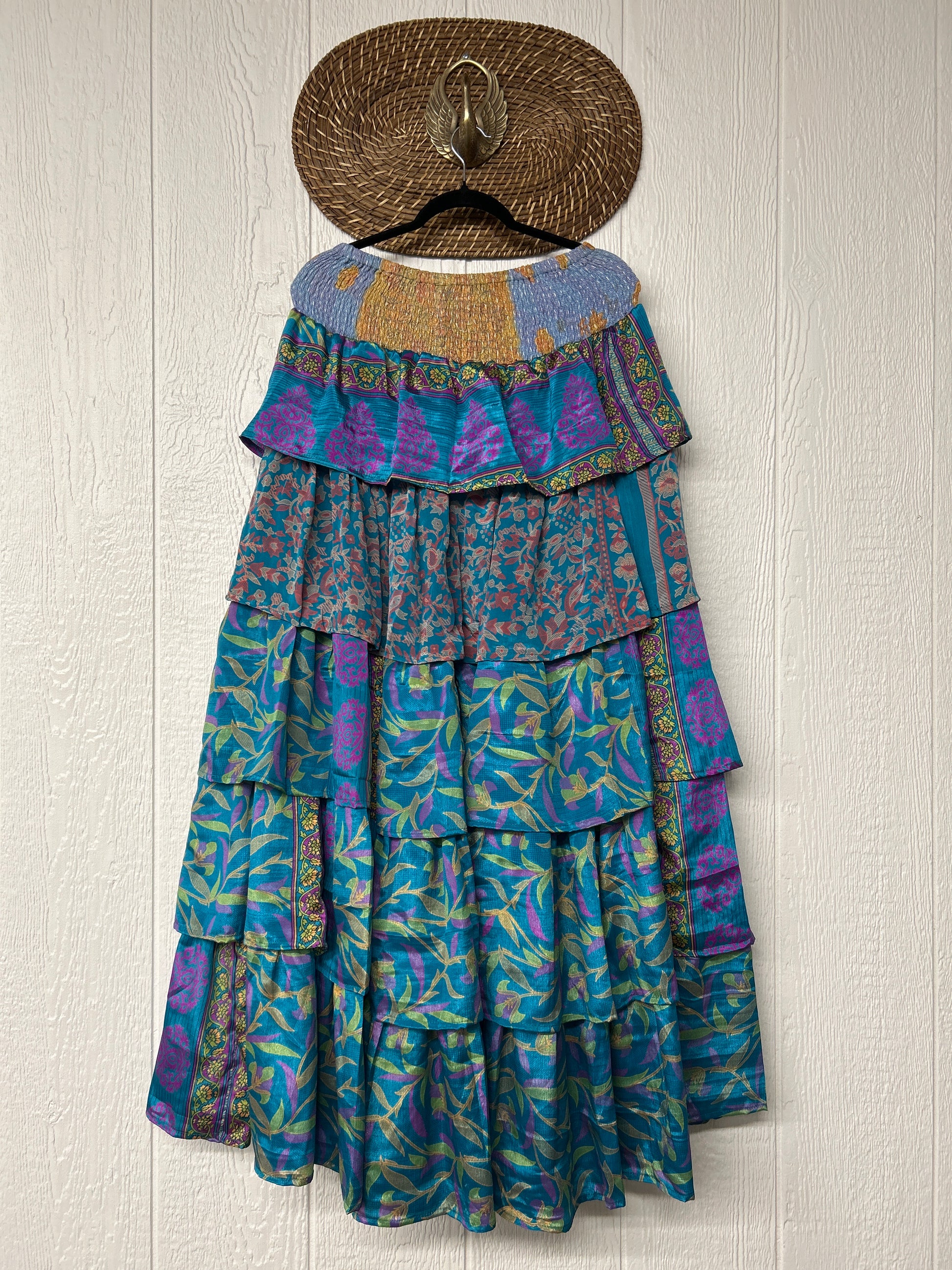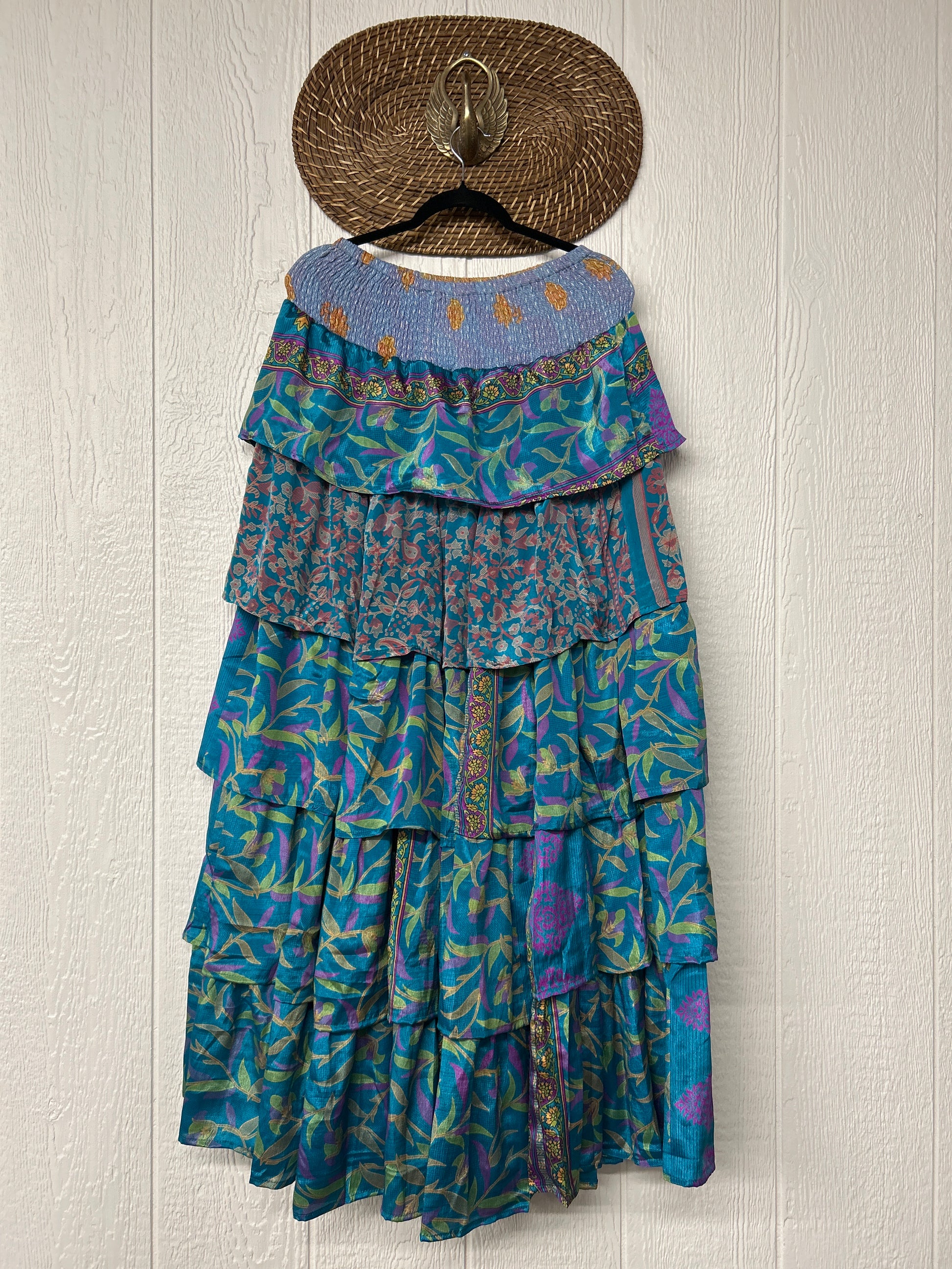 Crafted from vintage rasgulla sari, this ethereal piece features a stretchy ruffle waistband, a tiered floaty ruffle skirt.