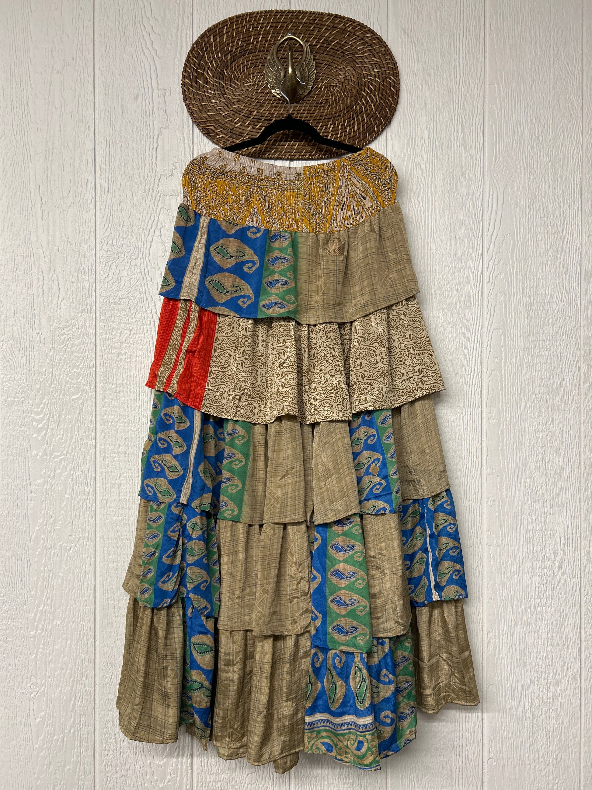 Crafted from vintage rasgulla sari, this ethereal piece features a stretchy ruffle waistband, a tiered floaty ruffle skirt.