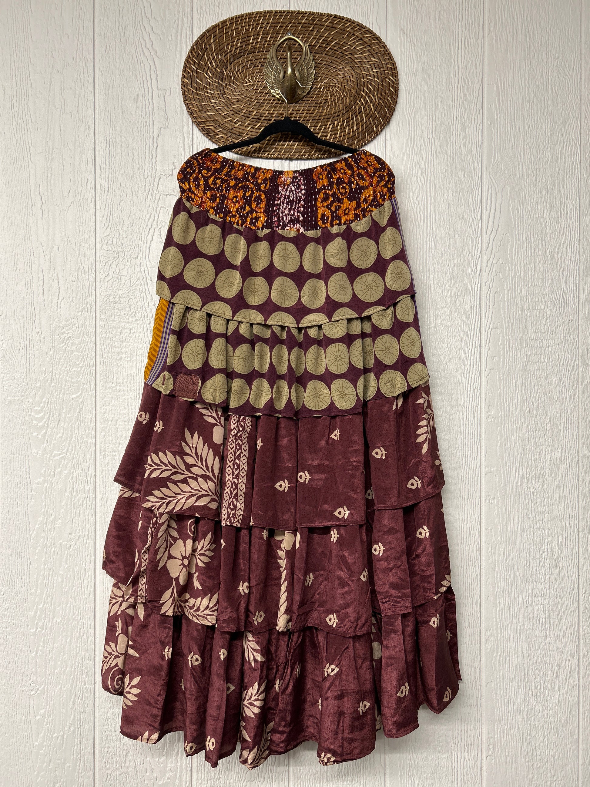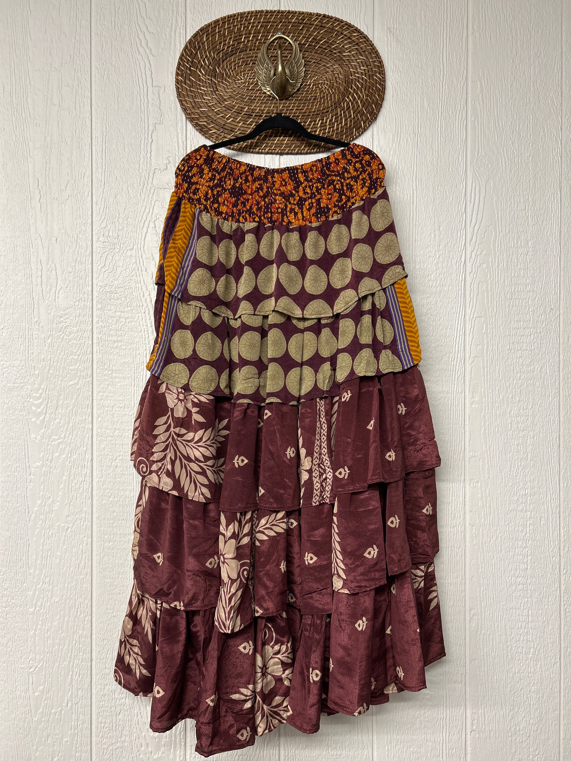 Crafted from vintage rasgulla sari, this ethereal piece features a stretchy ruffle waistband, a tiered floaty ruffle skirt.