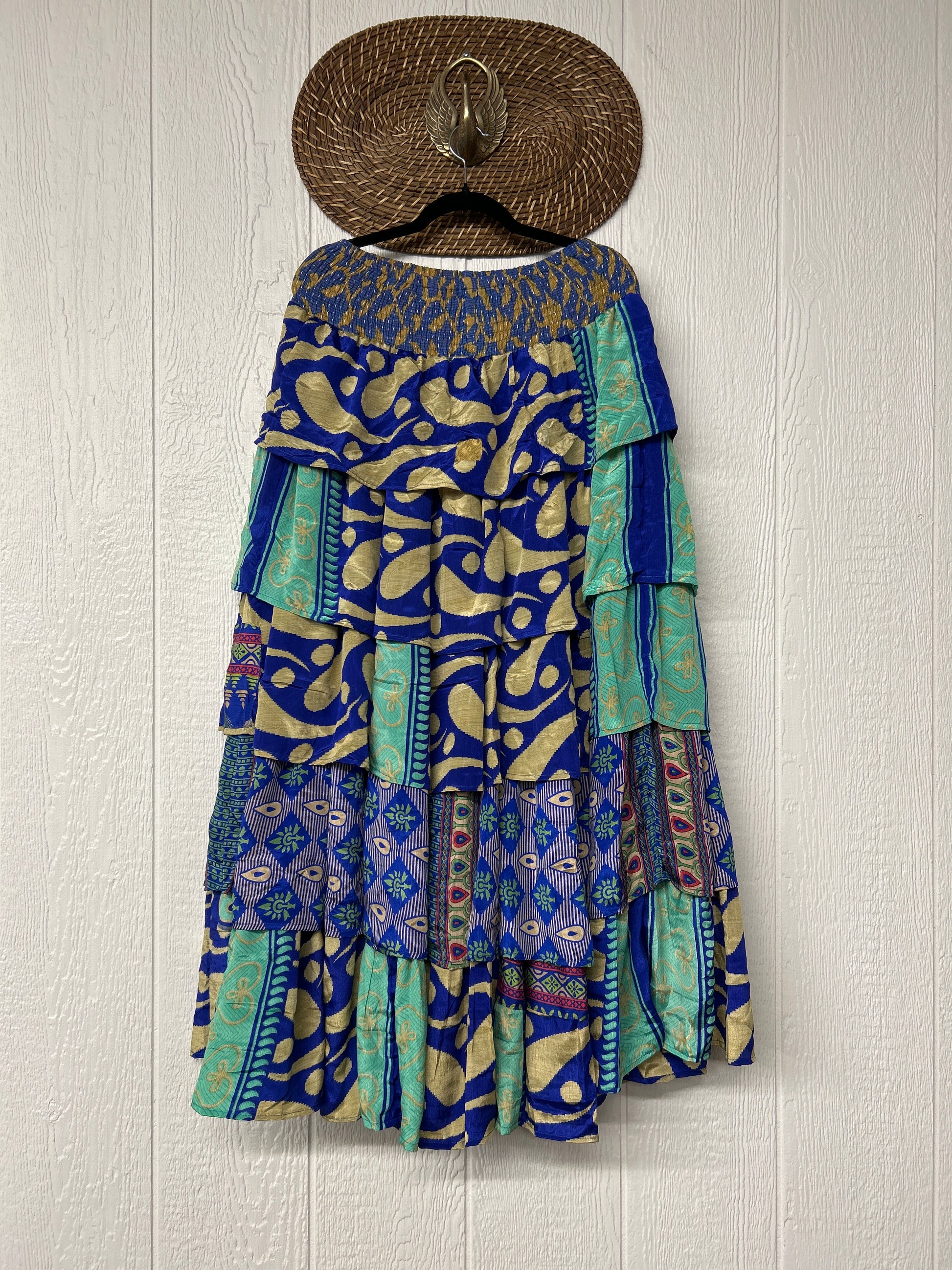 Crafted from vintage rasgulla sari, this ethereal piece features a stretchy ruffle waistband, a tiered floaty ruffle skirt.