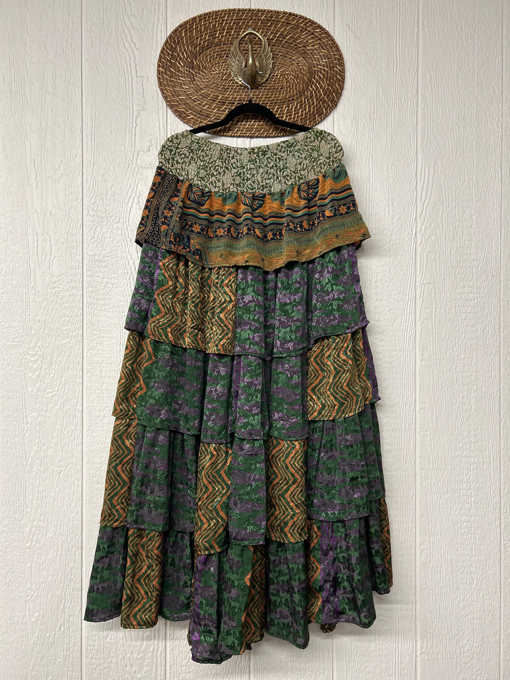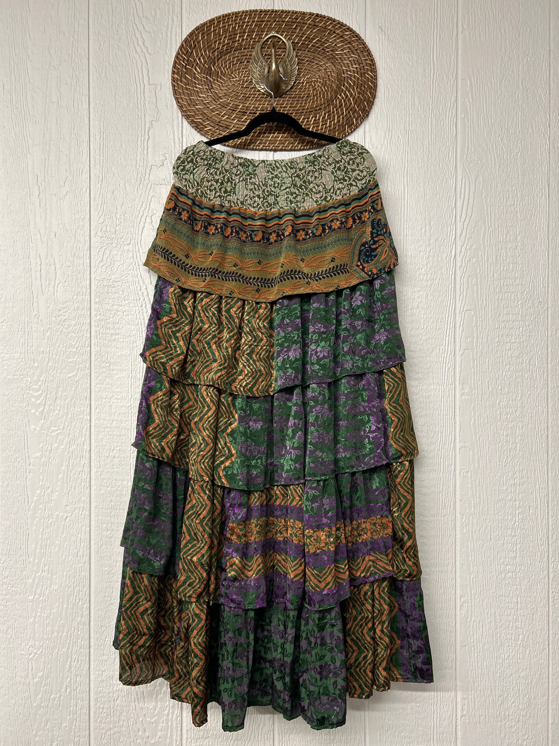 Crafted from vintage rasgulla sari, this ethereal piece features a stretchy ruffle waistband, a tiered floaty ruffle skirt.