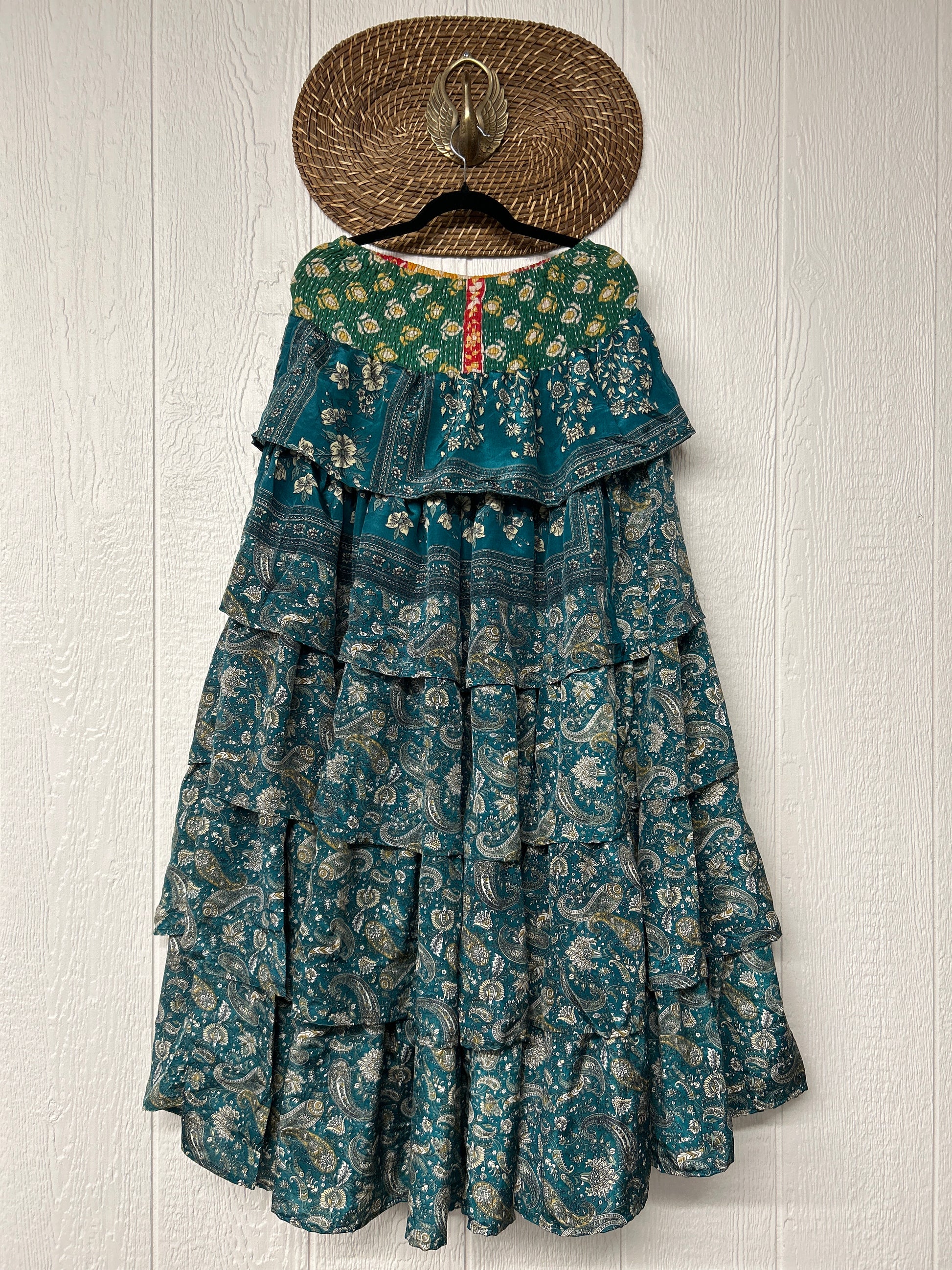 Crafted from vintage rasgulla sari, this ethereal piece features a stretchy ruffle waistband, a tiered floaty ruffle skirt.
