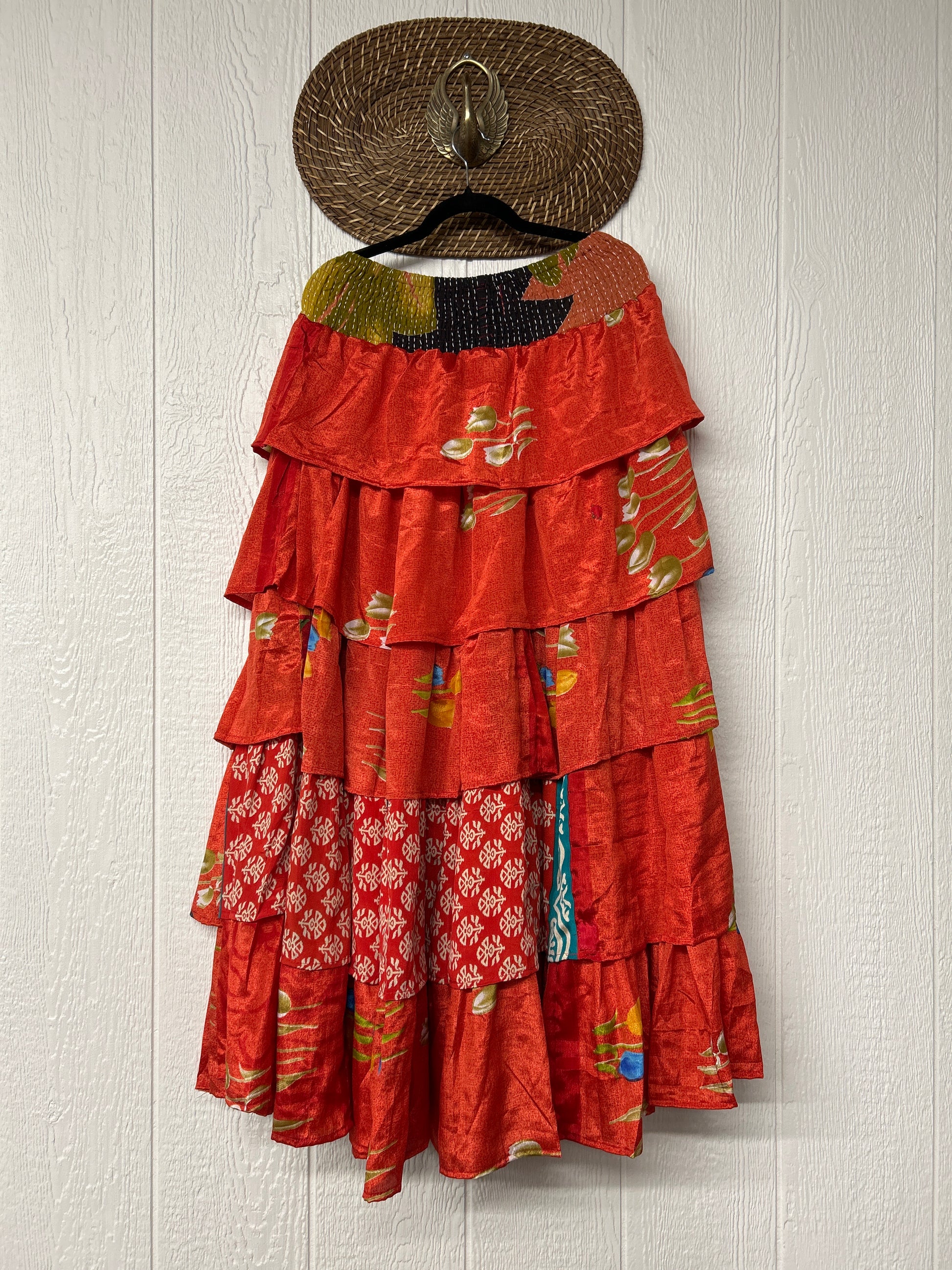 Crafted from vintage rasgulla sari, this ethereal piece features a stretchy ruffle waistband, a tiered floaty ruffle skirt.