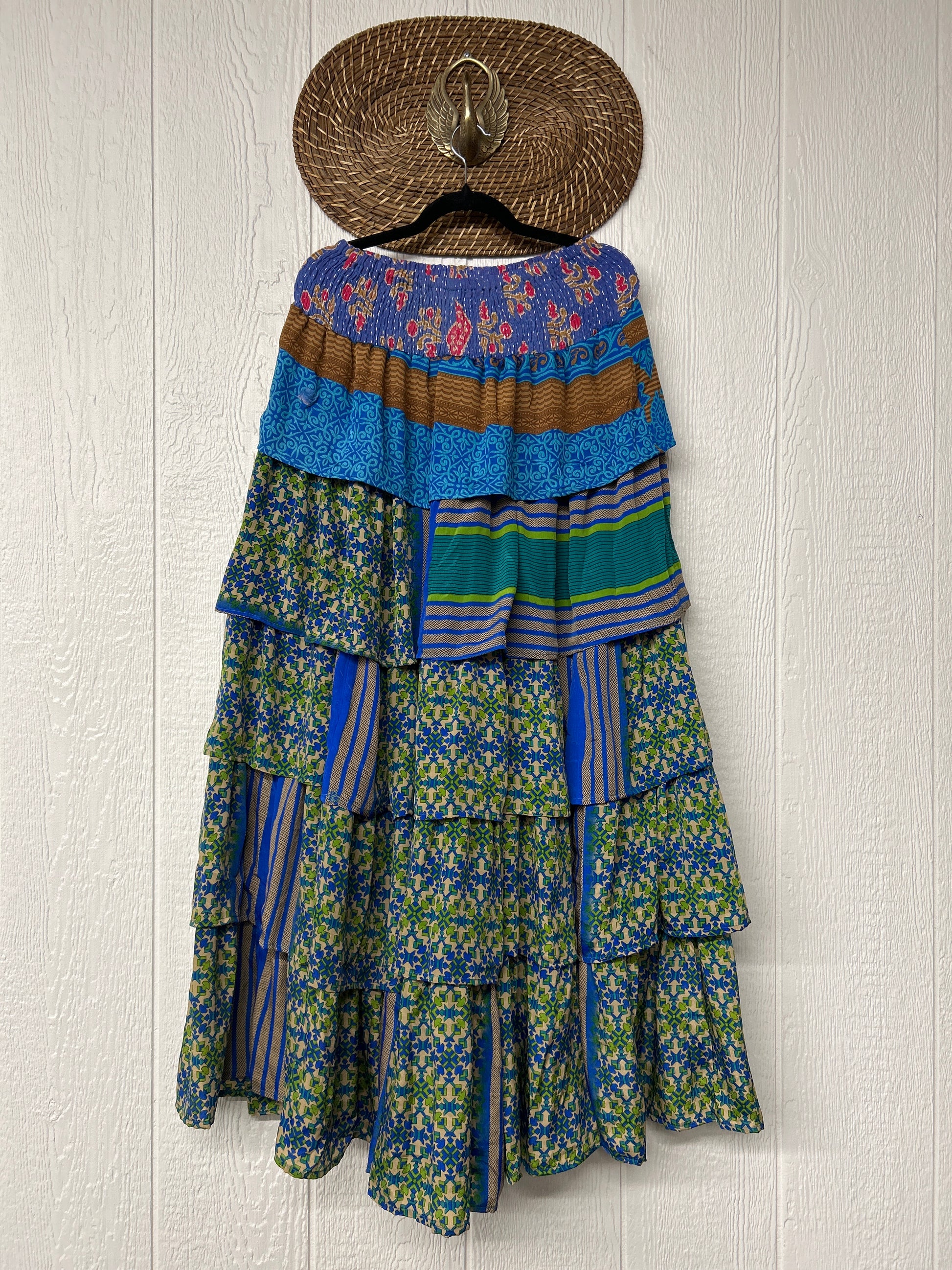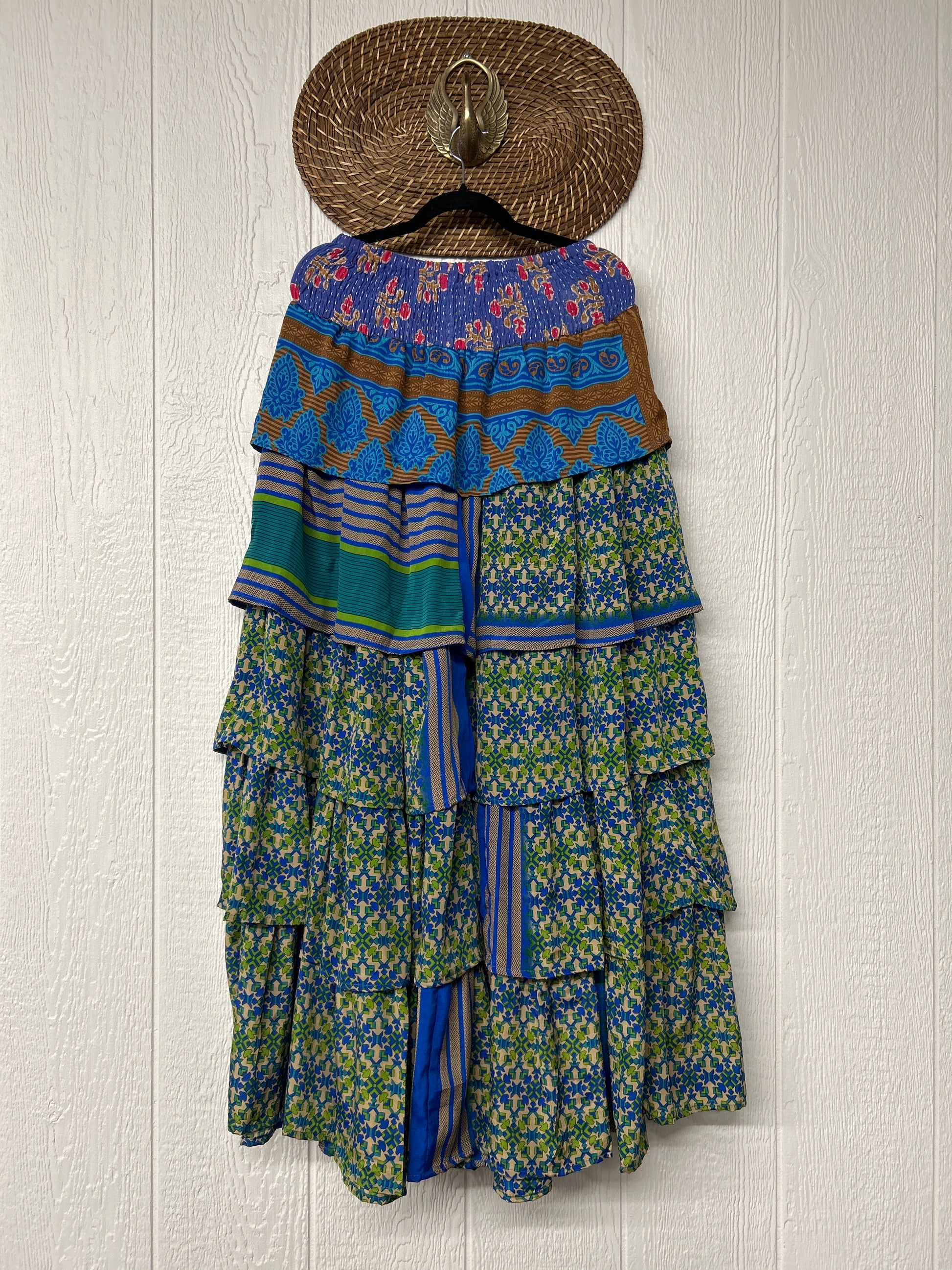 Crafted from vintage rasgulla sari, this ethereal piece features a stretchy ruffle waistband, a tiered floaty ruffle skirt.