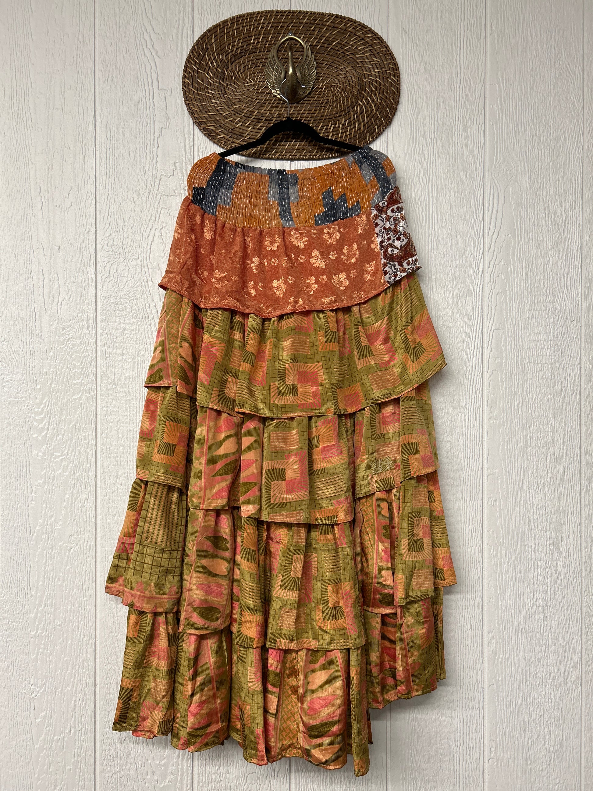 Crafted from vintage rasgulla sari, this ethereal piece features a stretchy ruffle waistband, a tiered floaty ruffle skirt.