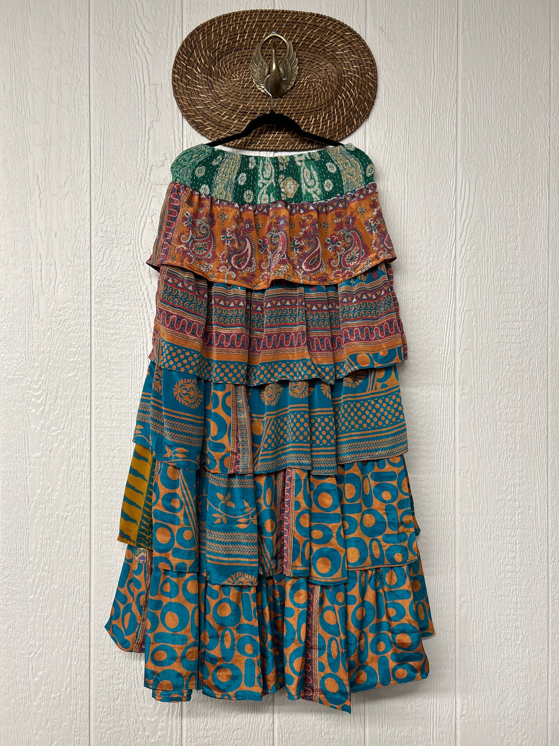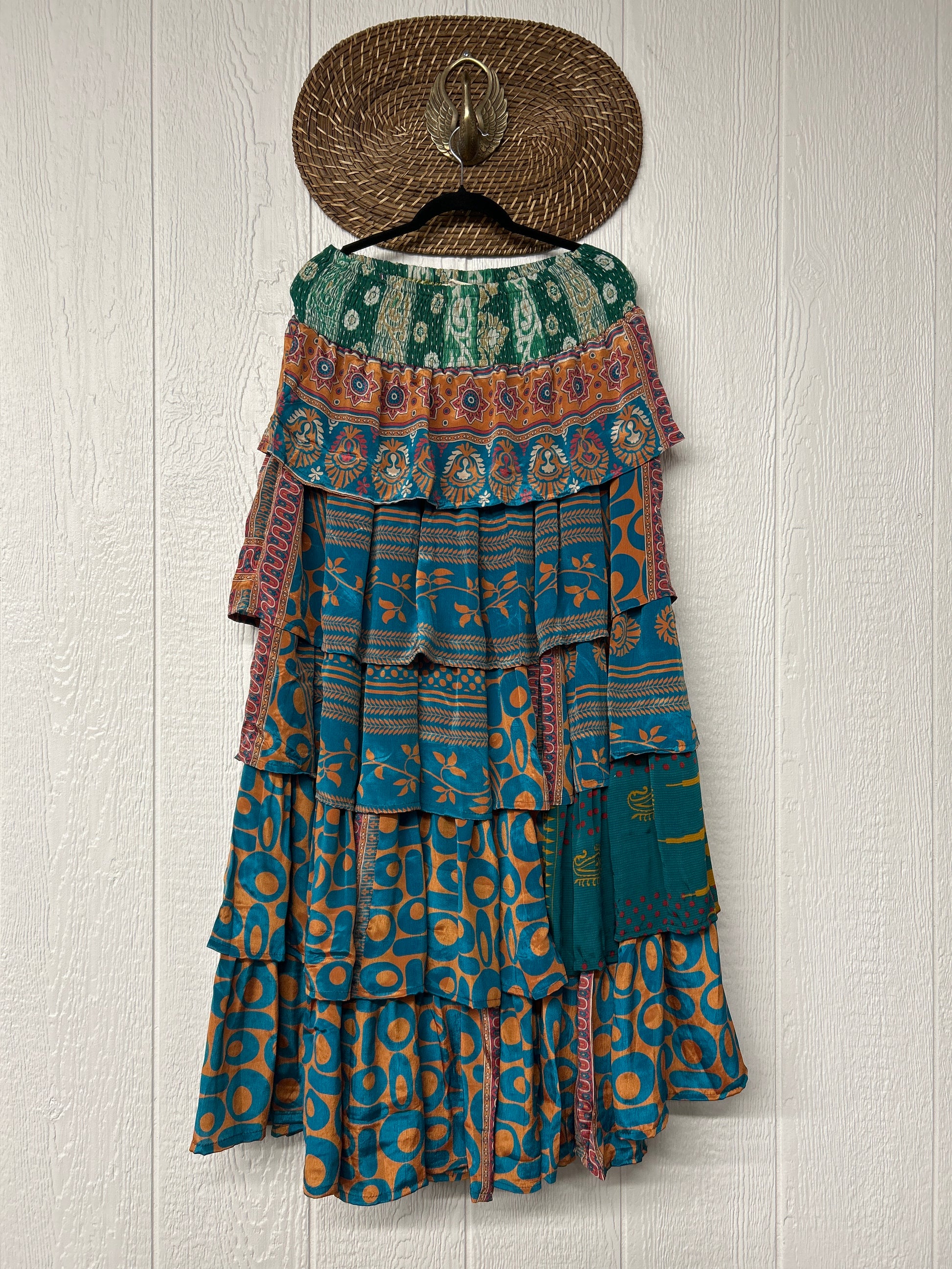 Crafted from vintage rasgulla sari, this ethereal piece features a stretchy ruffle waistband, a tiered floaty ruffle skirt.