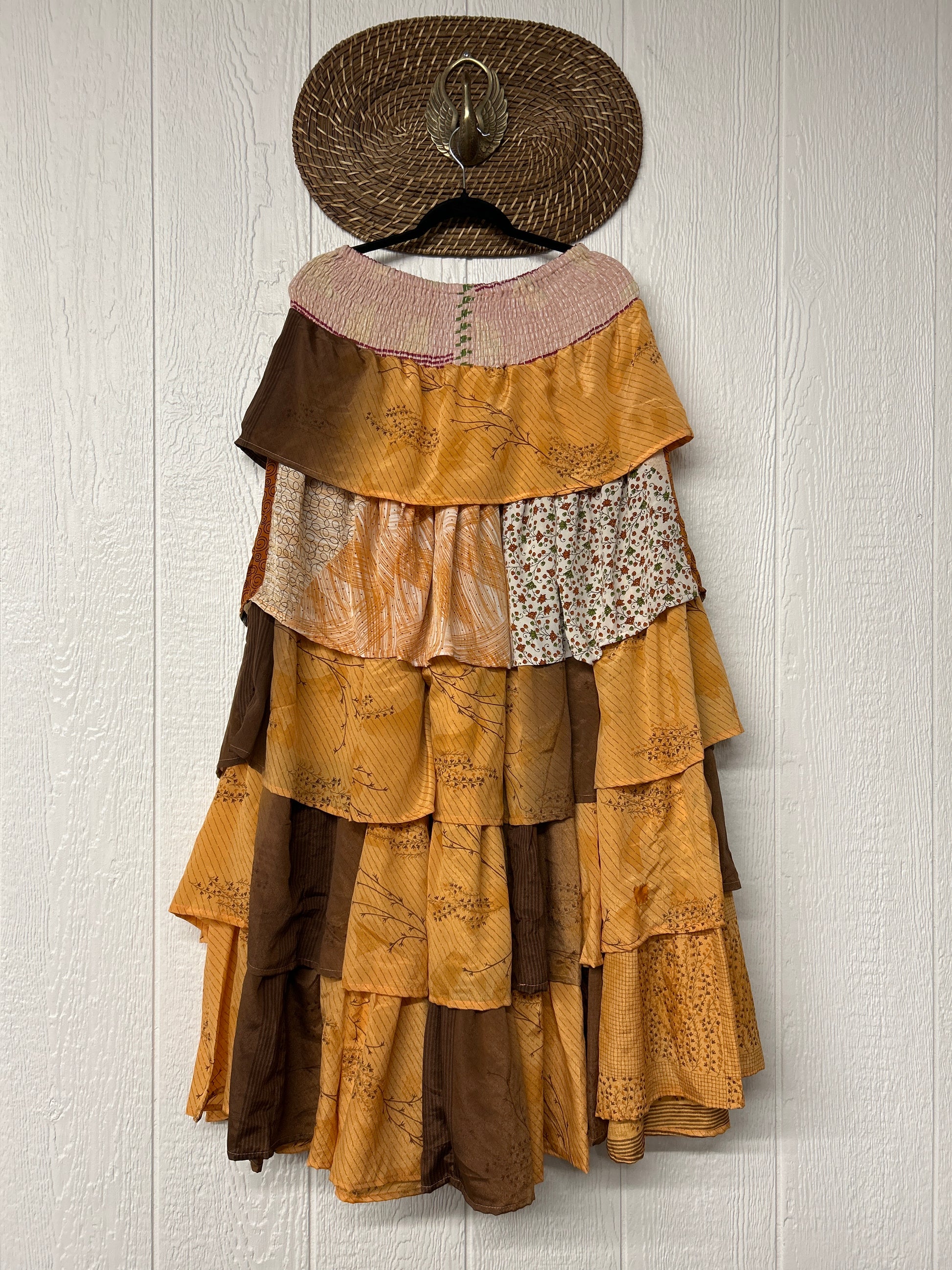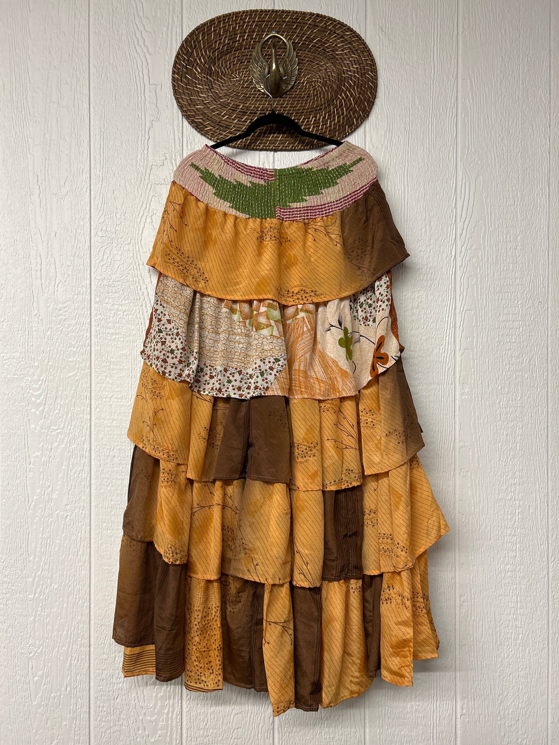 Crafted from vintage rasgulla sari, this ethereal piece features a stretchy ruffle waistband, a tiered floaty ruffle skirt.