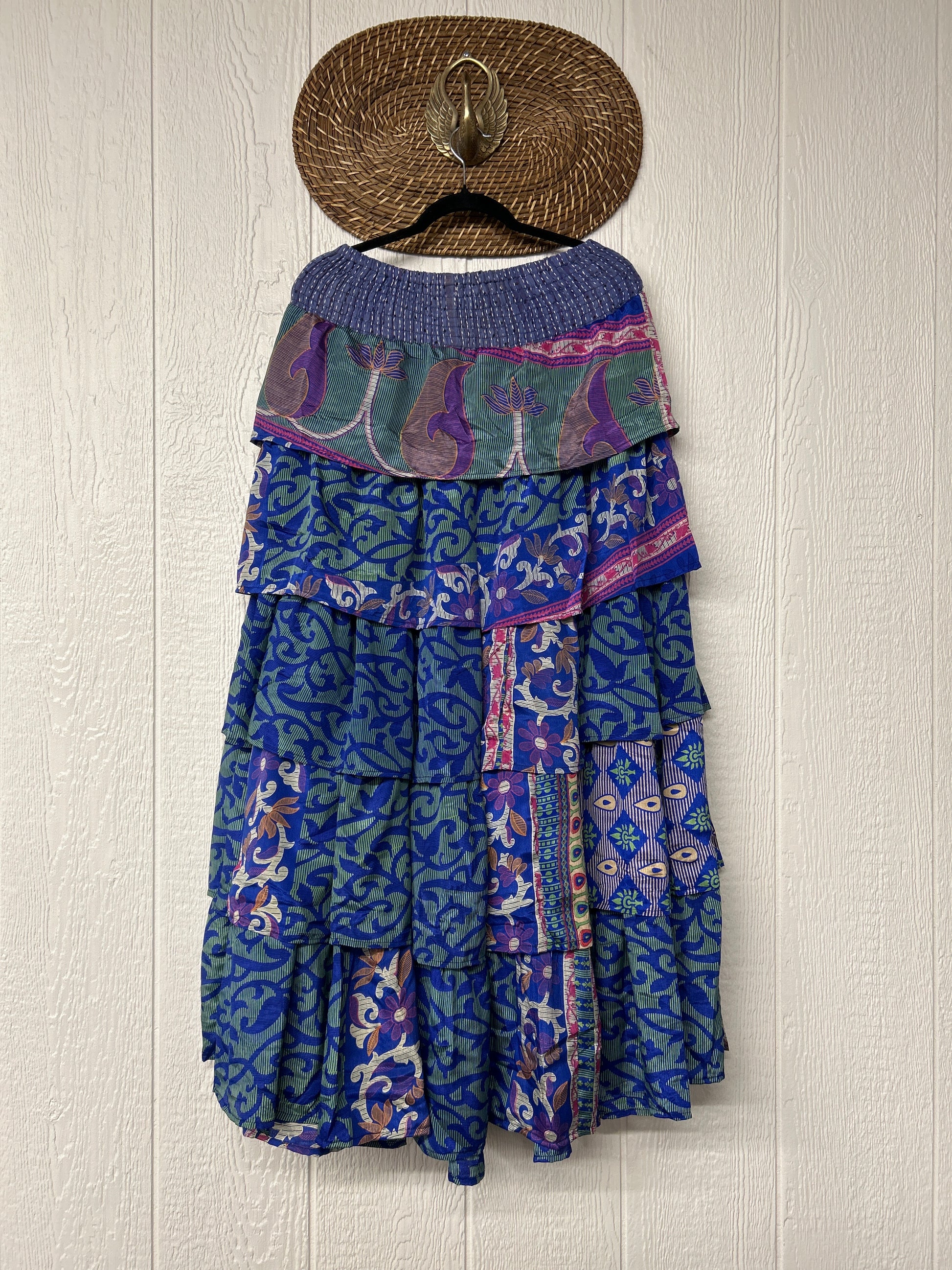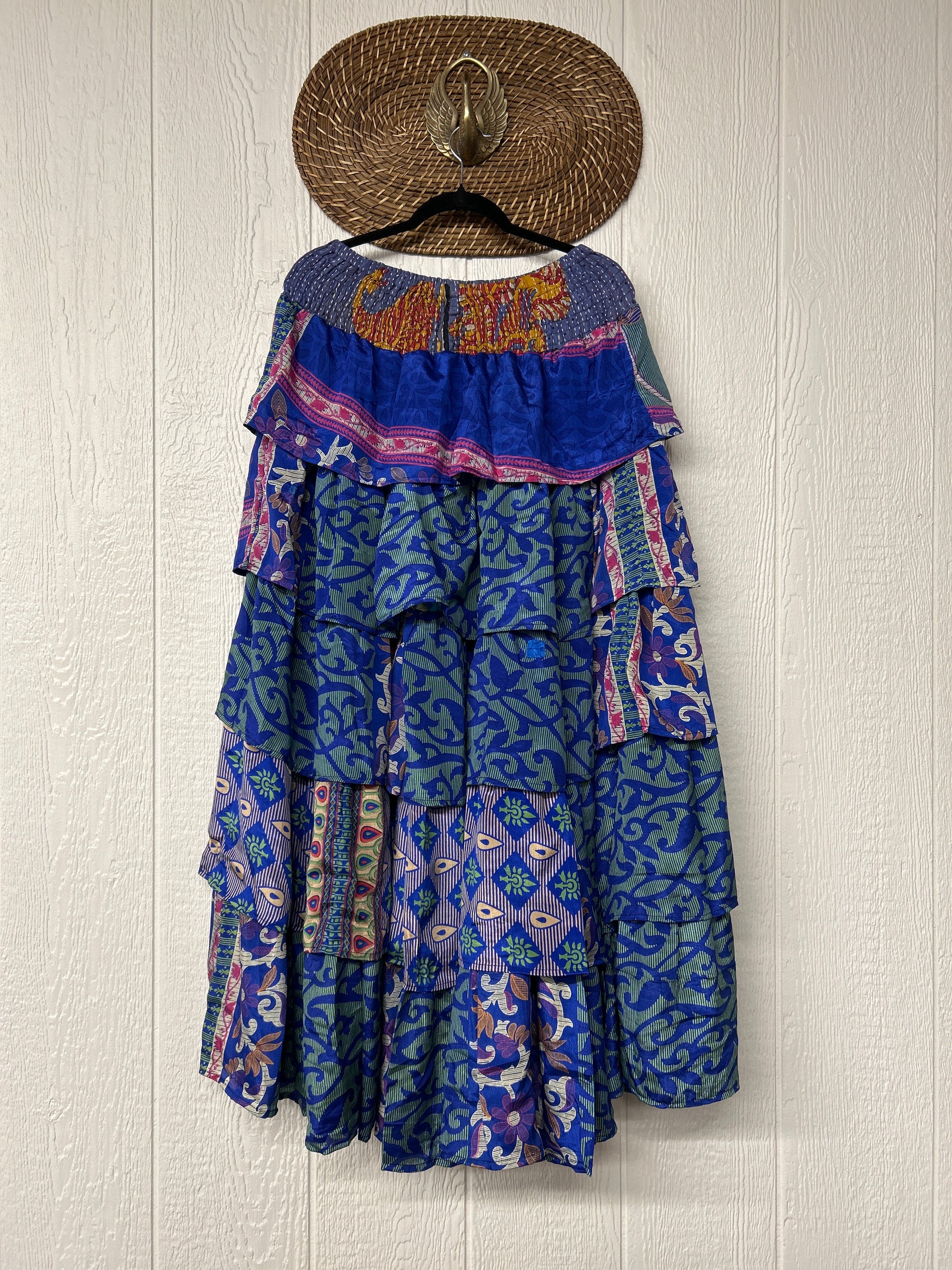 Crafted from vintage rasgulla sari, this ethereal piece features a stretchy ruffle waistband, a tiered floaty ruffle skirt.