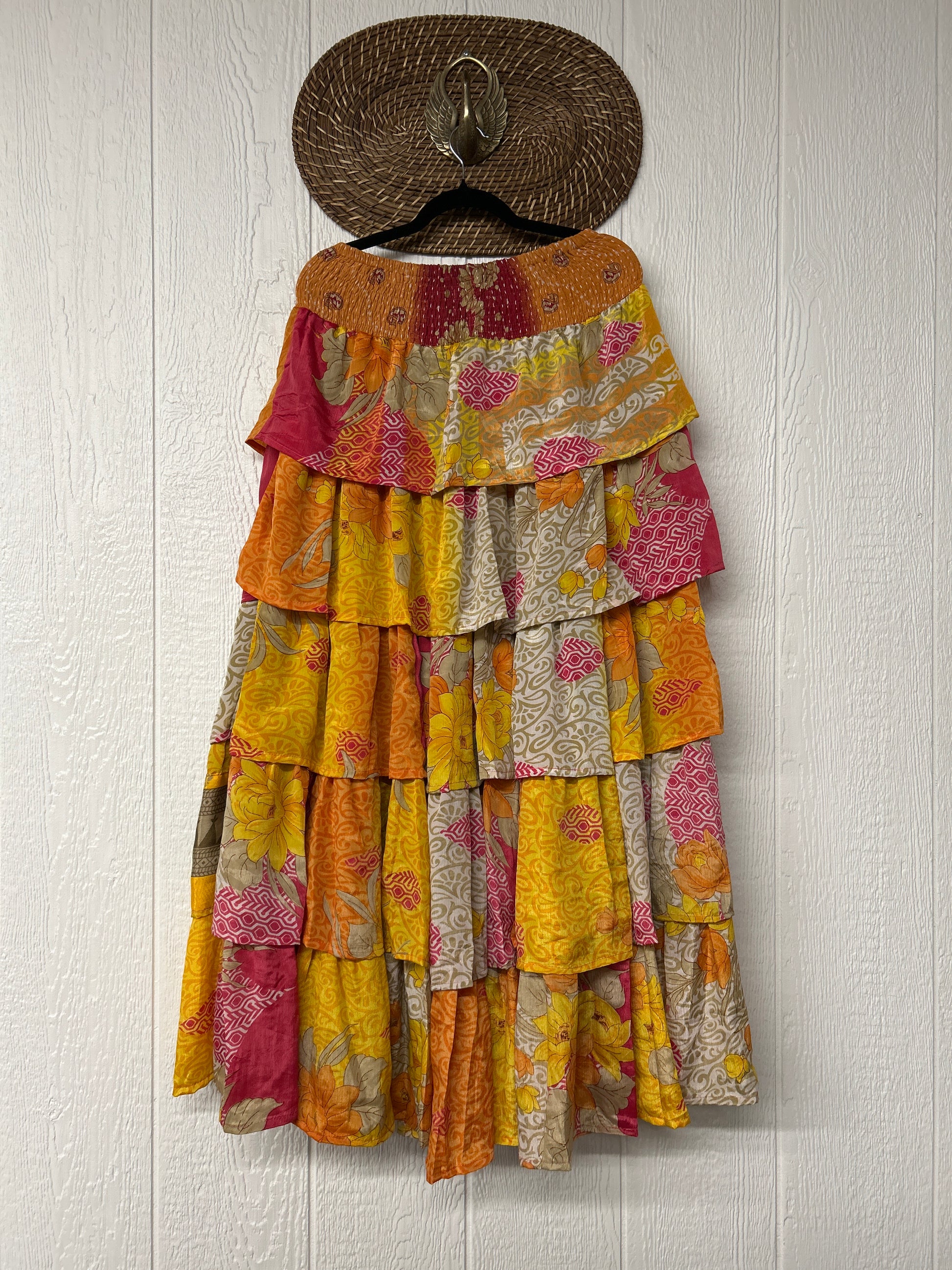 Crafted from vintage rasgulla sari, this ethereal piece features a stretchy ruffle waistband, a tiered floaty ruffle skirt.