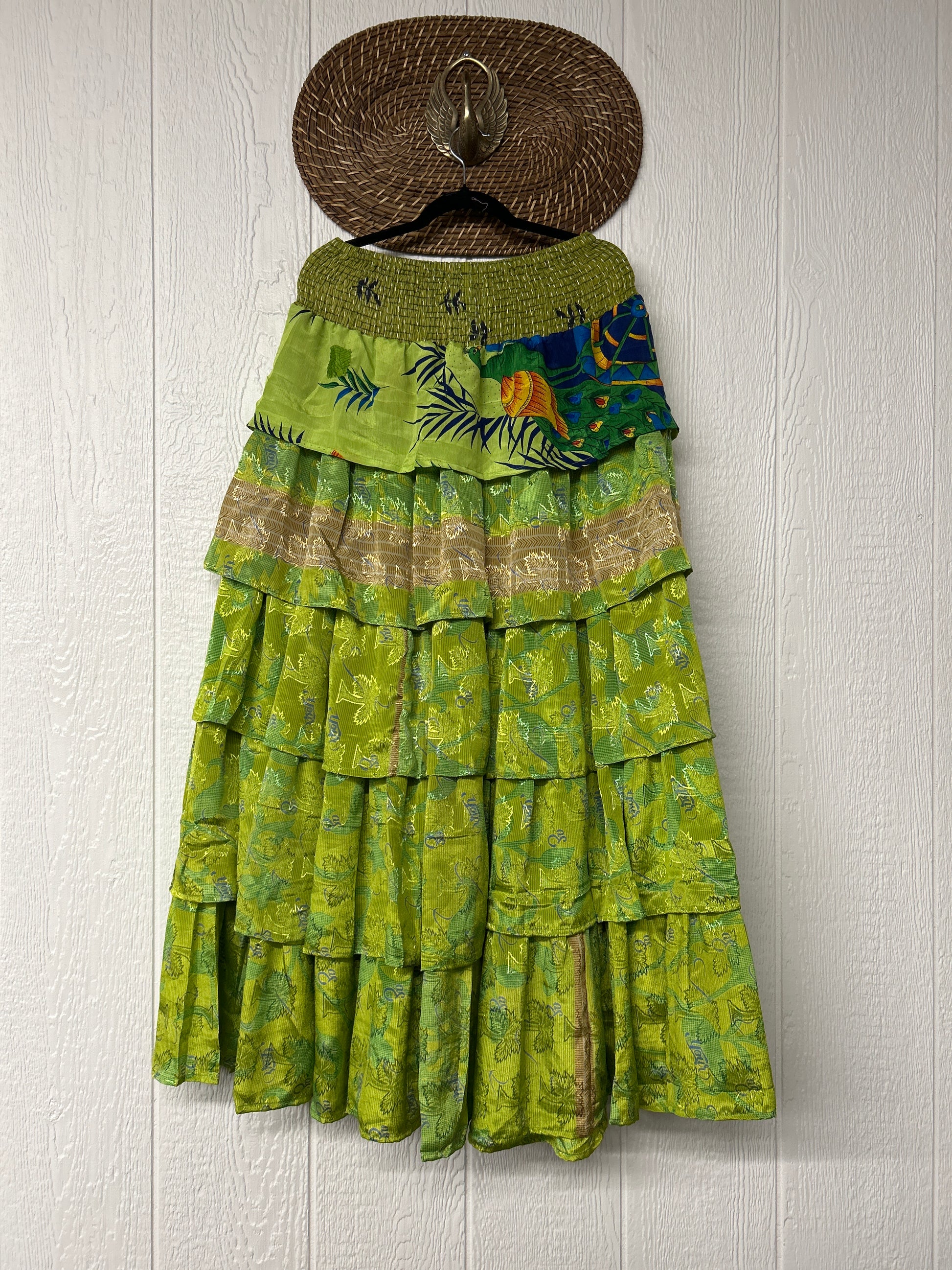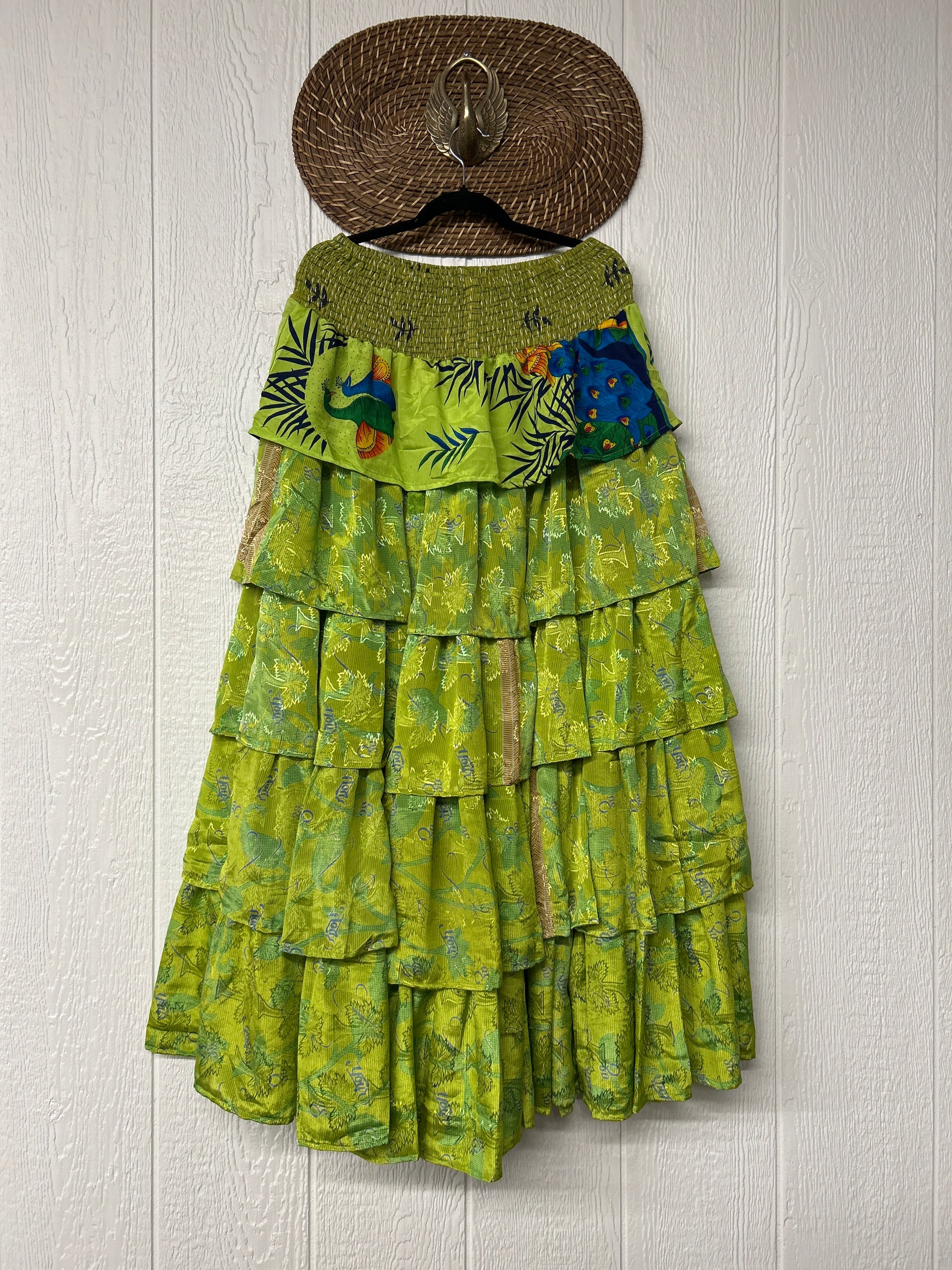 Crafted from vintage rasgulla sari, this ethereal piece features a stretchy ruffle waistband, a tiered floaty ruffle skirt.