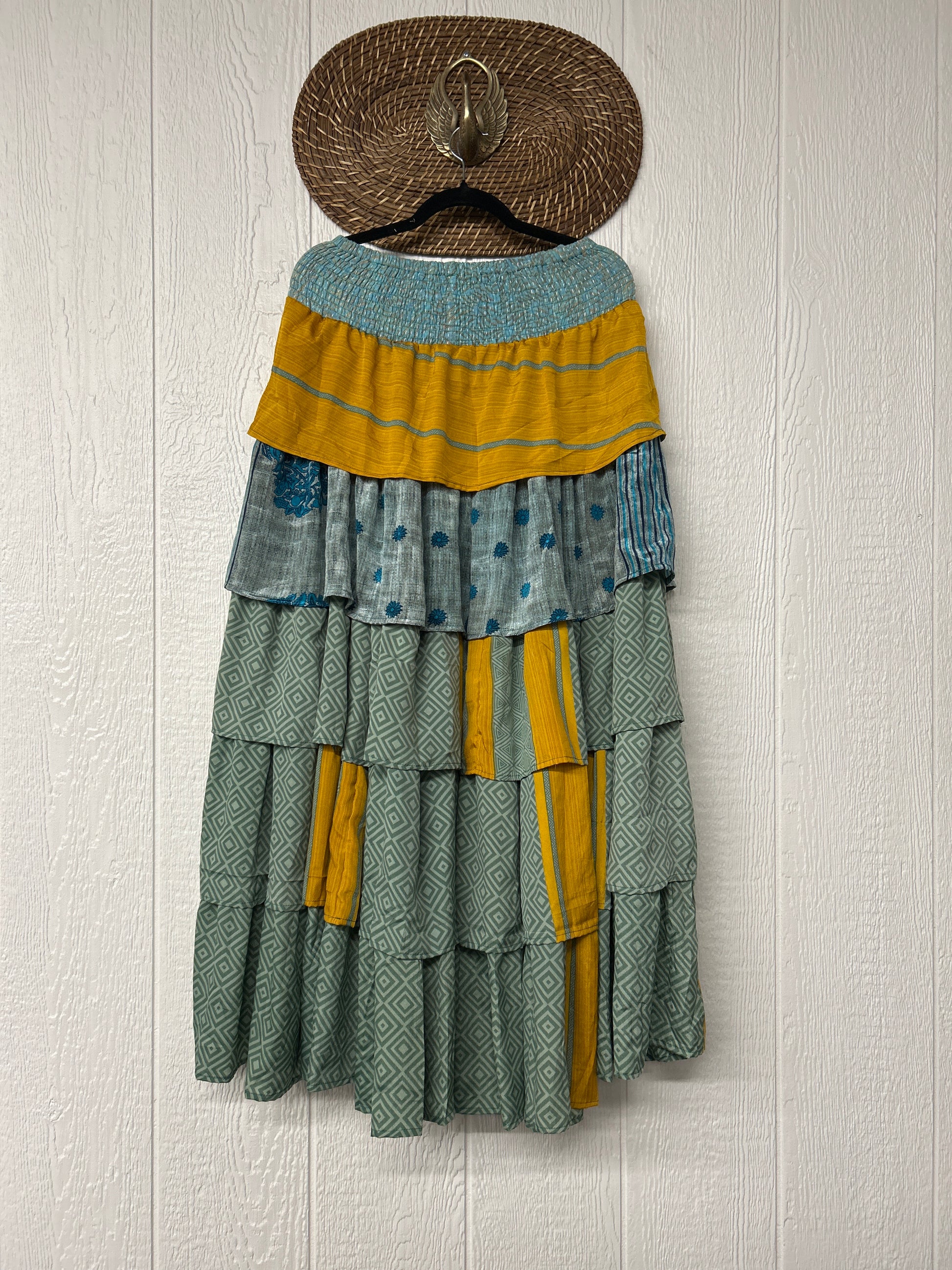 Crafted from vintage rasgulla sari, this ethereal piece features a stretchy ruffle waistband, a tiered floaty ruffle skirt.