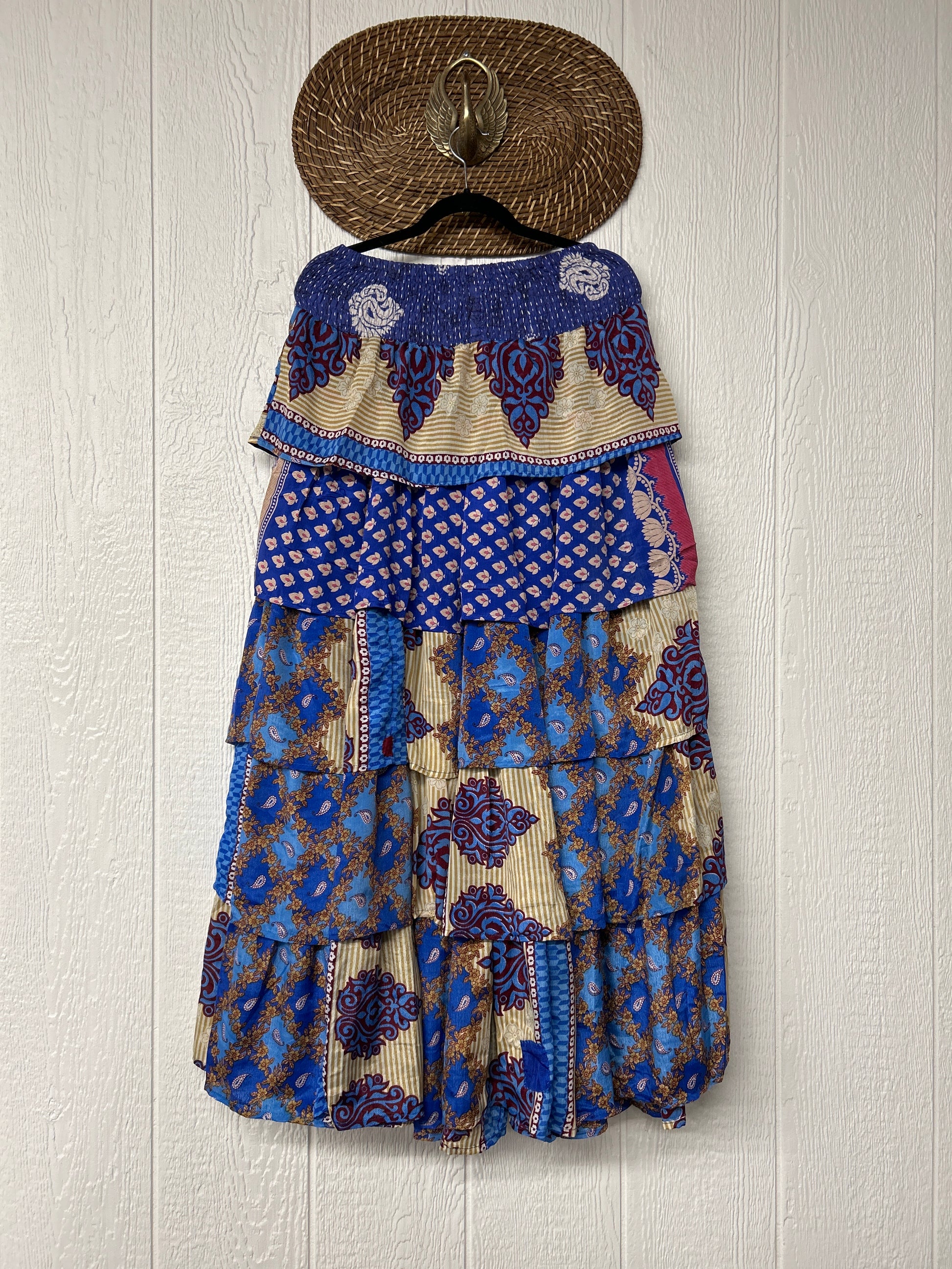 Crafted from vintage rasgulla sari, this ethereal piece features a stretchy ruffle waistband, a tiered floaty ruffle skirt.