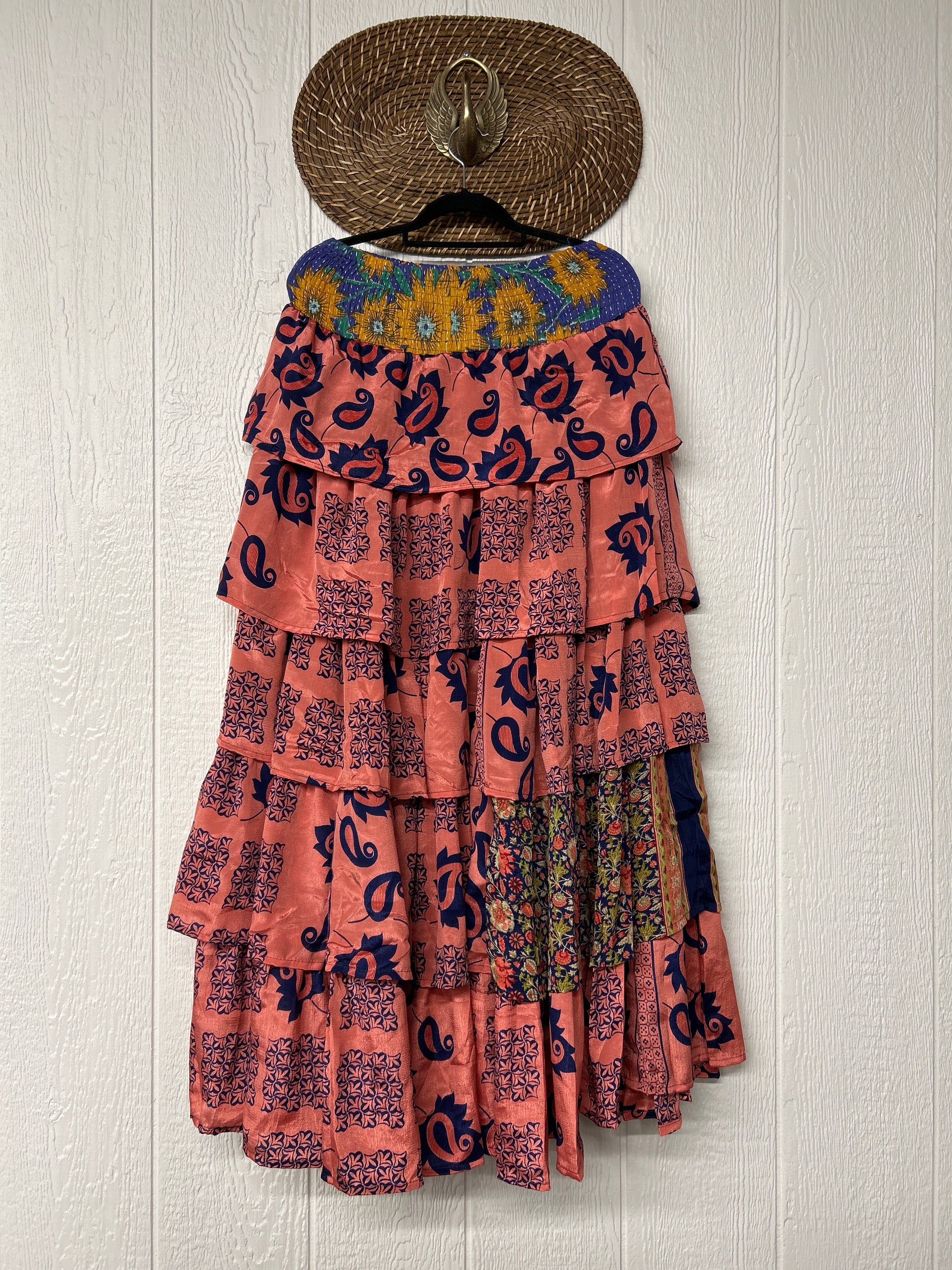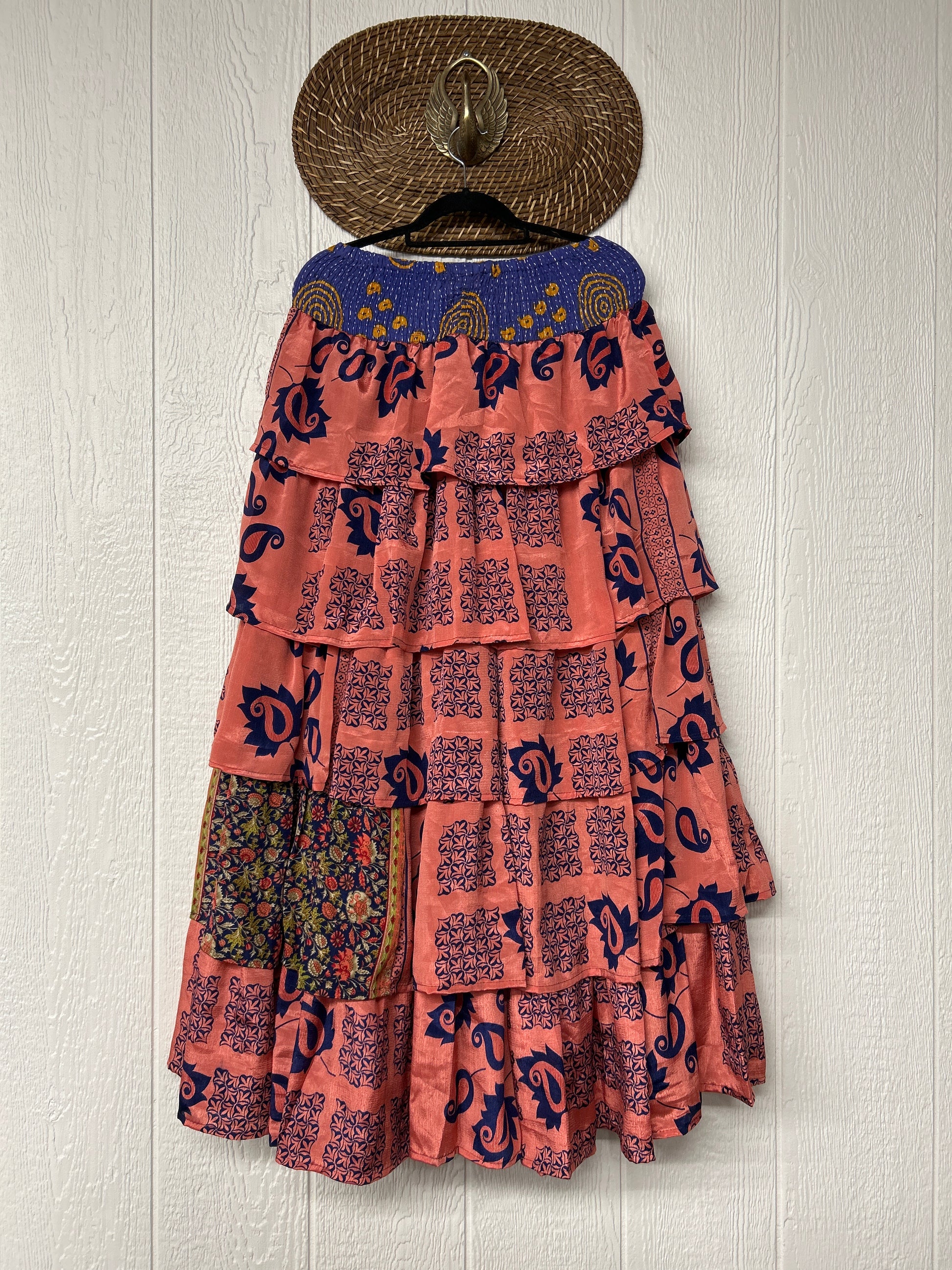 Crafted from vintage rasgulla sari, this ethereal piece features a stretchy ruffle waistband, a tiered floaty ruffle skirt.