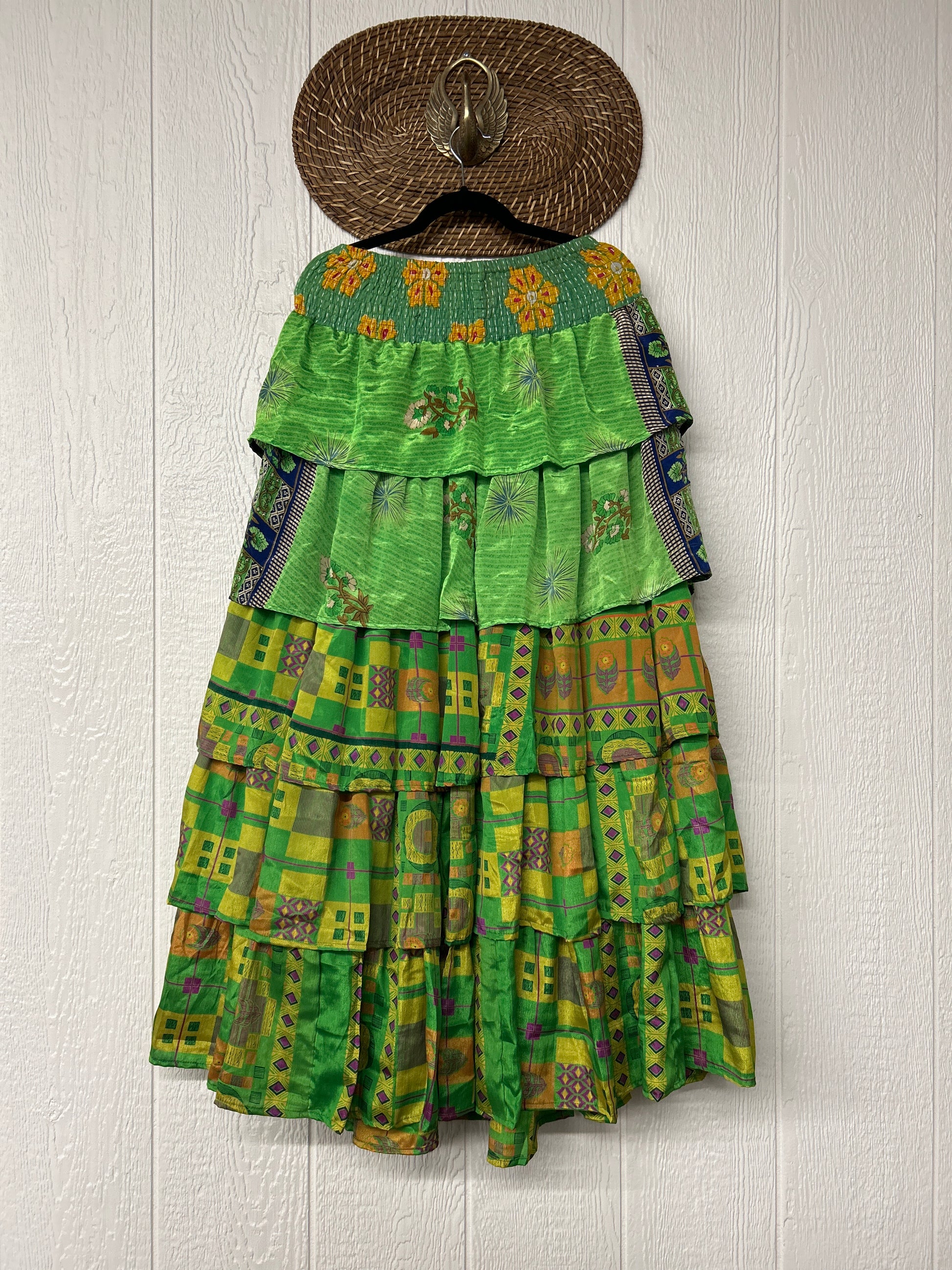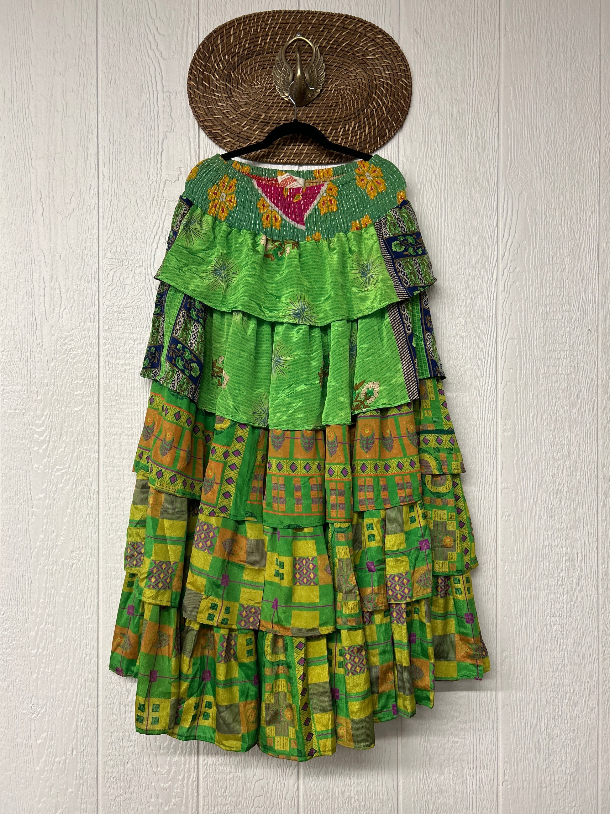 Crafted from vintage rasgulla sari, this ethereal piece features a stretchy ruffle waistband, a tiered floaty ruffle skirt.