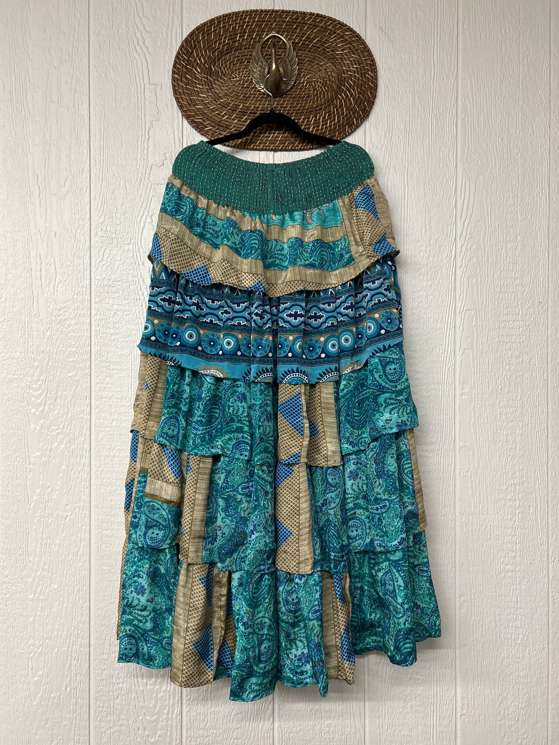 Crafted from vintage rasgulla sari, this ethereal piece features a stretchy ruffle waistband, a tiered floaty ruffle skirt.