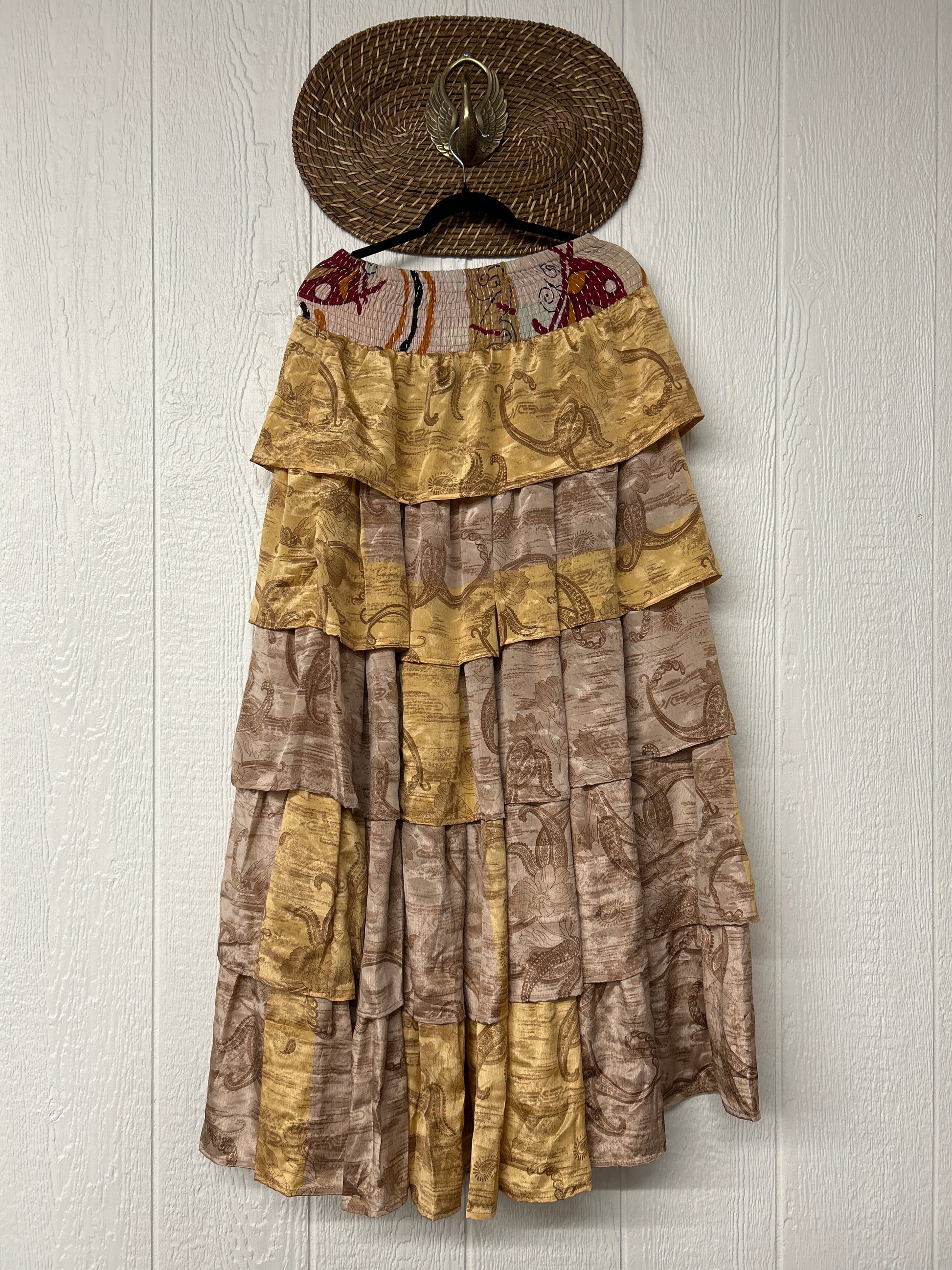Crafted from vintage rasgulla sari, this ethereal piece features a stretchy ruffle waistband, a tiered floaty ruffle skirt.